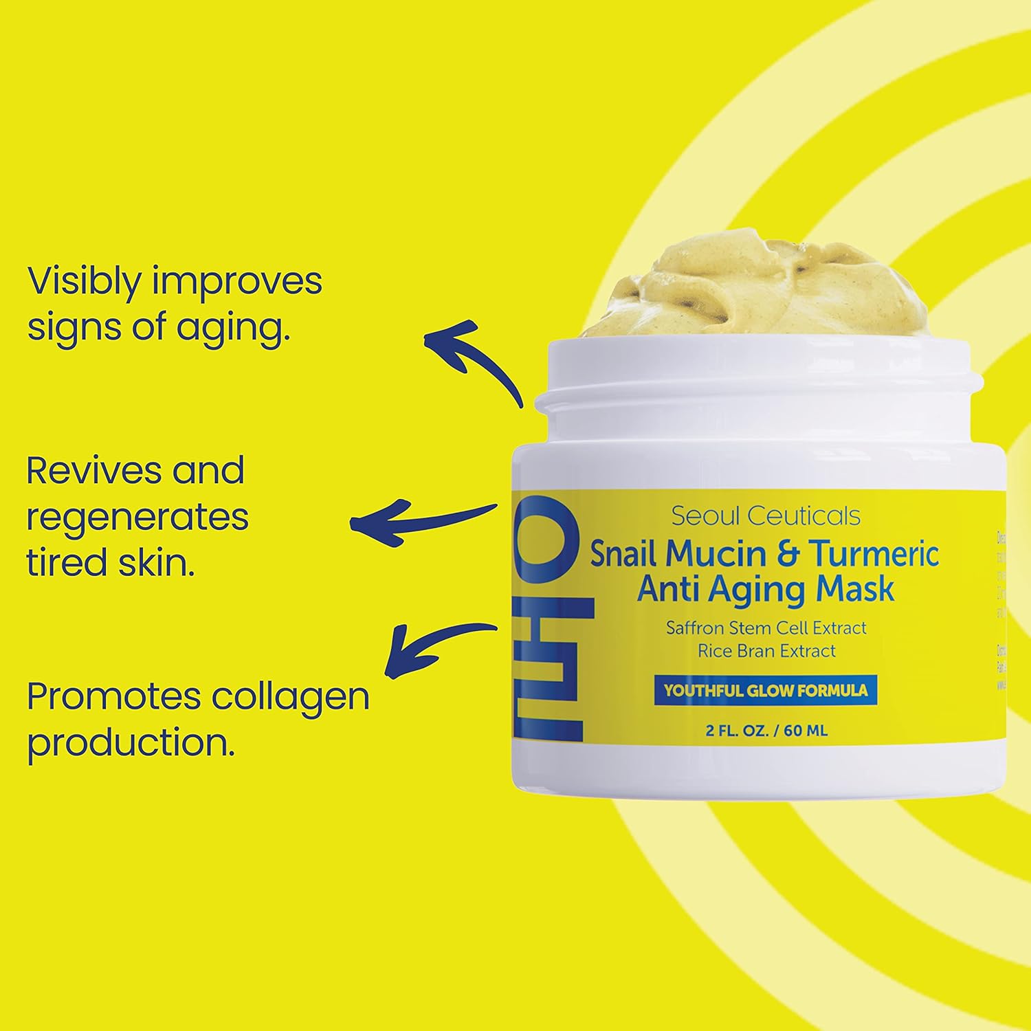 - TAKE ANTI AGING SKINCARE to the next level with this moisturizing face mask skincare. Formulated with a powerful combination of Snail Mucin + Turmeric to restore glow while protecting skin from future damage
