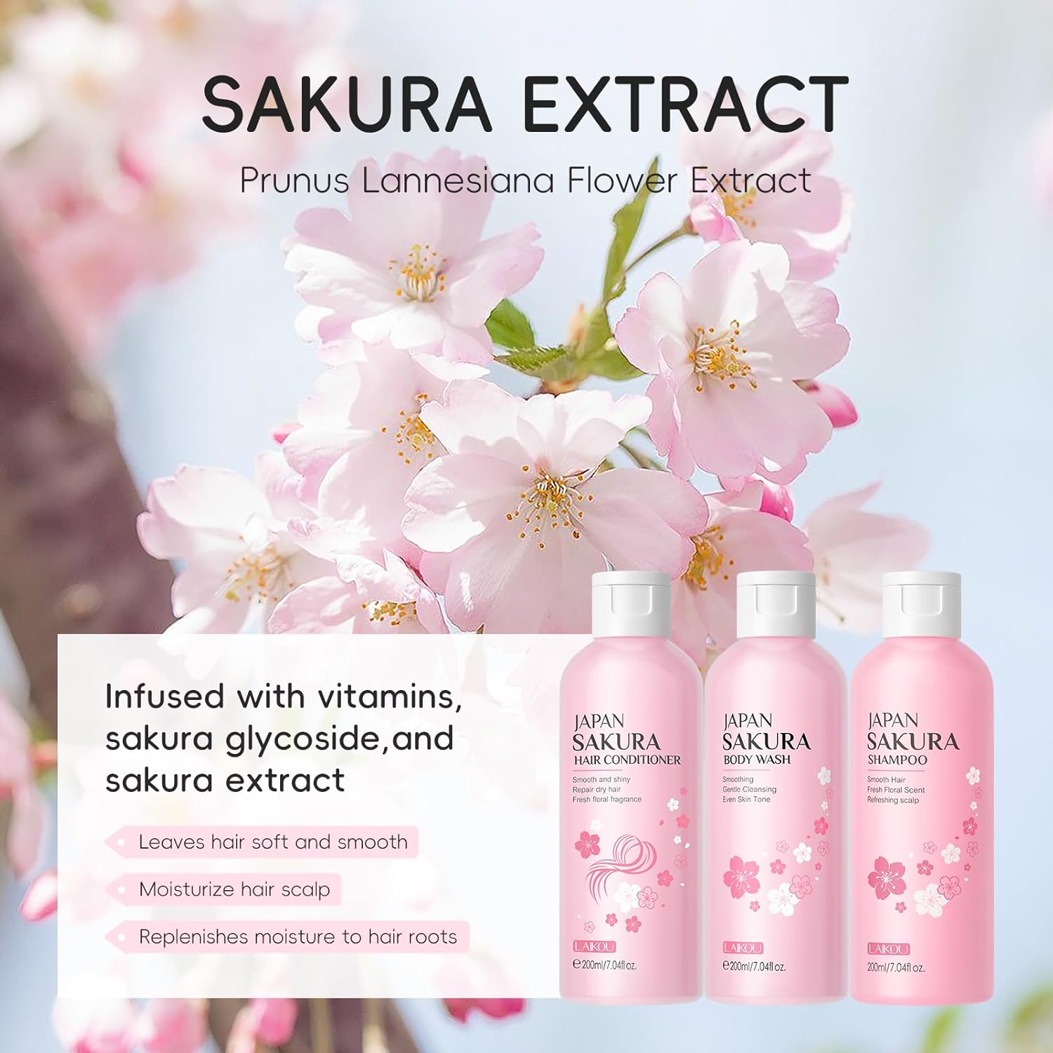 - 【LAIKOU JAPAN SAKURA Shampoo Conditioner Body Wash Set】 Shampoo conditioner includes: One 200ml shampoo, one 200ml hair conditioner and one 200ml body wash. Plus a mini travel set (50ml each), perfect for both home and travel.