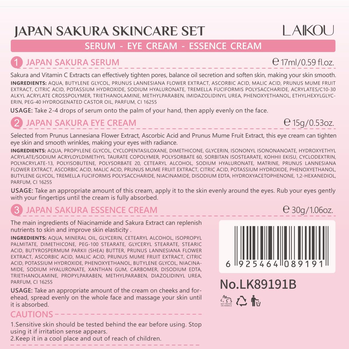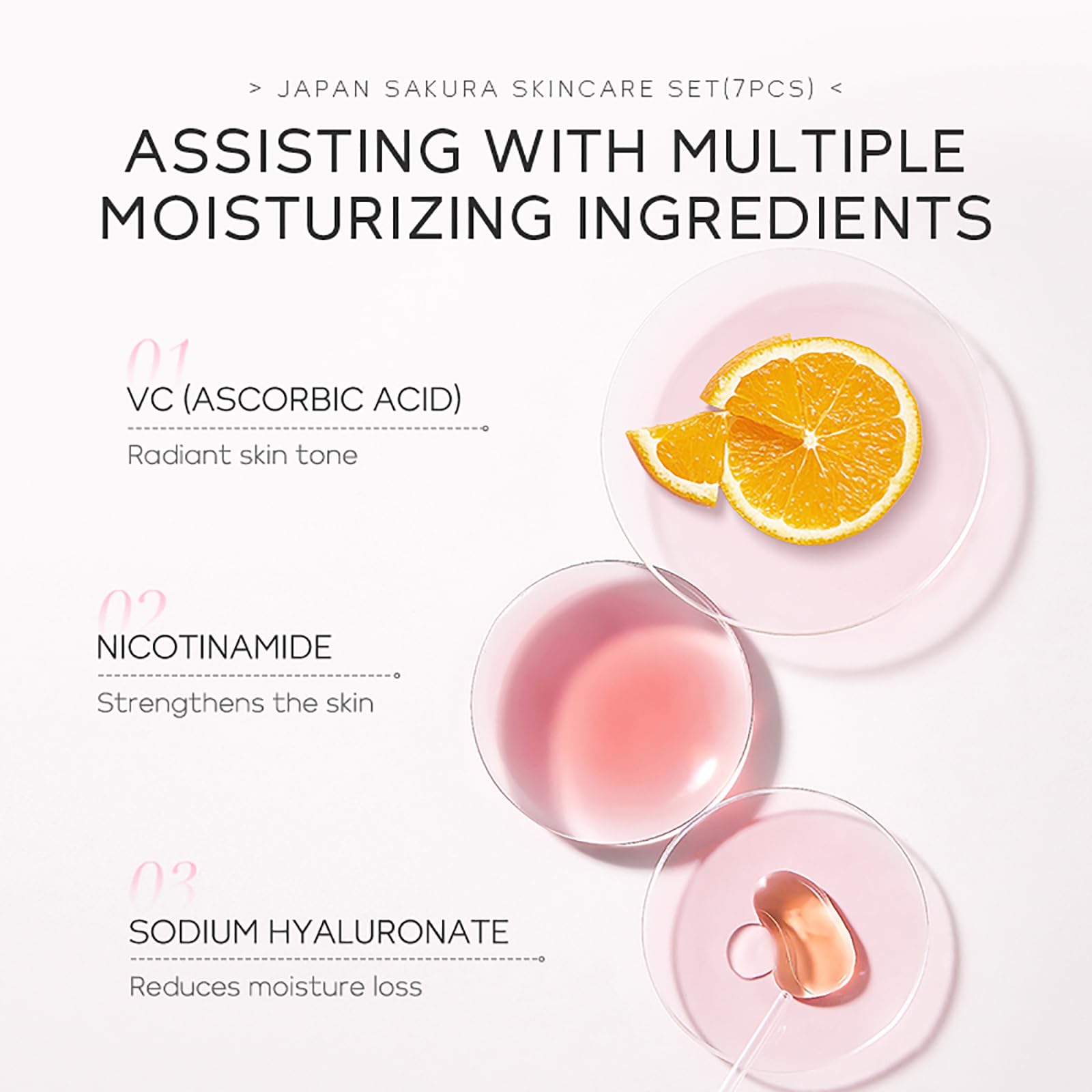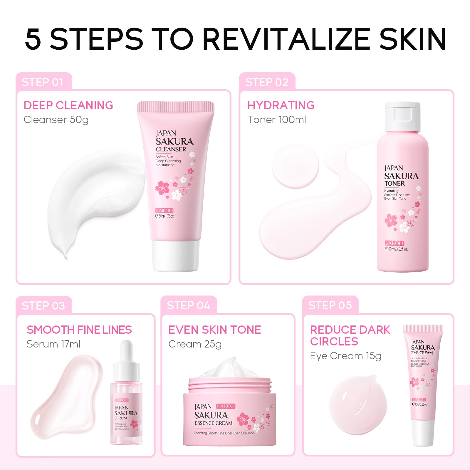 - Cleans & Nourishes Skin: Toiletries travel kit is infused with cherry blossom extract. First, use cherry blossom cleanser to clean the face; and then use toner, lotion, serum, face cream to moisturize dry skin; thirdly, use eye cream to smooth fine lines around the eyes so that you can glow healthier; finally, use make up primer to create a natural makeup looking