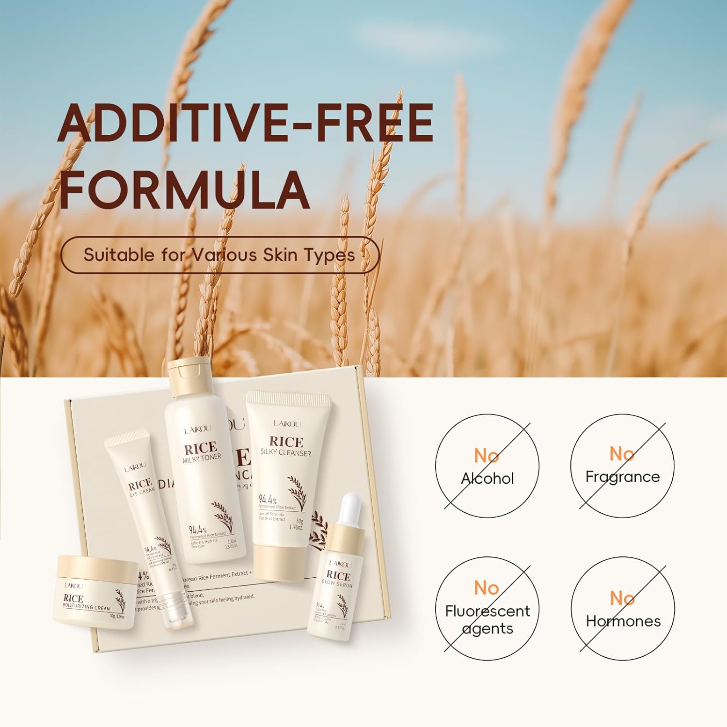 - 【Face Routine Set for Women】LAIKOU rice radiance skin care kits offers a complete skincare routine with a full range of essentials, including silky cleanser, milky toner, glow serum, eye cream, and moisturizing cream. This set helps rejuvenate your skin, leaving it fresh and vibrant. It helps the skin retain moisture