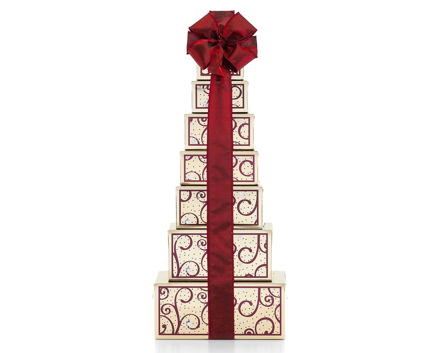 This Chocolate and Sweets gift tower makes it easy to send your best wishes. Pirouline chocolate hazelnut wafers, kettle corn, dark chocolate cookies, madeleine cakes, blackberry and raspberry fruit jelly candy, English fudge with sea salt, almond cookies, vanilla caramels and a trio of cakes including cookie butter, lemon and raspberry are neatly packed in a tower of beautifully decorated boxes, finished with a hand-tied bow.