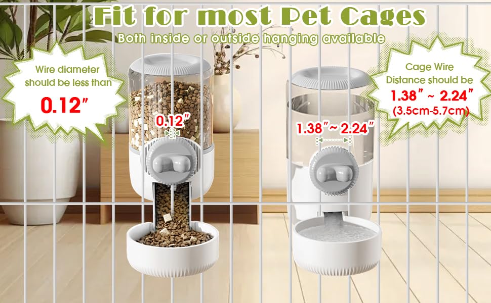 - The automatic cage cat food and water dispenser fit most cages, require 1. Cage Wire Distance should be 1.38”-2.24” (3.5cm-5.7cm); 2. Wire diameter should be less than 0.30cm/0.12”. Please measure your cage before ordering.