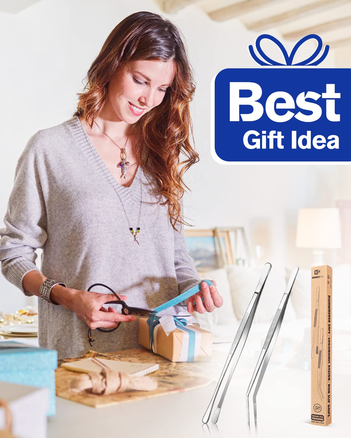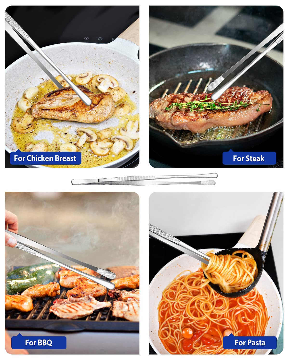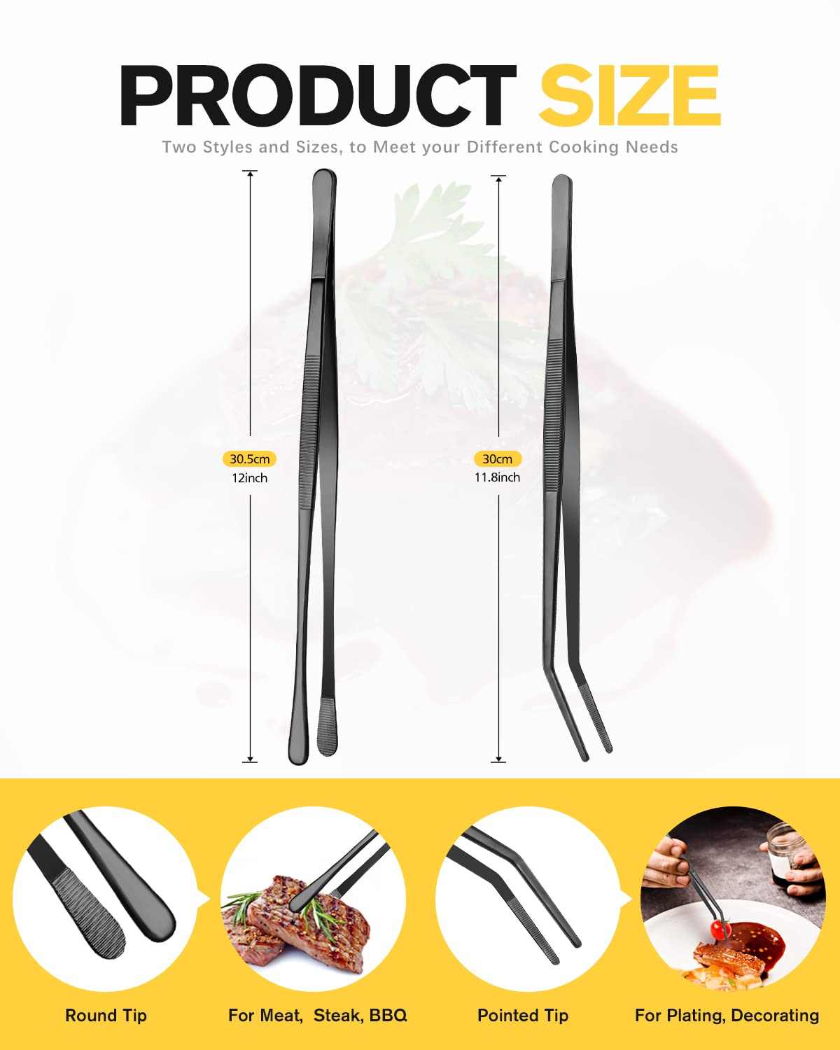 - The Secret Of Professional Chef : This set includes 2 different designs of 12" silver tweezers for your daily needs;They are suitable for plating small and delicate foods like caviar, kernels of corn, pine nuts and cranberries; The long tweezers with round head is perfect for grilling and flipping food in BBQ
