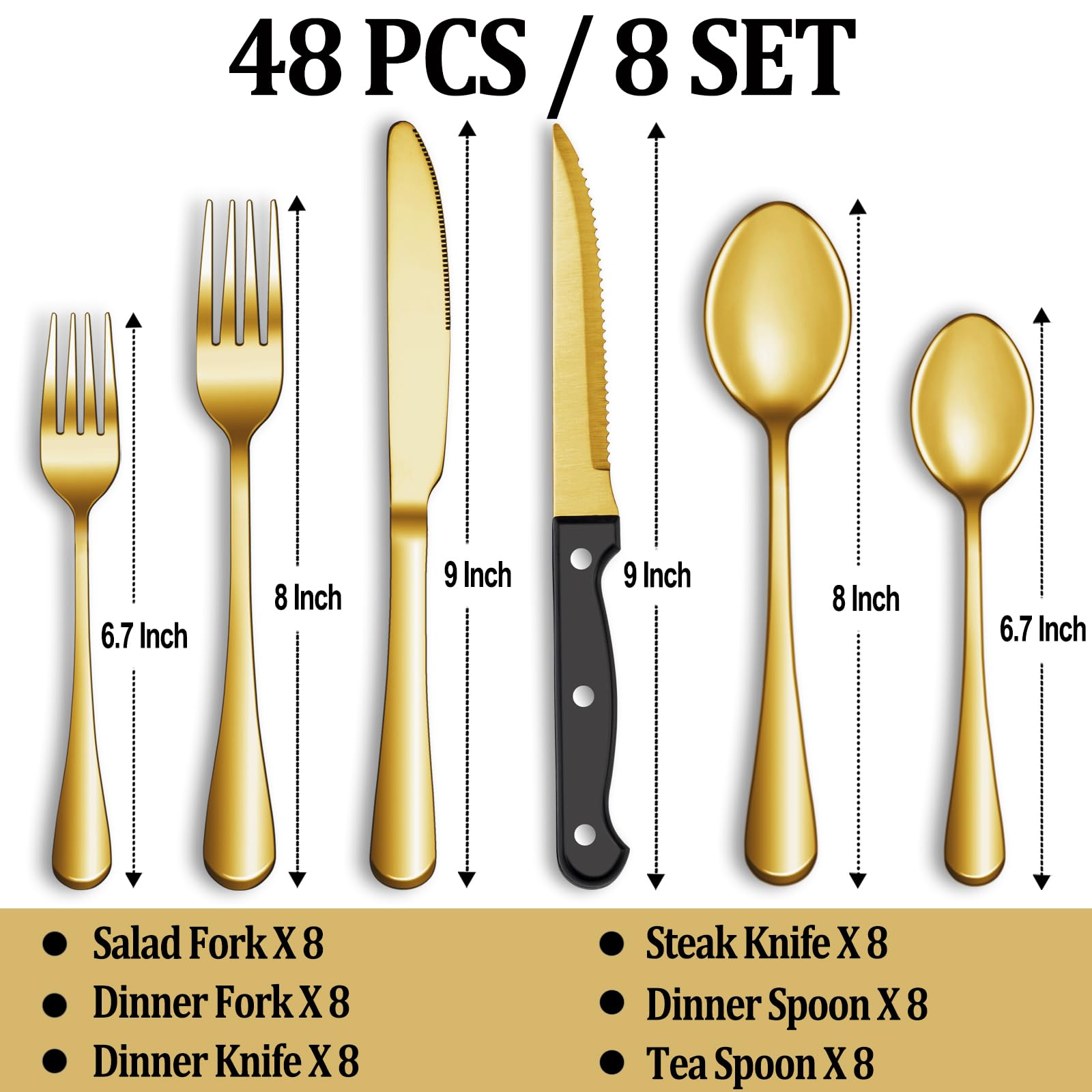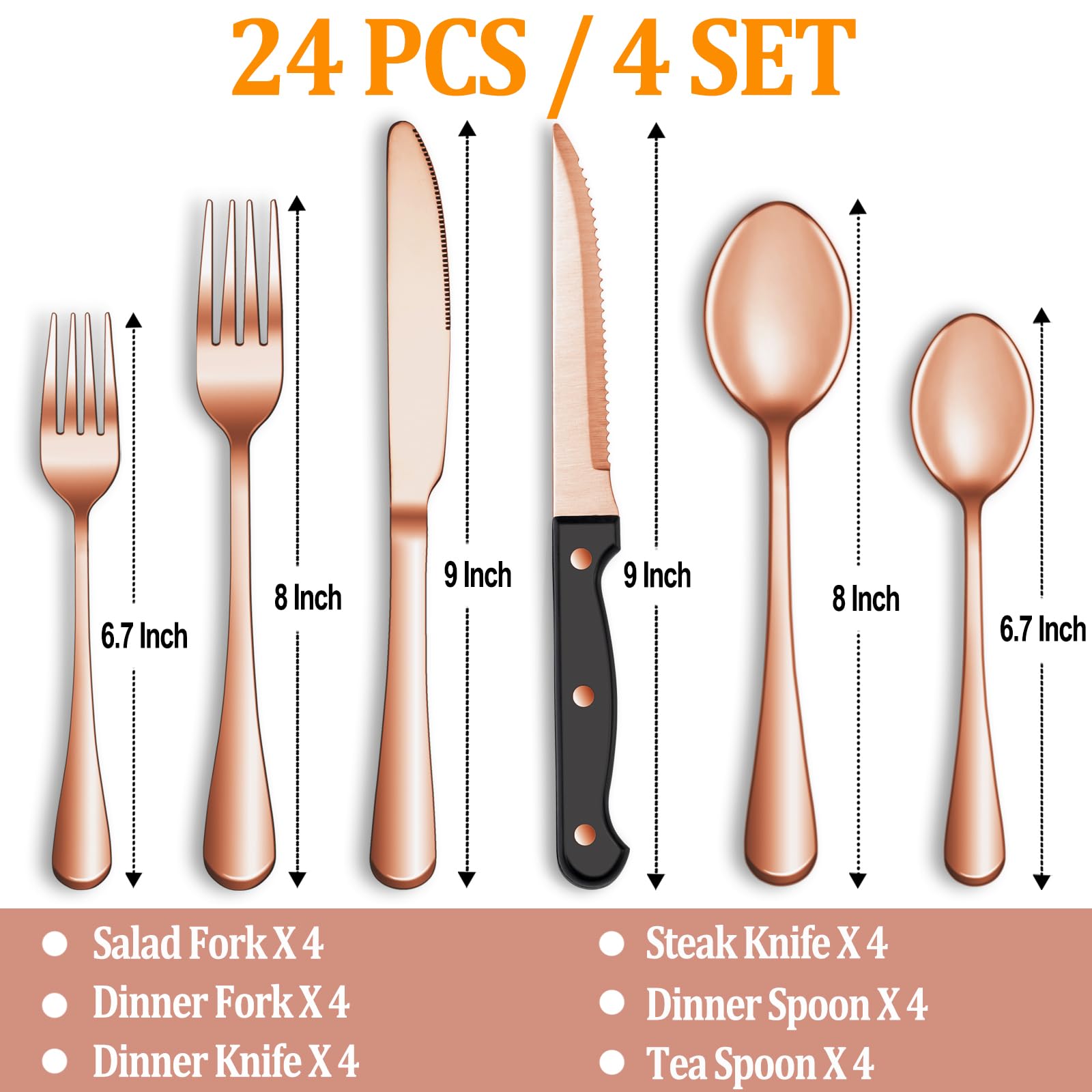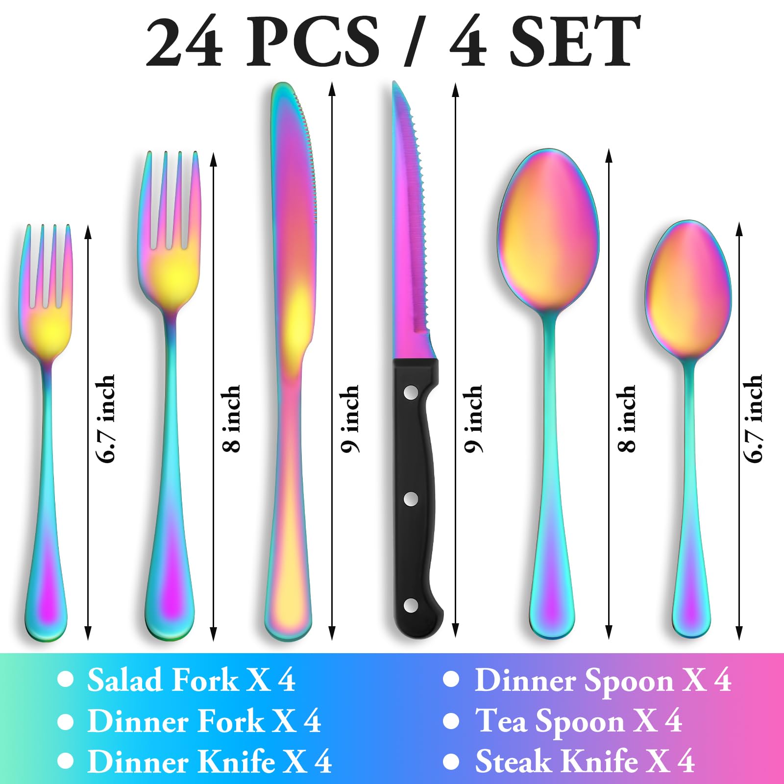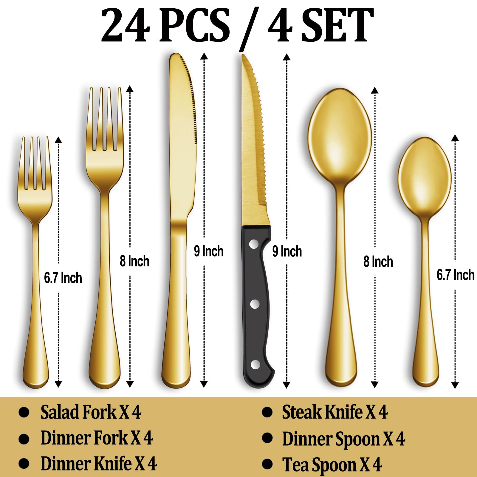 - 24 PCS SILVERWARE SET SERVICE FOR 4: This silverware set comes with 4 Dinner Knife, 4 Steak Knives, 4 Dinner Forks, 4 Dinner Spoons, 4 Salad/Dessert Fork and 4 Dessert/Tea Spoons, essential for families or restaurants. The set is also an irreplaceable dining tool whether it is for daily use or for preparing dinners or parties.