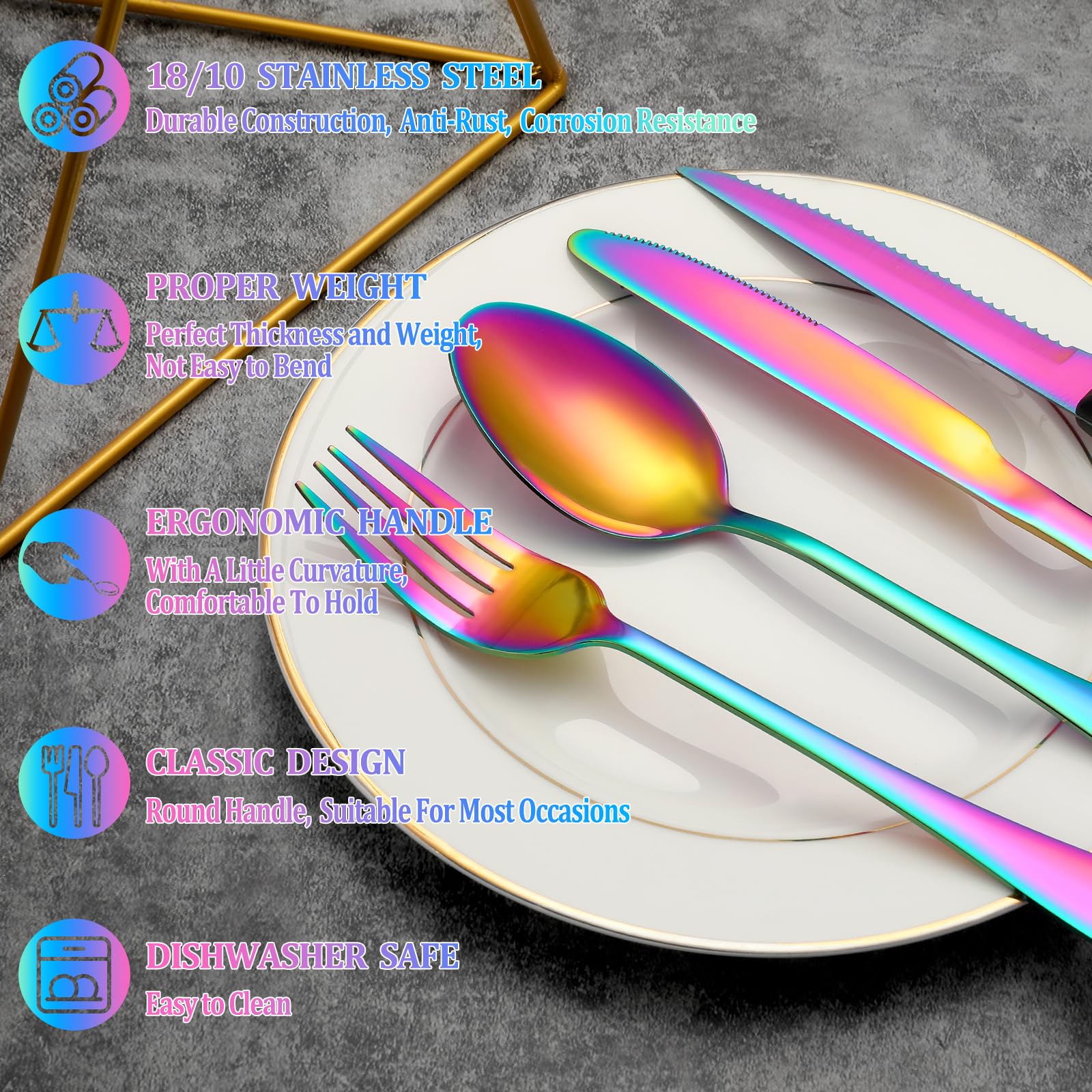 - PREMIUM STAINLESS STEEL: This flatware set is made of high quality food grade stainless steel which is very durable, rust-proof, corrosion resistant, non-toxic, BPA free, no metal aftertaste. Meanwhile, its sturdiness ensures that it will not bend easily providing you with long - term use. Most importantly, they're dishwasher safe.