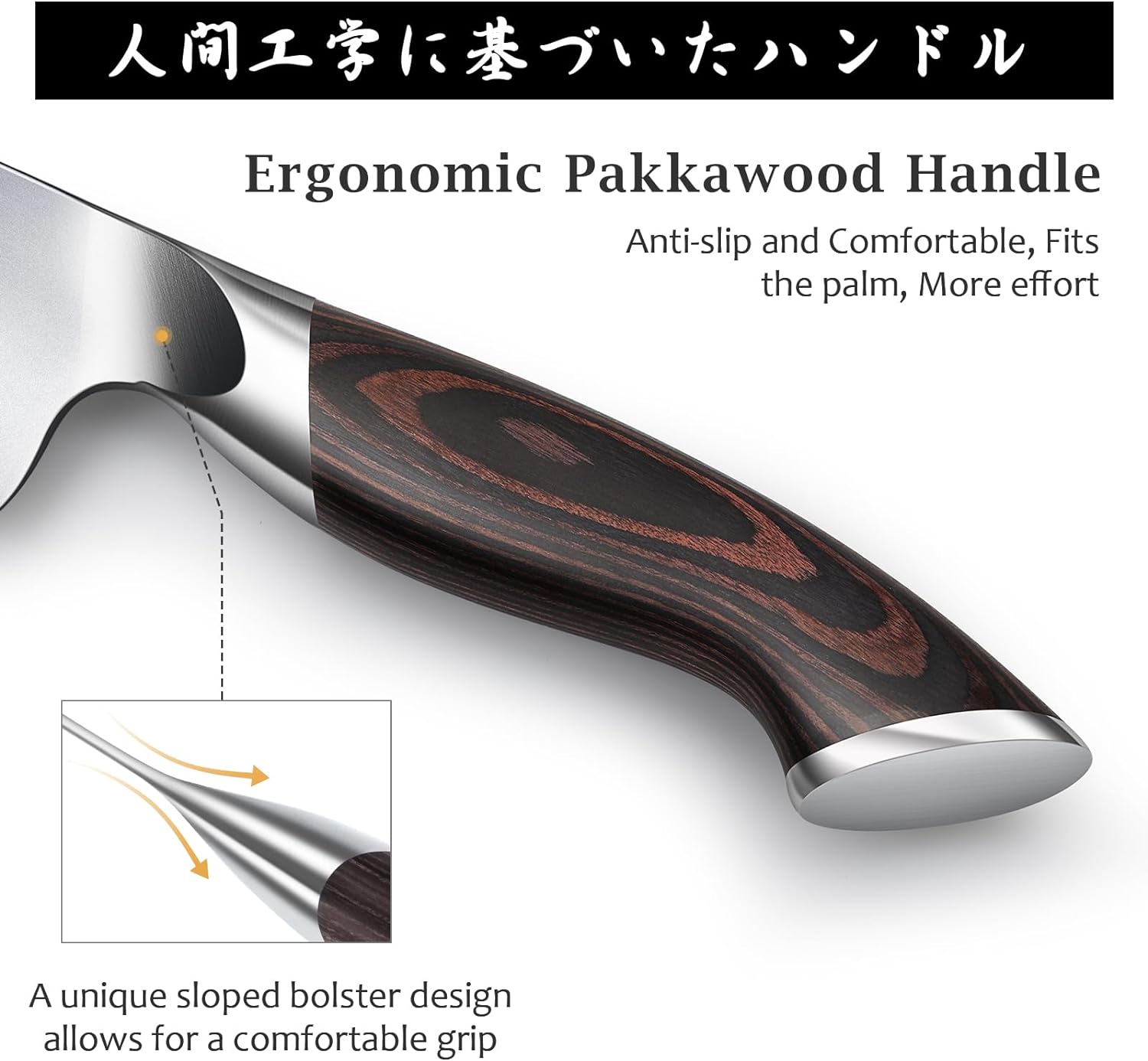 - 【Ergonomic Handle】The ergonomic shape can adapt to the natural holding posture of the human hand, perfectly balancing the weight of the handle and blade, reducing fatigue caused by long-term use. The pakkawood handle blends with the sharp blade for a comfortable grip.