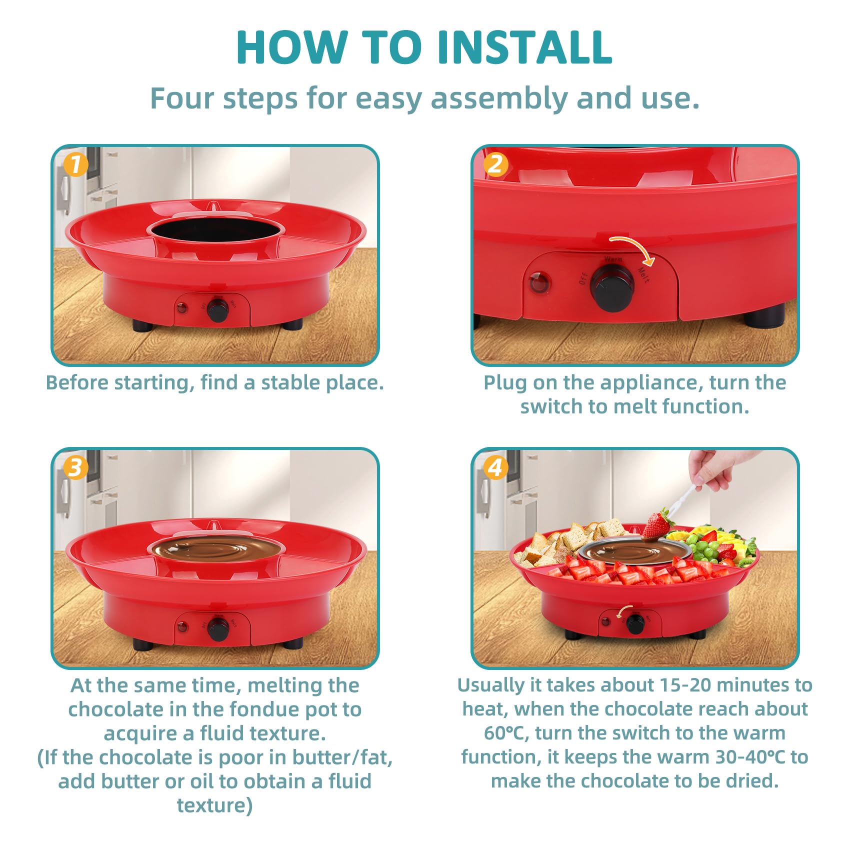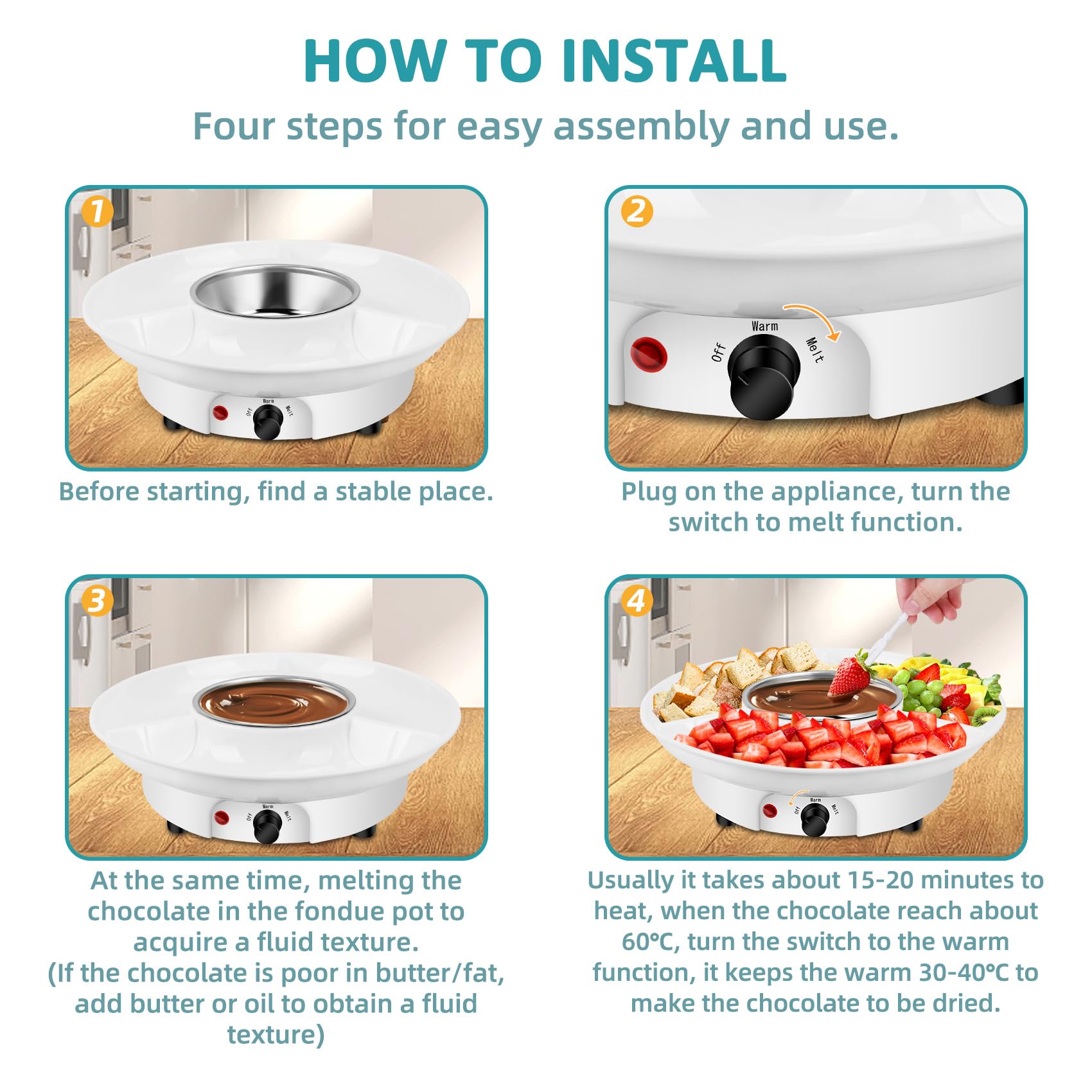 - What You Can Get - 1 x Stainless Steel Pan, 1 x Food Grade Serving Tray, 1 x Electric Heater, (all of the these three parts assembled into one chocolate melting machine), 1 x Instruction Manual, 10 x Plastic Stick(useful to fork desserts to dip chocolate).
