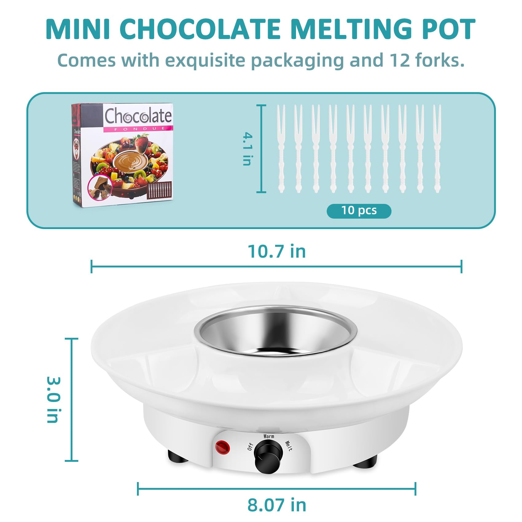 - Detachable MINI Melting Pot - Convenient to make your own DIY chocolate, it can melt chocolate, butter or hot milk. It is easy to assemble and disassemble the chocolate melting machine, super easy to setup and cleanup, comes with removable serving tray, very convenient to use and saving a lot of space.