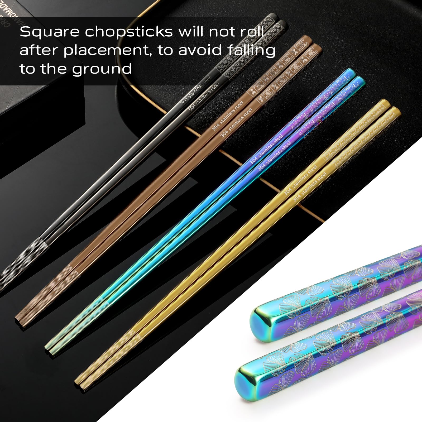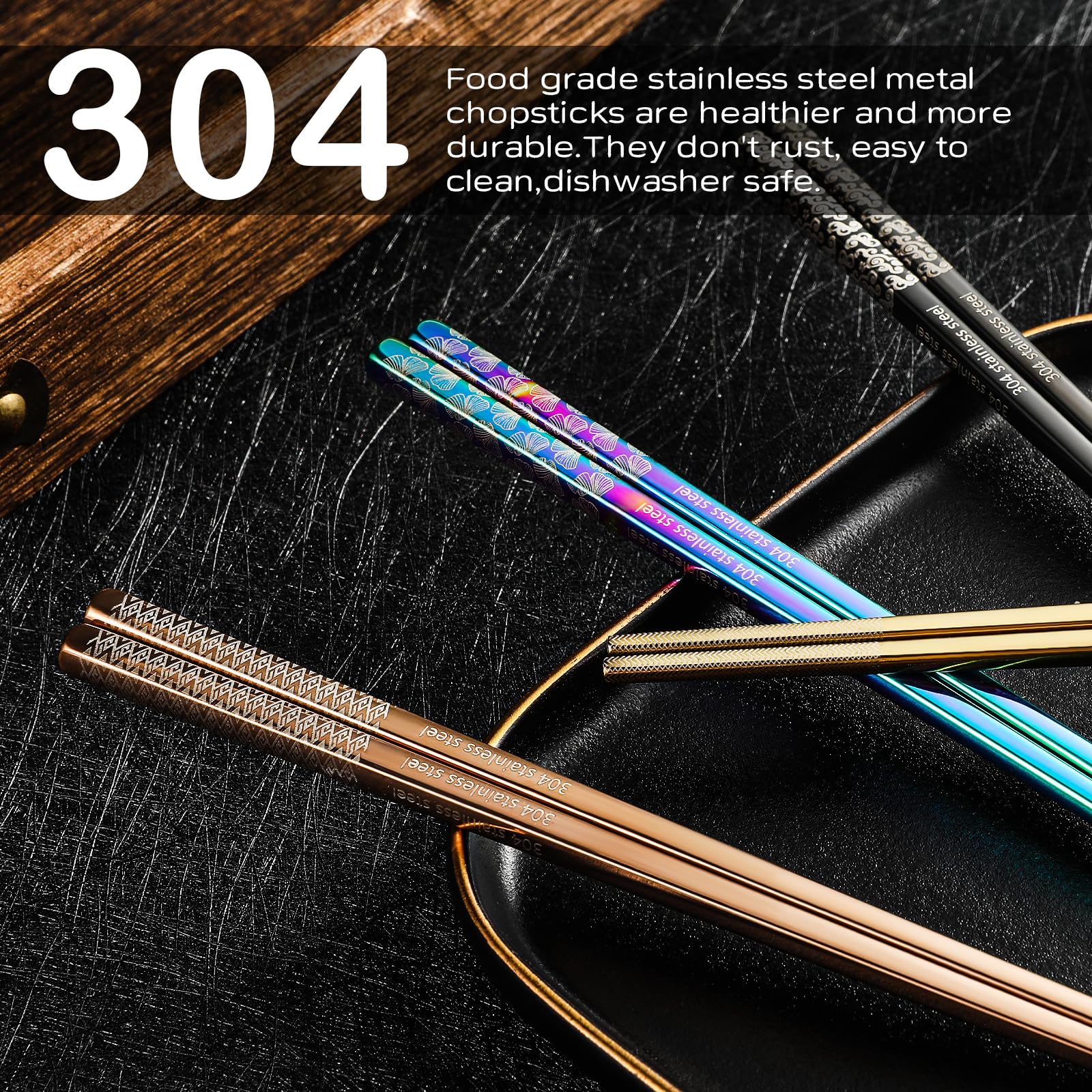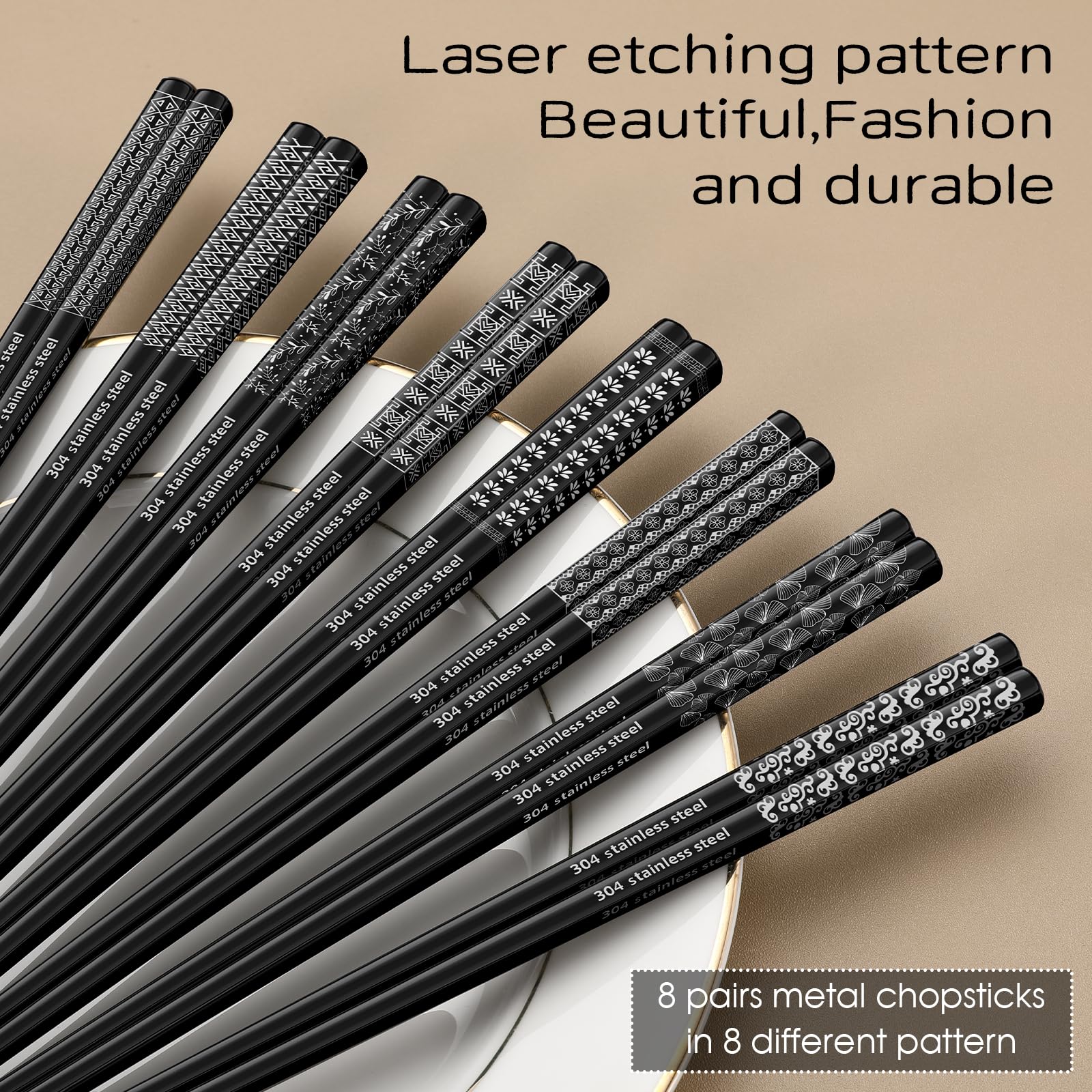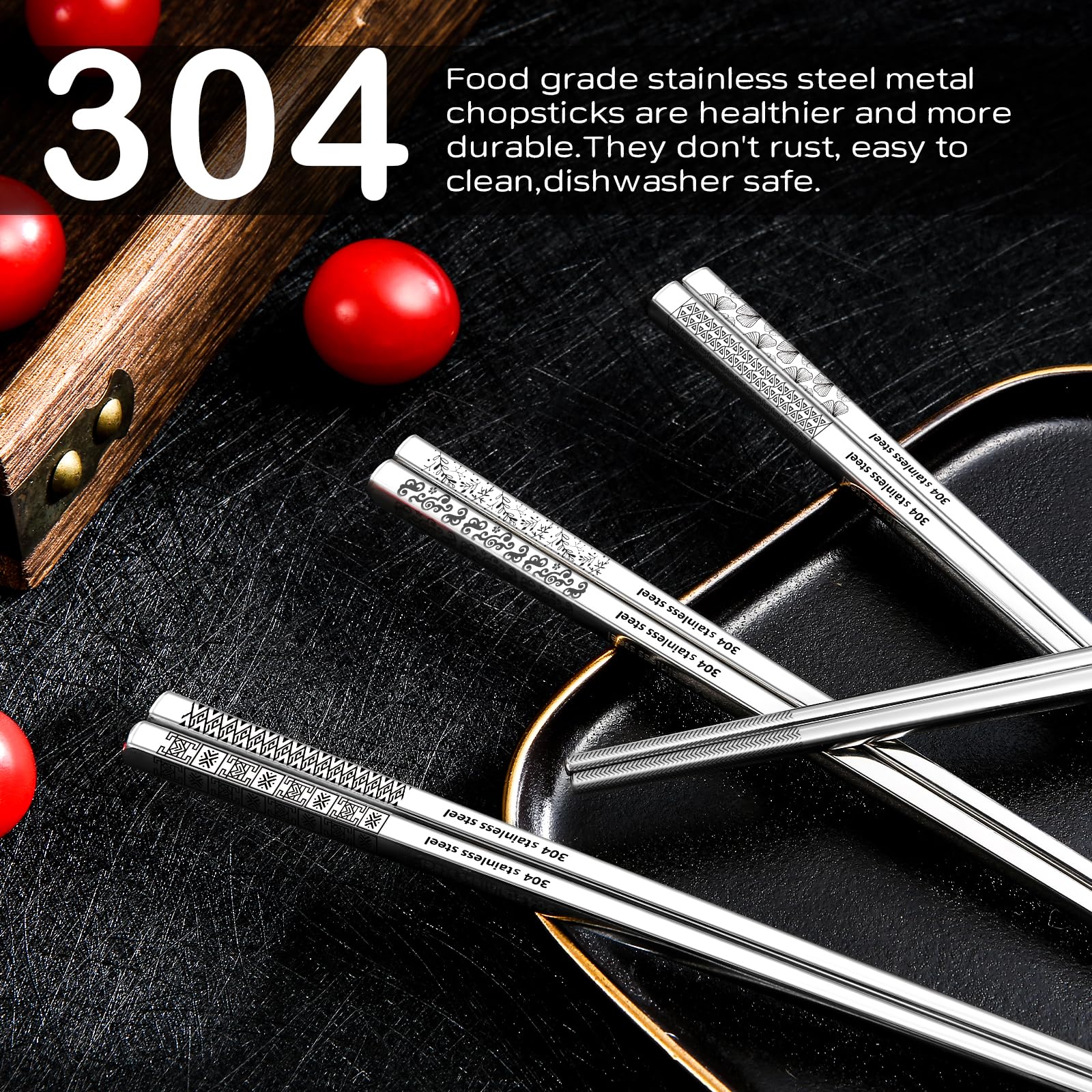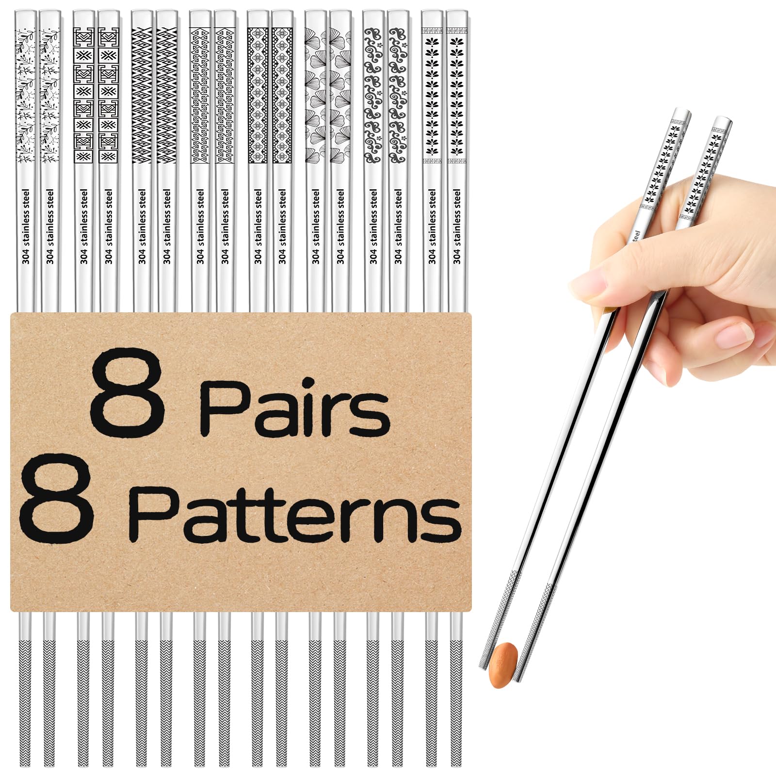 - 8 Pairs Metal Chopsticks With 8 Patterns: Our metal chopsticks set contain 8 pairs metal chopsticks with 8 different patterns. The patterns are etched by laser, which makes them not fade, not wear, beautiful and durable. The metal chopsticks are made of 304 stainless steel, which make them healthy and durable. Our 8 pairs metal chopsticks set are a better choice than the similar 5 pairs metal chopsticks set.