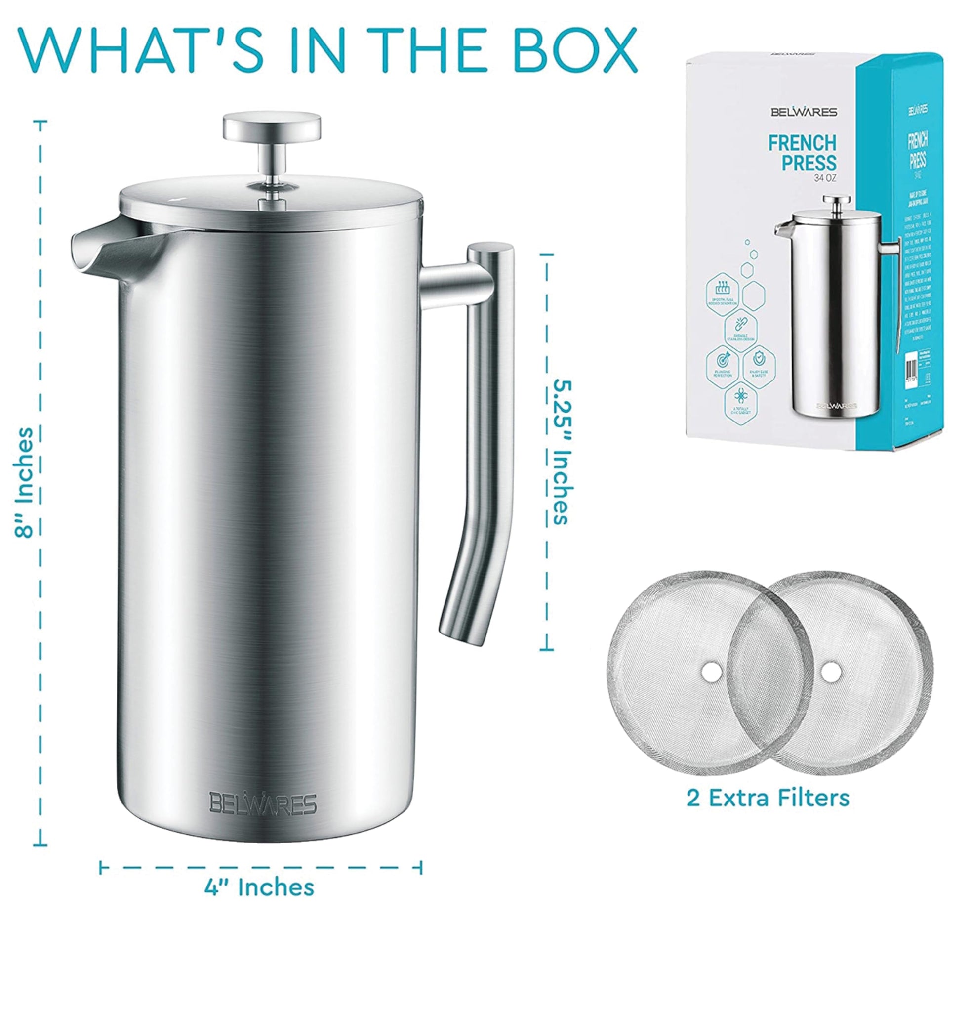 • WHY PURCHASE THIS FRENCH PRESS - Other than the affordable price, this is easy to use & easy to clean, comes with 2 extra filters & a clear user manual. Choose Belwares with confidence & get a 1-year Warranty!