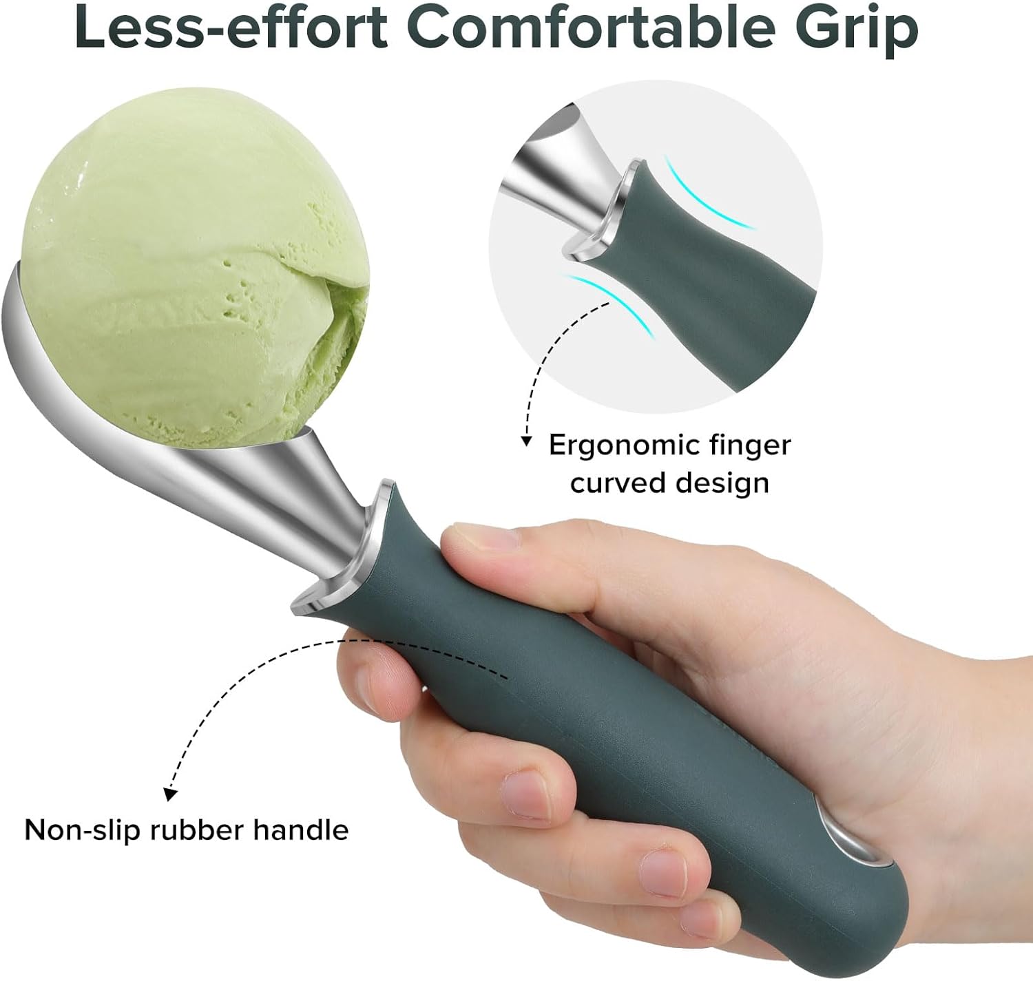 - Easy to Dig & Easy to Shape - The edges of the ice cream scoop are finely polished to make sure that the moment the scoop goes into the ice cream is easy and silky. The depth and curvature of the ice cream scoop are adjusted according to common scooping habits, simply following the curvature of the scoop can efficiently create well-shaped ice cream.