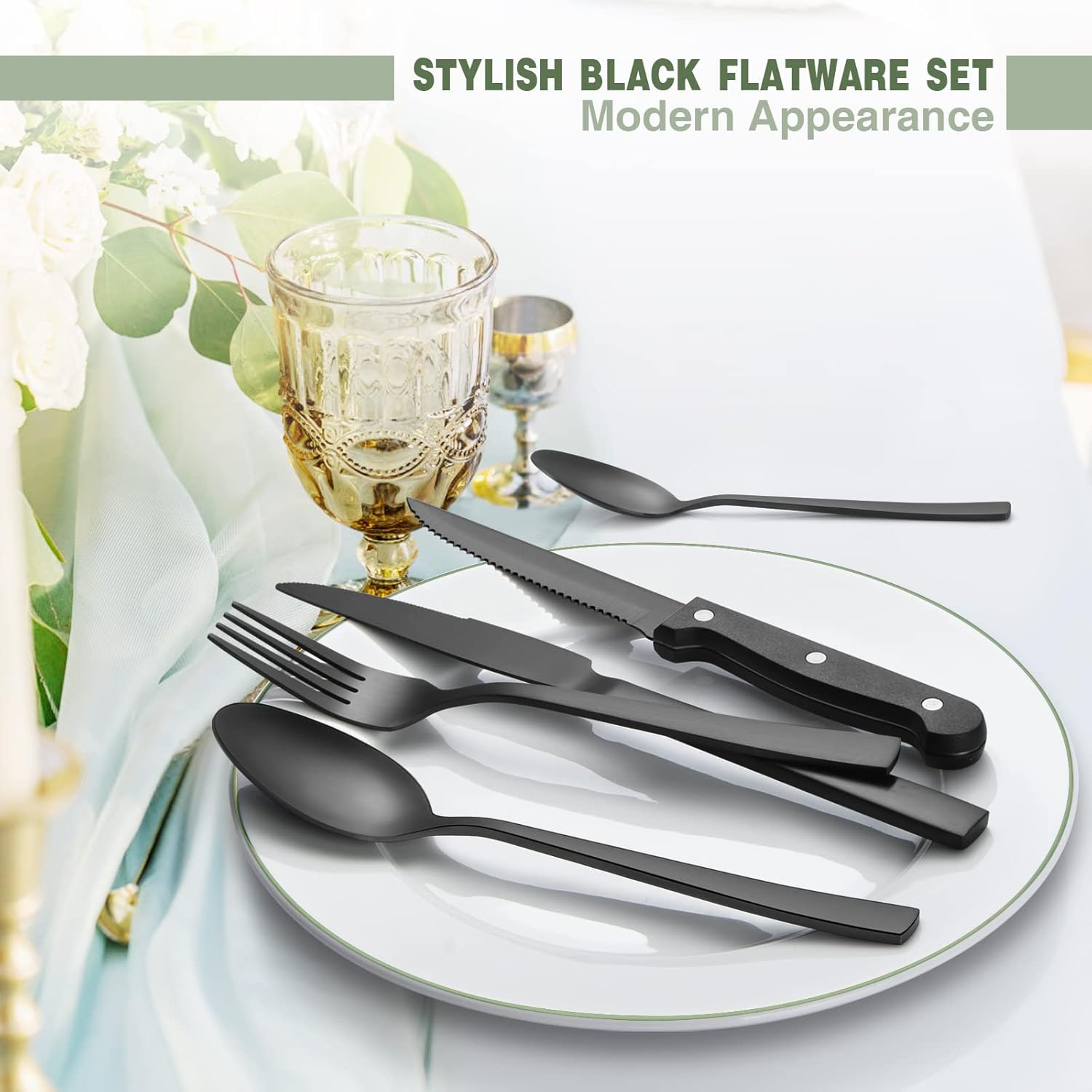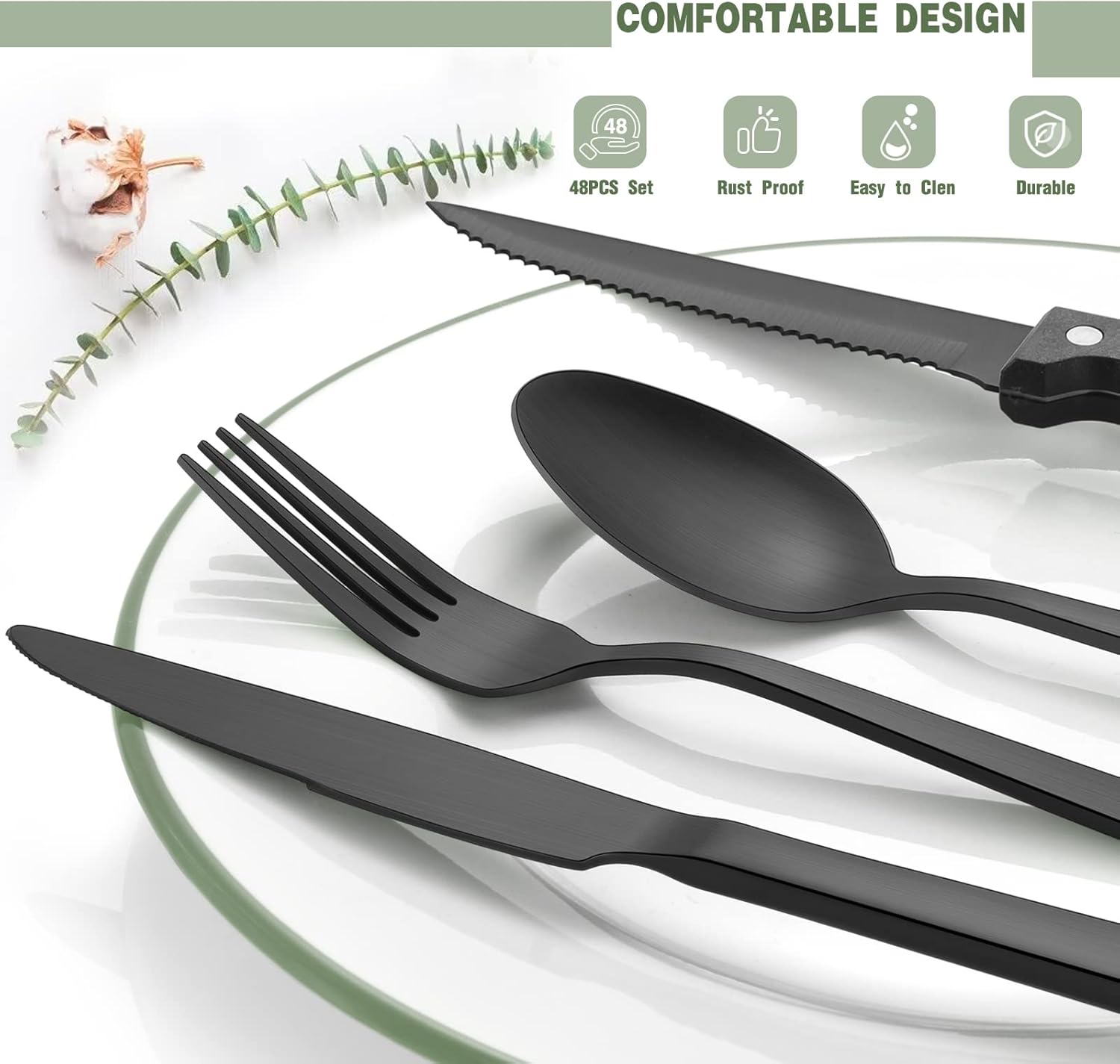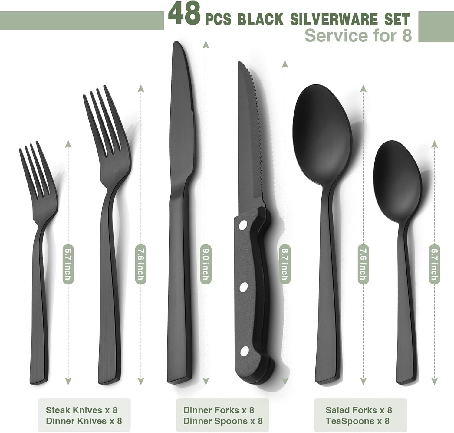 - 48 PIECES SILVERWARE SET FOR 8 This black silverware set includes 8 dinner forks, 8 salad forks, 8 dinner knives, 8 dinner spoons, 8 teaspoons and 8 steak knives. It is a necessary choice for family of 8 people or as a reserve for some to-hold parties or weekday dinner. Please take proper care of these tableware so that it can be used for a long time. For example, it is recommended to wash your hands first and dry them before storage. Do not use wire brush or any other hard material cleaning tool to clean, so as not to damage the silver