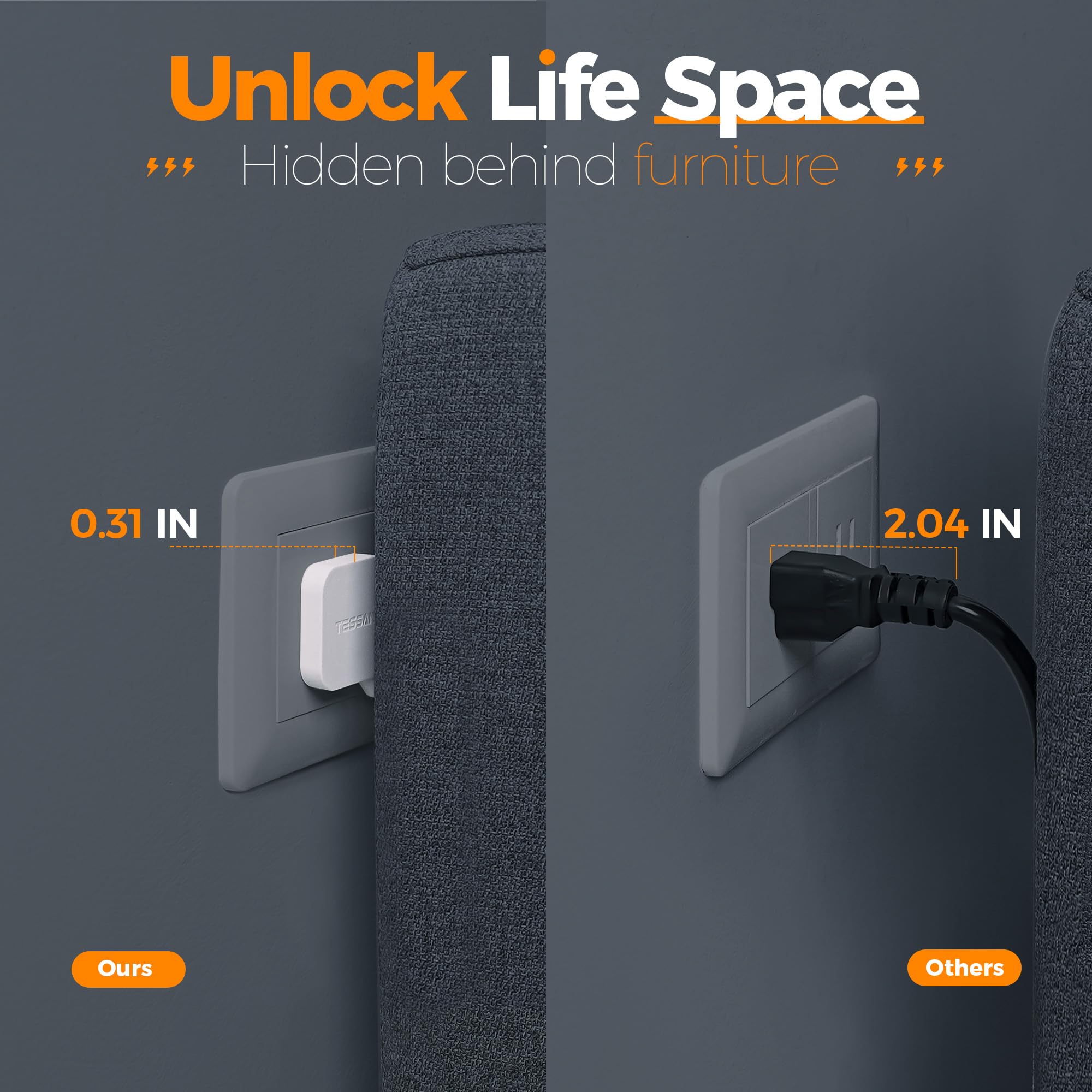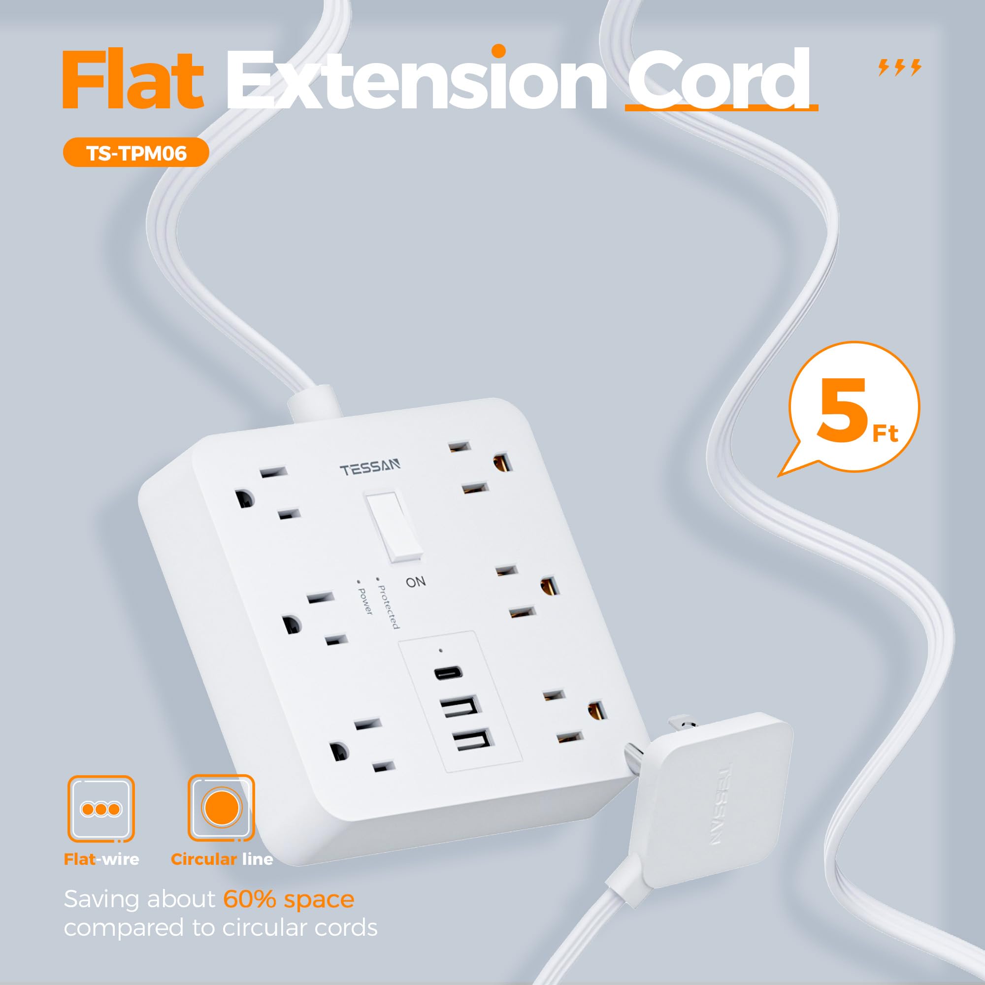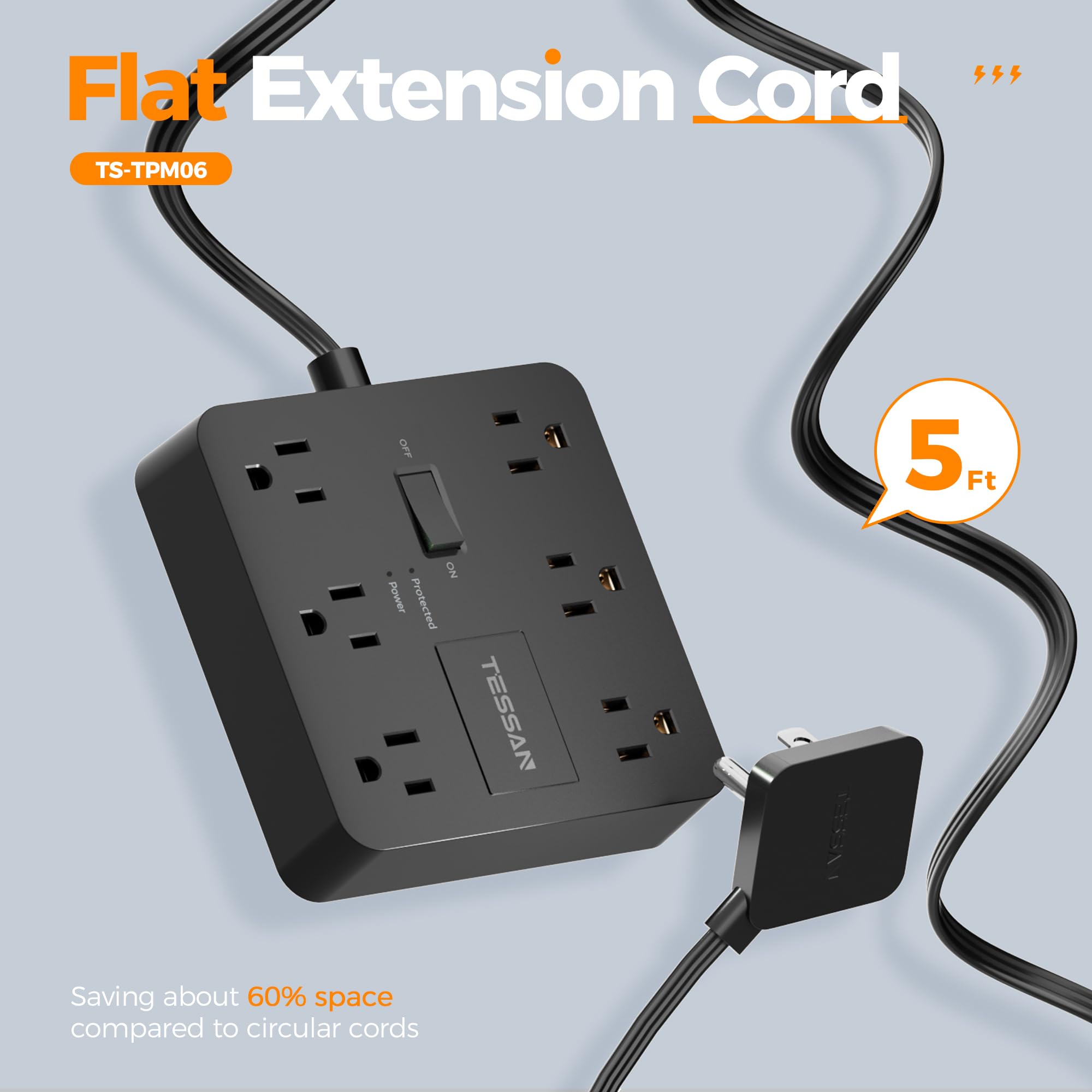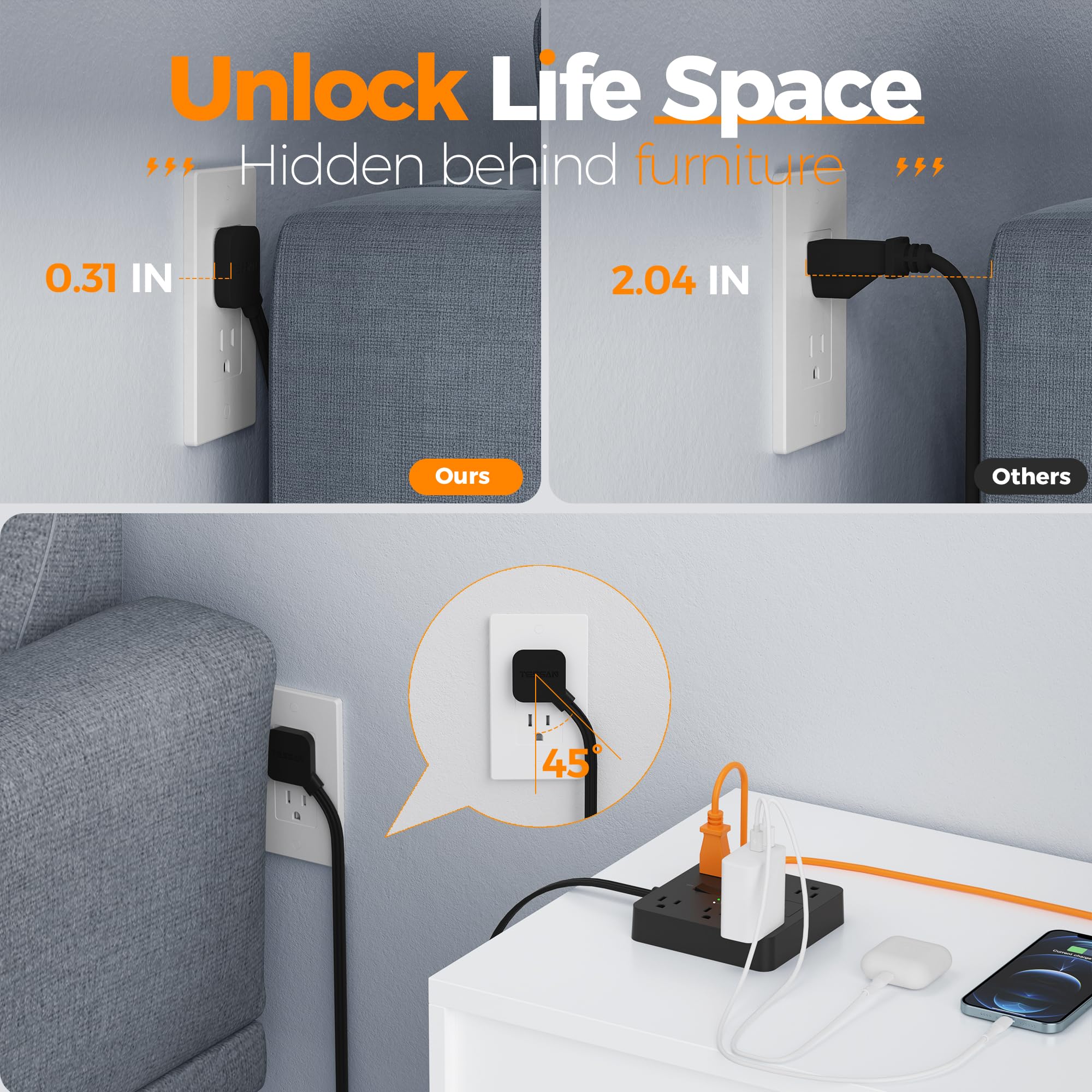 - Flat Black Extension Cord: With only 0.35 in ultra thin flat head design, flat power strip can easily fit in tight spots and hide behind sofa, bed, nightstand or other furniture, sitting flush against the wall; 45° right angle design create an extra space for other plug below without blocking
