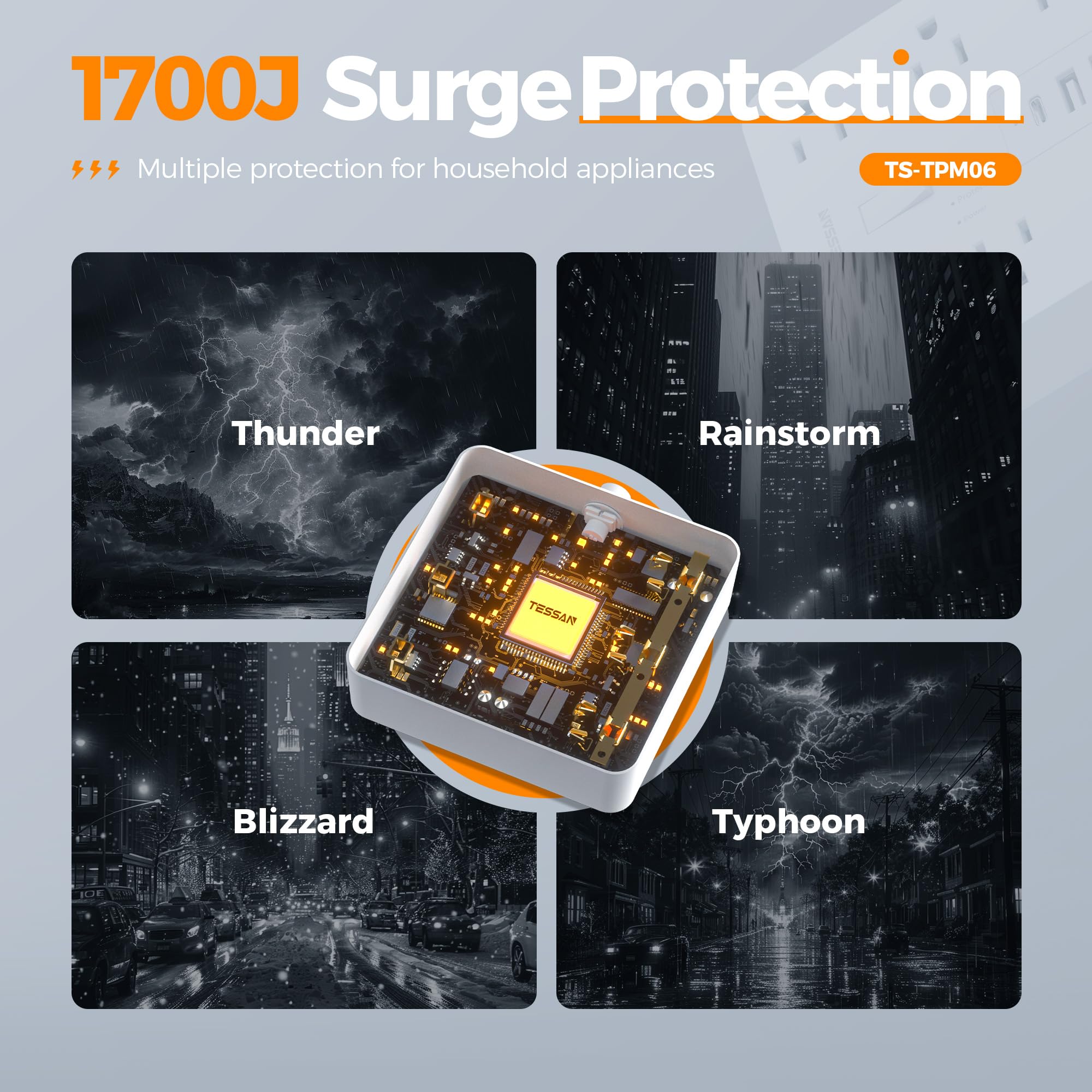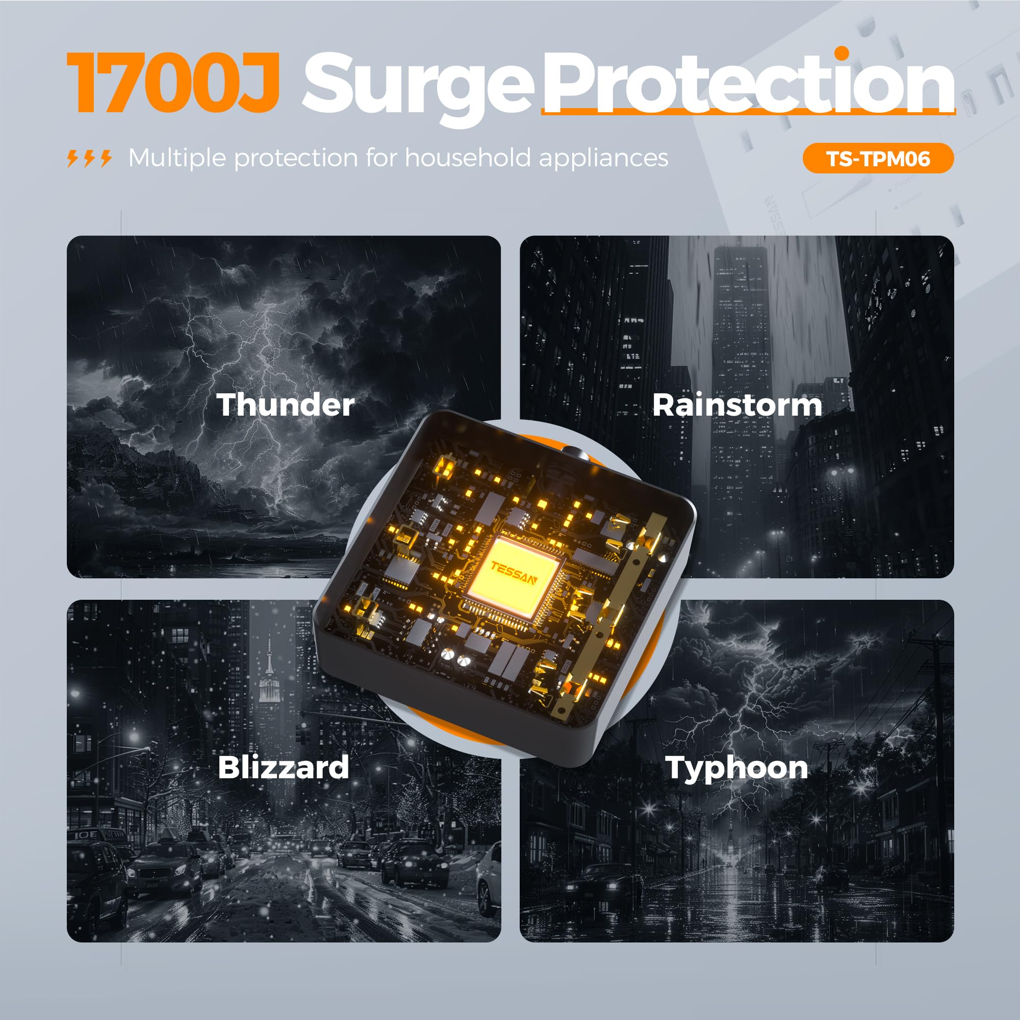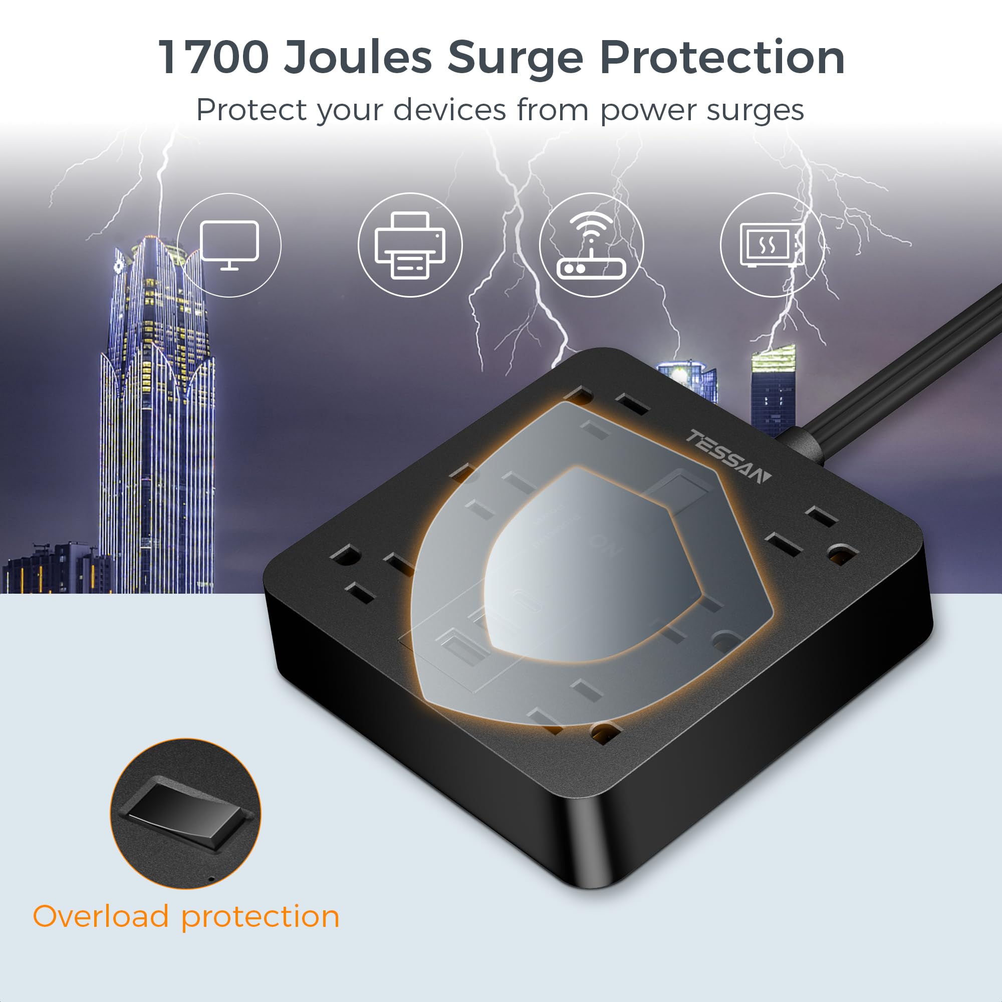 - 1700J Surge Protector Outlet: Equipped with overload protection, short-circuit protection, over-current protection, and etc; Reliable on/ off switch can automatically shut off and protect your expensive electronics, providing you with a safe and reliable charging environment