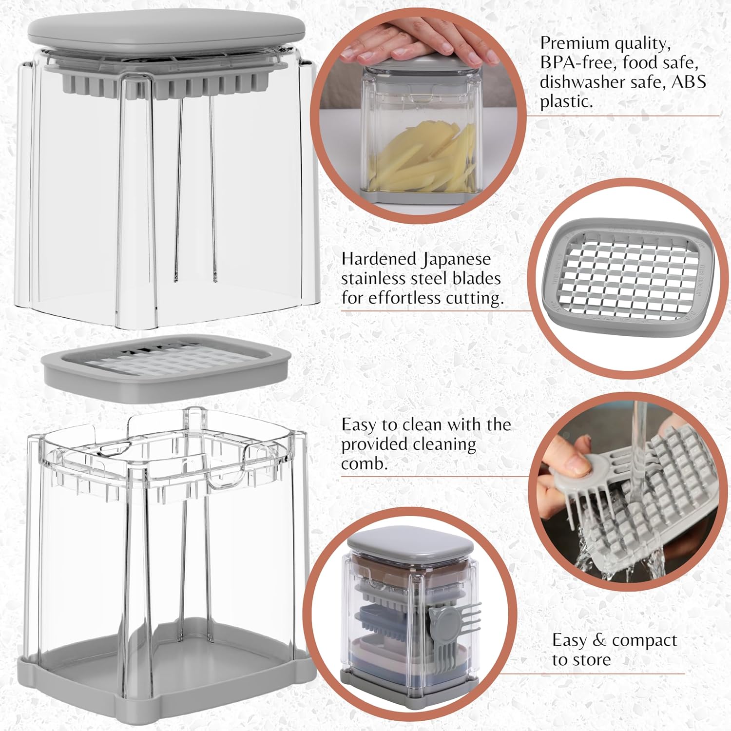 • šŸ„• User-Friendly & Safe Food Chopper: Chop like a pro with our easy push-down mechanism! Just place your chosen ingredient on the blade and press down for instant, uniform cuts. The clear inner and outer boxes allow you to see the progress while chopping. This chopper is a great addition to any kitchen. It is perfect as a shoestring fry cutter to prepare chips & French fries, as a vegetable chopper cutter to make salads, stir fries, soups, or as a fruit slicer to cut fruits for your lunchbox.