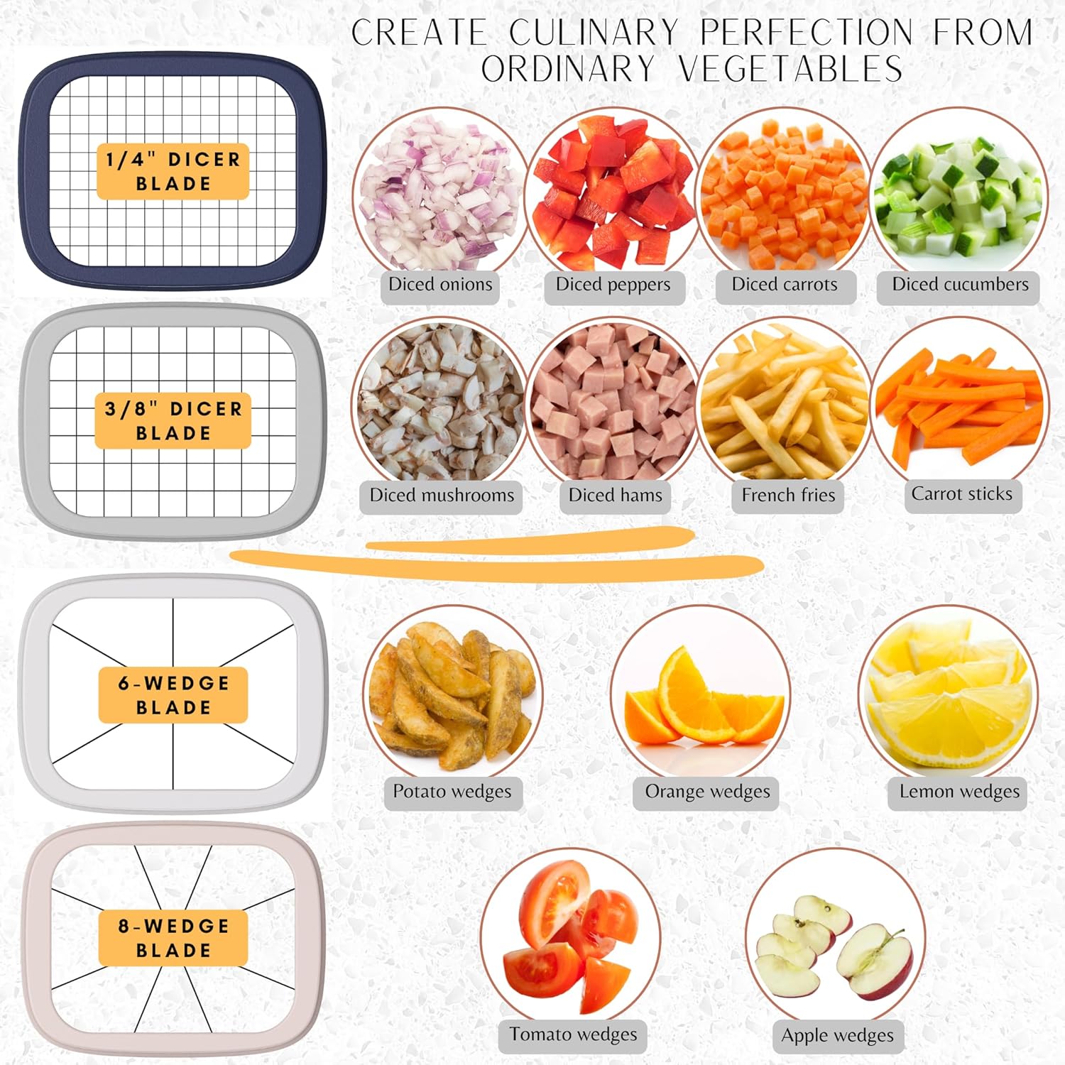 • šŸ”Ŗ Versatile & Durable Blades: Our vegetable cutter includes 4 rust-resistant Japanese 420-grade stainless steel blades (1/4", 3/8", 6-wedge, 8-wedge) to handle many chopping needs. Perfect for use as a potato and vegetable slicer, fruit slicer, veggie dicer cutter and chopper, onion chopper, and egg slicer, the high-quality blades maintain their sharpness over time. The chopper holds up to 3.5 US cups (825 ml) of prepped ingredients, ensuring you can prepare large quantities swiftly and safely.
