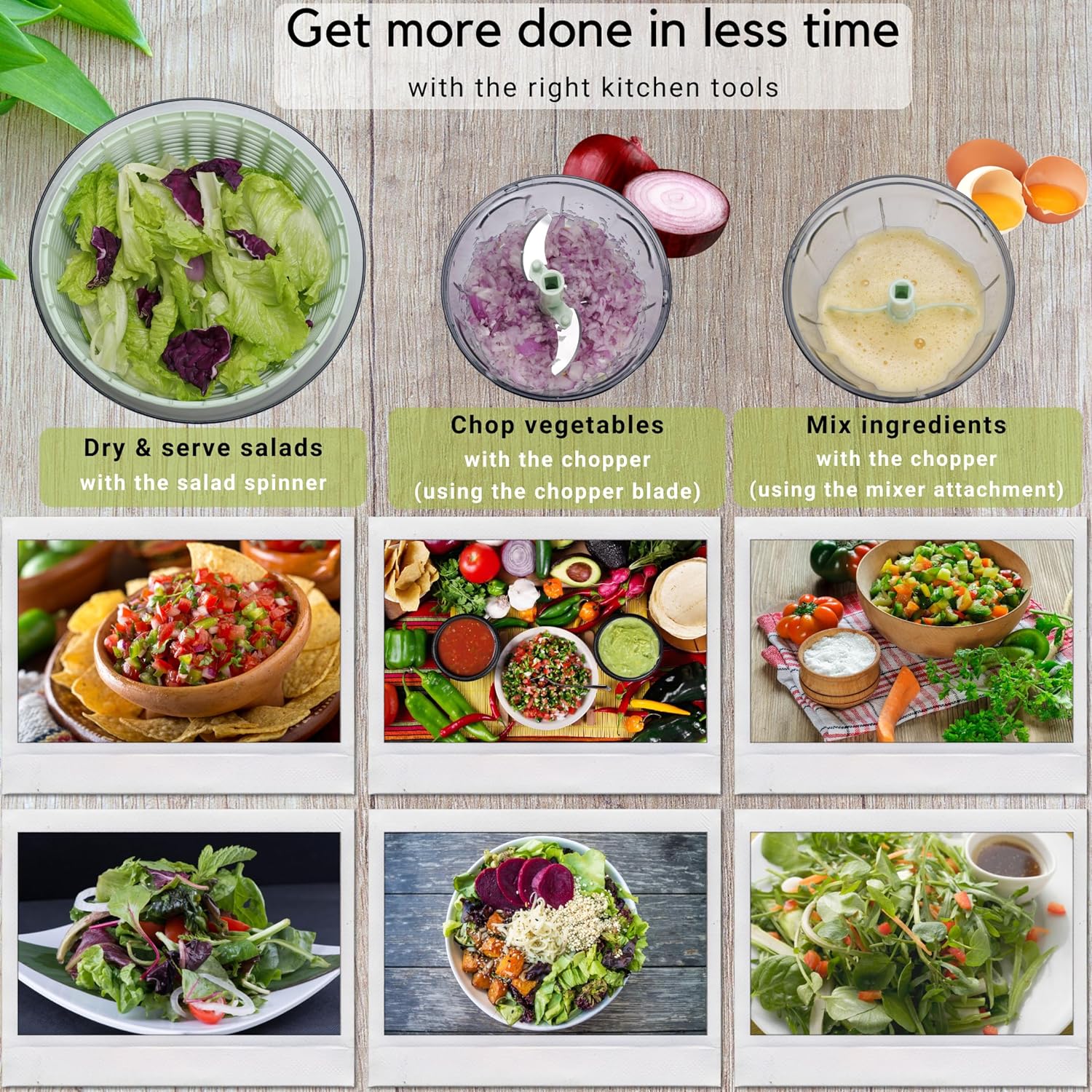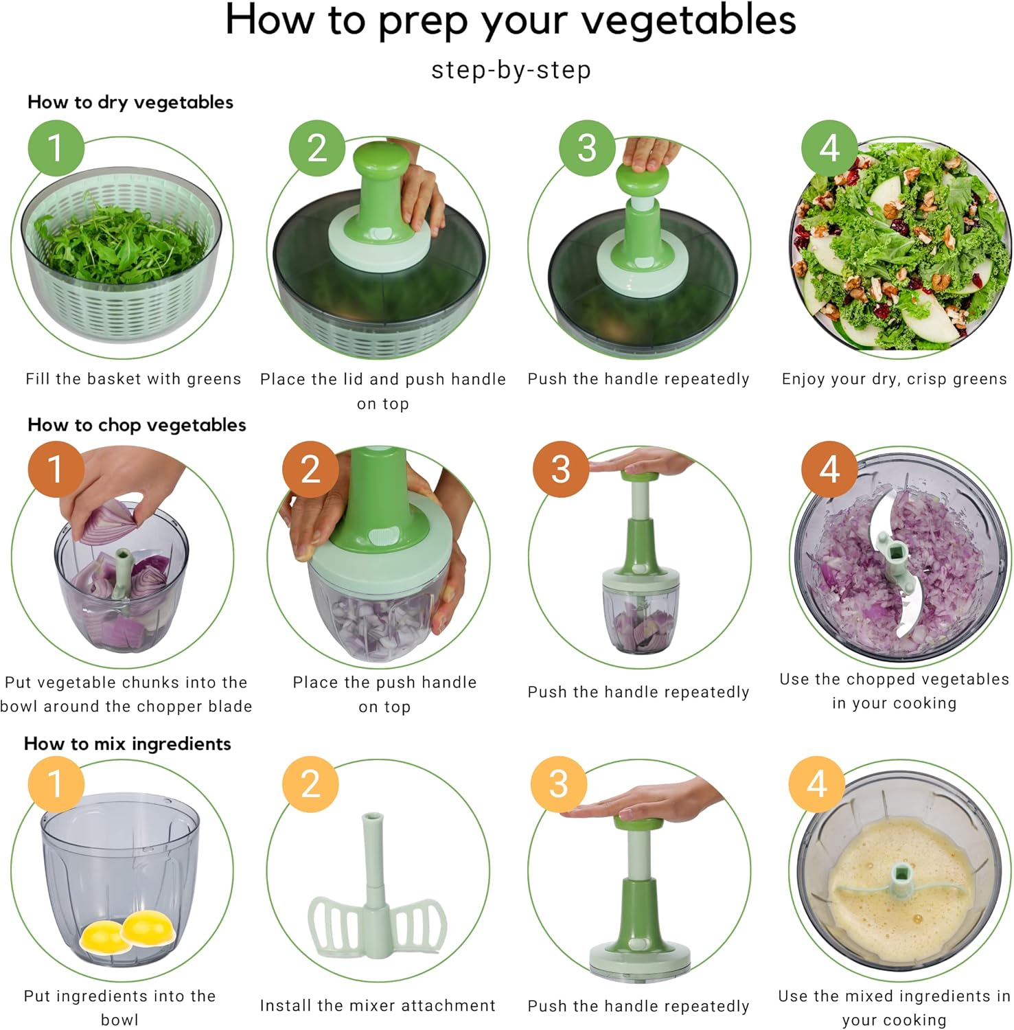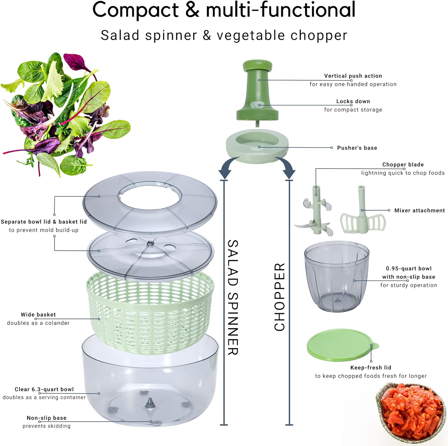 The Brieftons Salad Spinner and Chopper lets you wash, dry, store, serve your salads, and make quick work out of tedious chopping tasks, all with one easy to use, convenient, compact appliance! Just a few pushes and voila, your vegetables are dried or chopped, and ready to go!