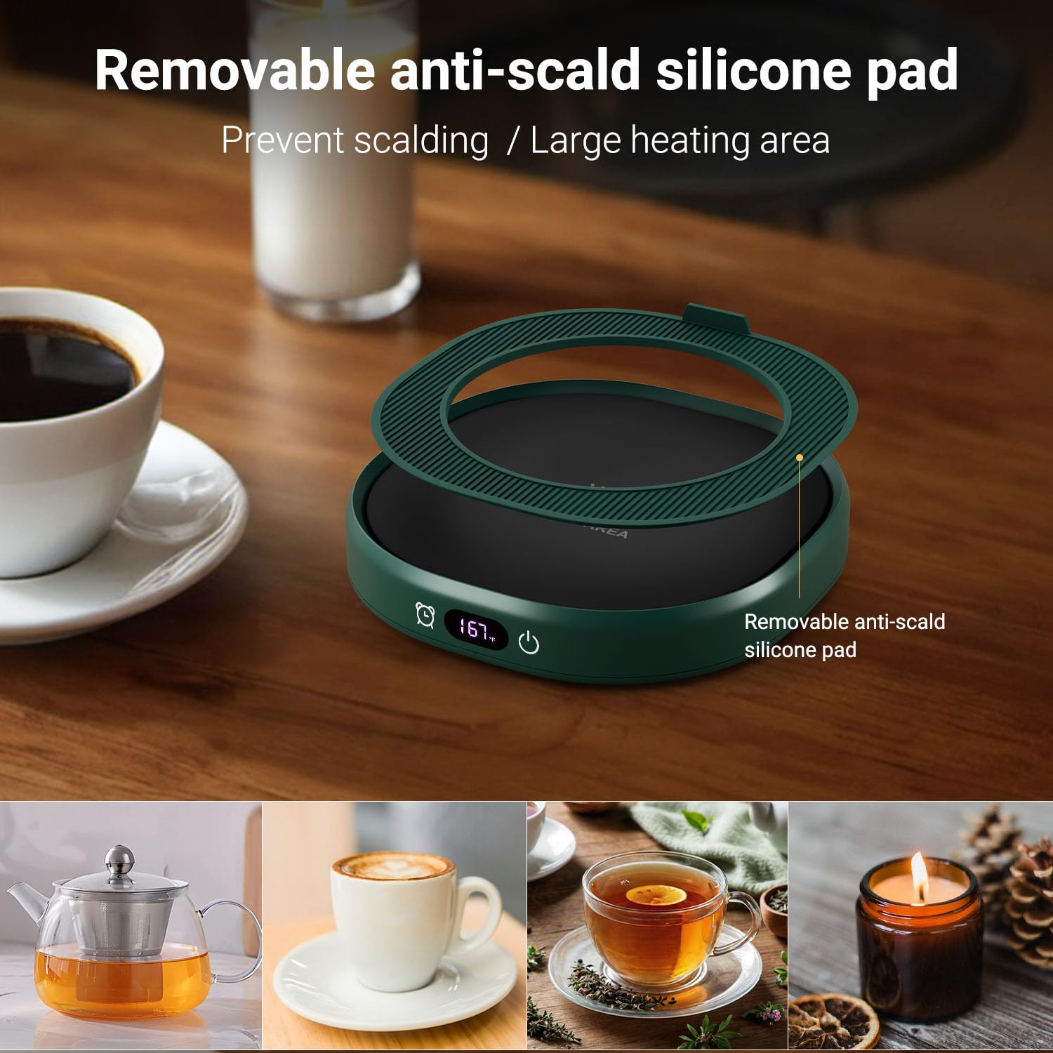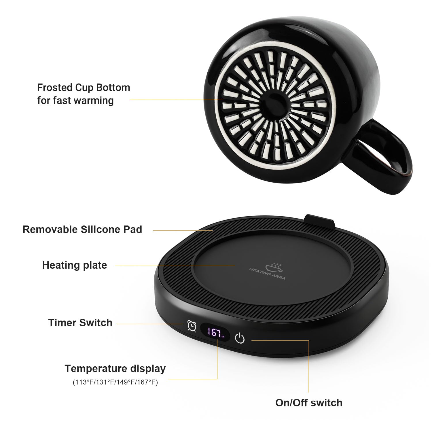 - Compatible with Most Cups: The heating plate adopts sealed-insulation technology to prevent splashing water, 4.5 inch heating plate is also fits for other glass cup, stainless steel cup, porcelain cup etc. NOT suitable for plastic cups and double insulation mugs. When using a small sized cup, the silicone rubber ring design on the top of the cup cushion can not only reduce heat dissipation, but also protect your hands from scalding