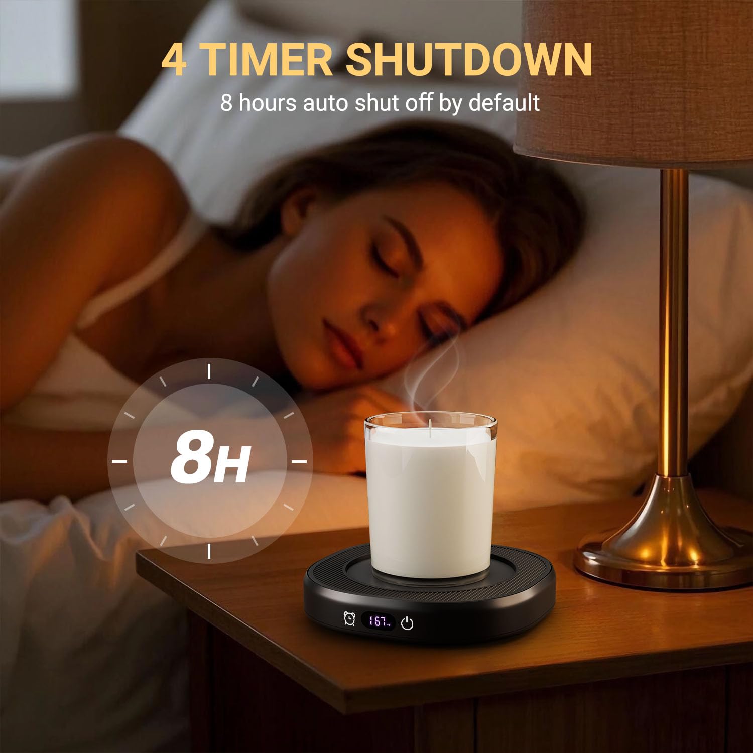 - Intelligent Timed Design: Coffee cup warmer will auto shut off 8 hours after the last operation by default. We also set up 4 options of 2 H/4 H/6 H/8H according to different use conditions of users. You can set the automatic shutdown time according to your own needs. Warm drink available at your wanted time. Safe and energy efficient. No worries about forgetting turn mug warmer off