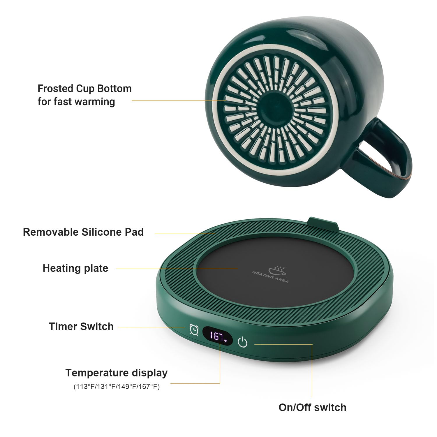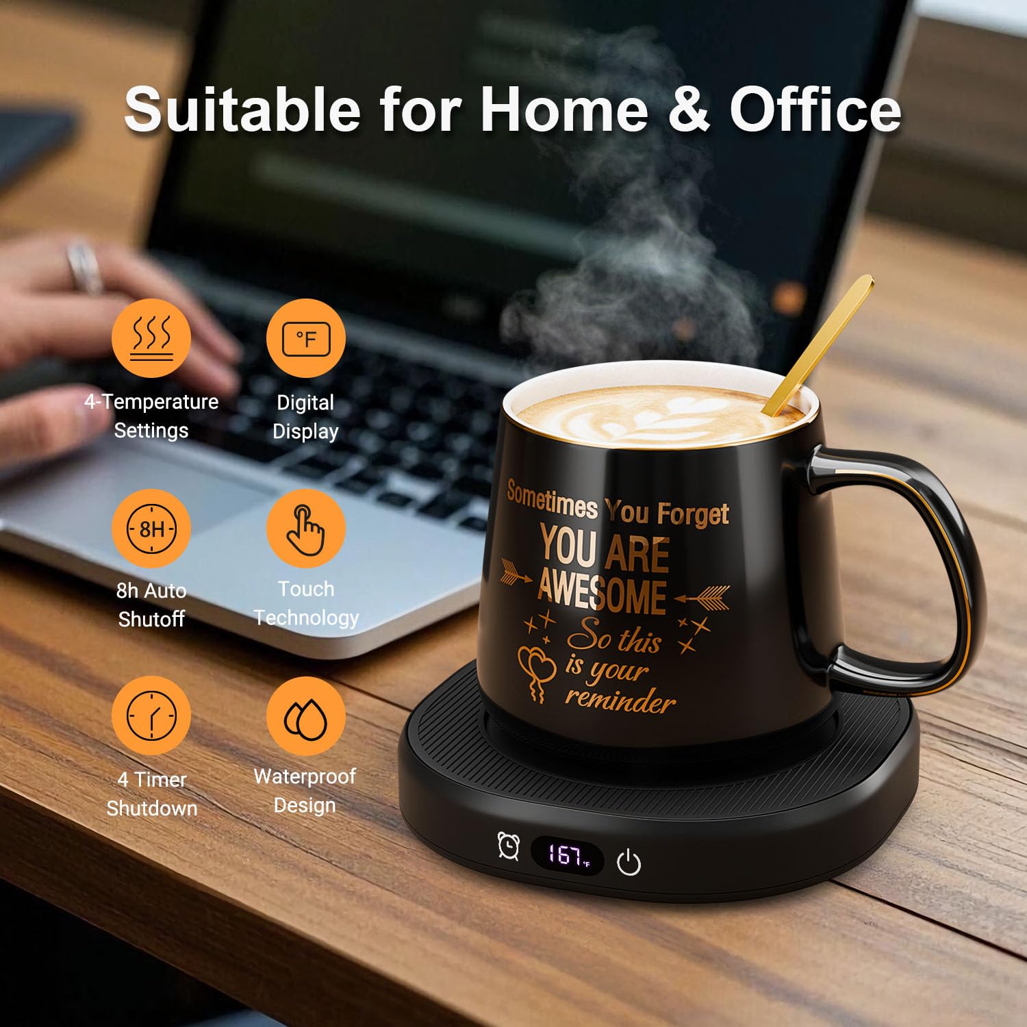 - Adjustable 4-Temperature Setting: Coffee warmer will keep your coffee at a perfect drinking temperature. You can control the temperature by tapping the button, keeping your coffee, tea or milk up to 113°F/131°F/149°F/167°F