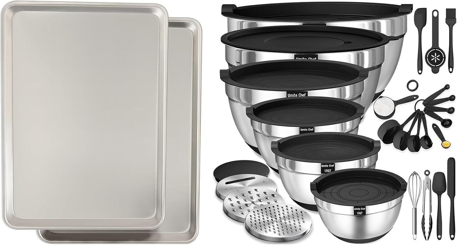- REMIUM EXTRA-GAUGE THICK ALUMINUM BAKING SHEET The aluminum baking pans are made of thick and heavy aluminum, with a heavy rolled edge making this truly "commercial-grade". Pans are made of a special hardened aluminum alloy that provides maximized scratch resistance, making them long-lasting. These half-sheet pans will not peel or rust for a lifetime of durability. No reason to risk using non-stick chemicals for bakeware anymore!