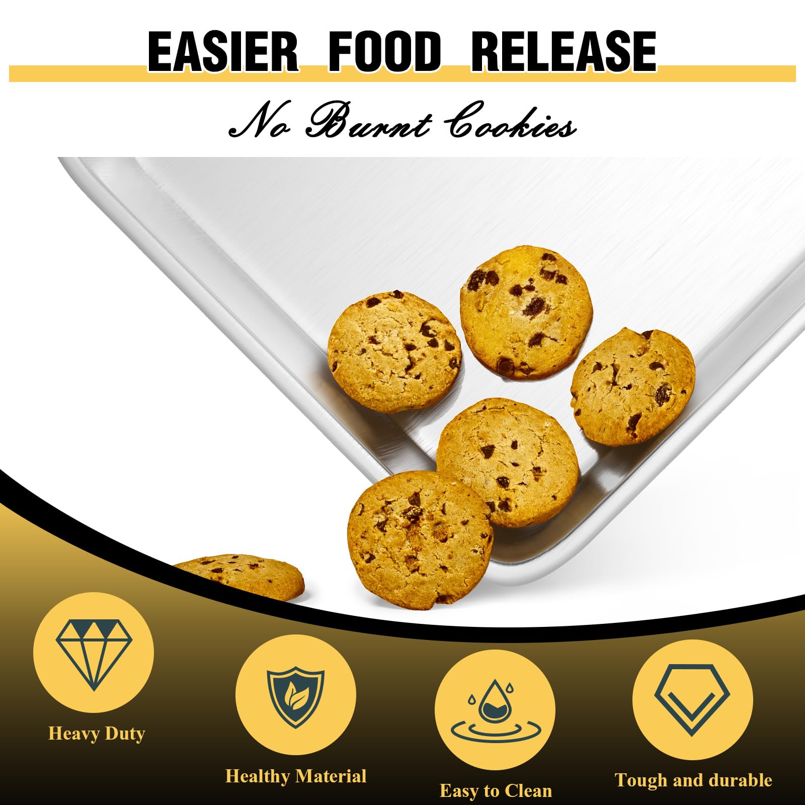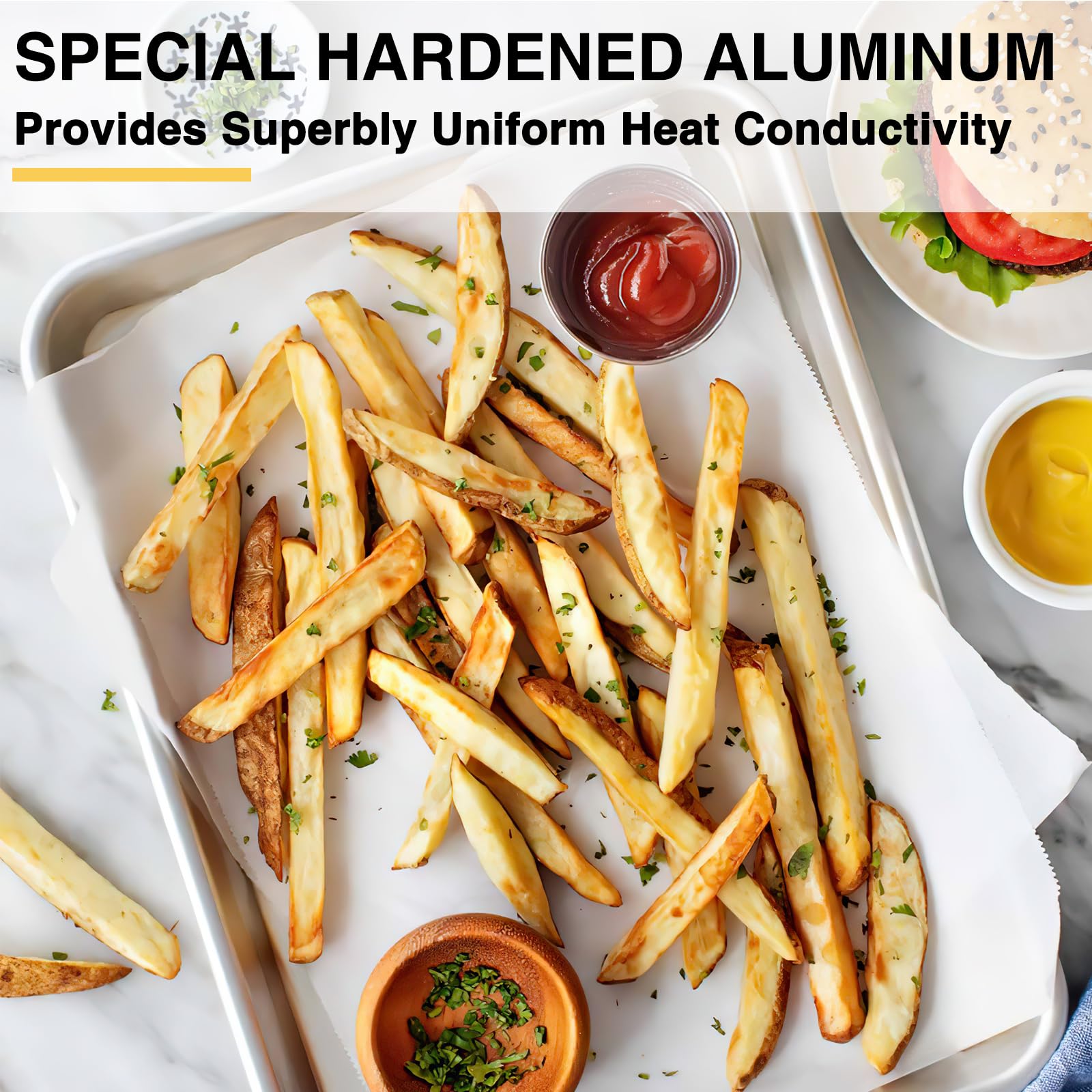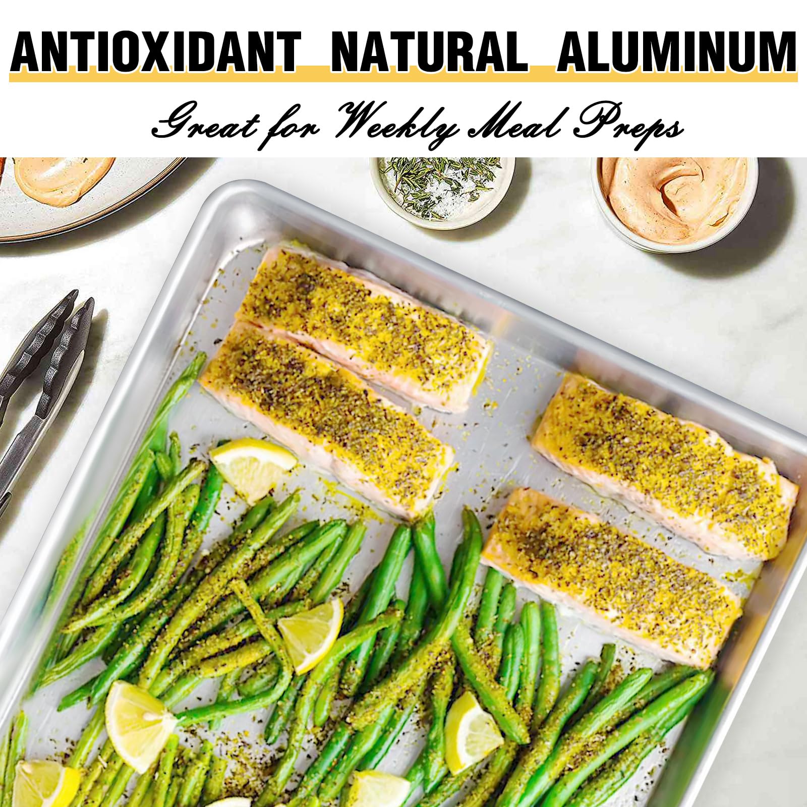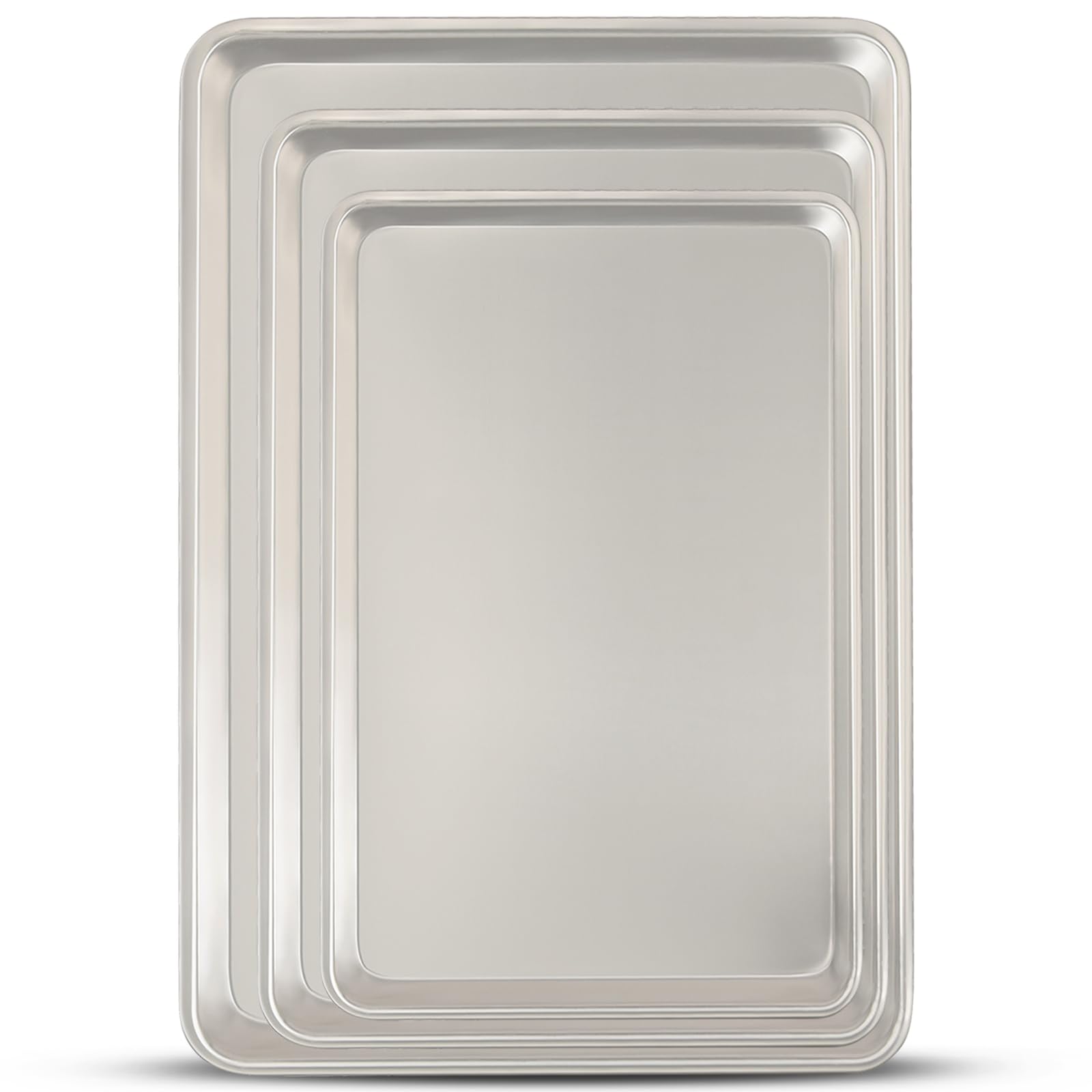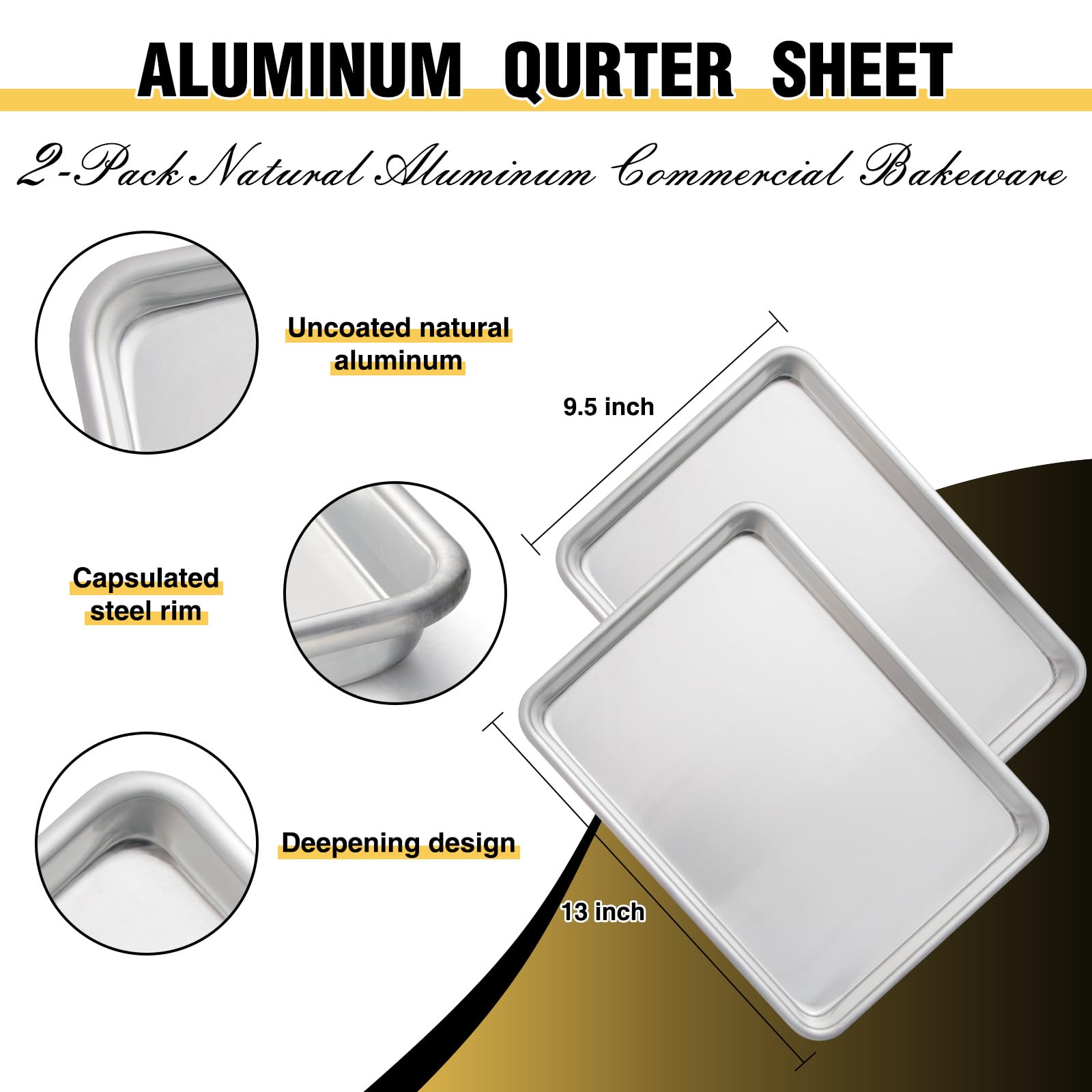 - PREMIUM EXTRA-GAUGE THICK ALUMINUM BAKING SHEET: The aluminum baking pans are made of thick and heavy aluminum, with a heavy rolled edge making this truly "commercial-grade". Pans are made of a special hardened aluminum alloy that provides maximized scratch resistance, making them long-lasting. These quarter-sheet pans will not peel or rust for a lifetime of durability. No reason to risk using non-stick chemicals for bakeware anymore