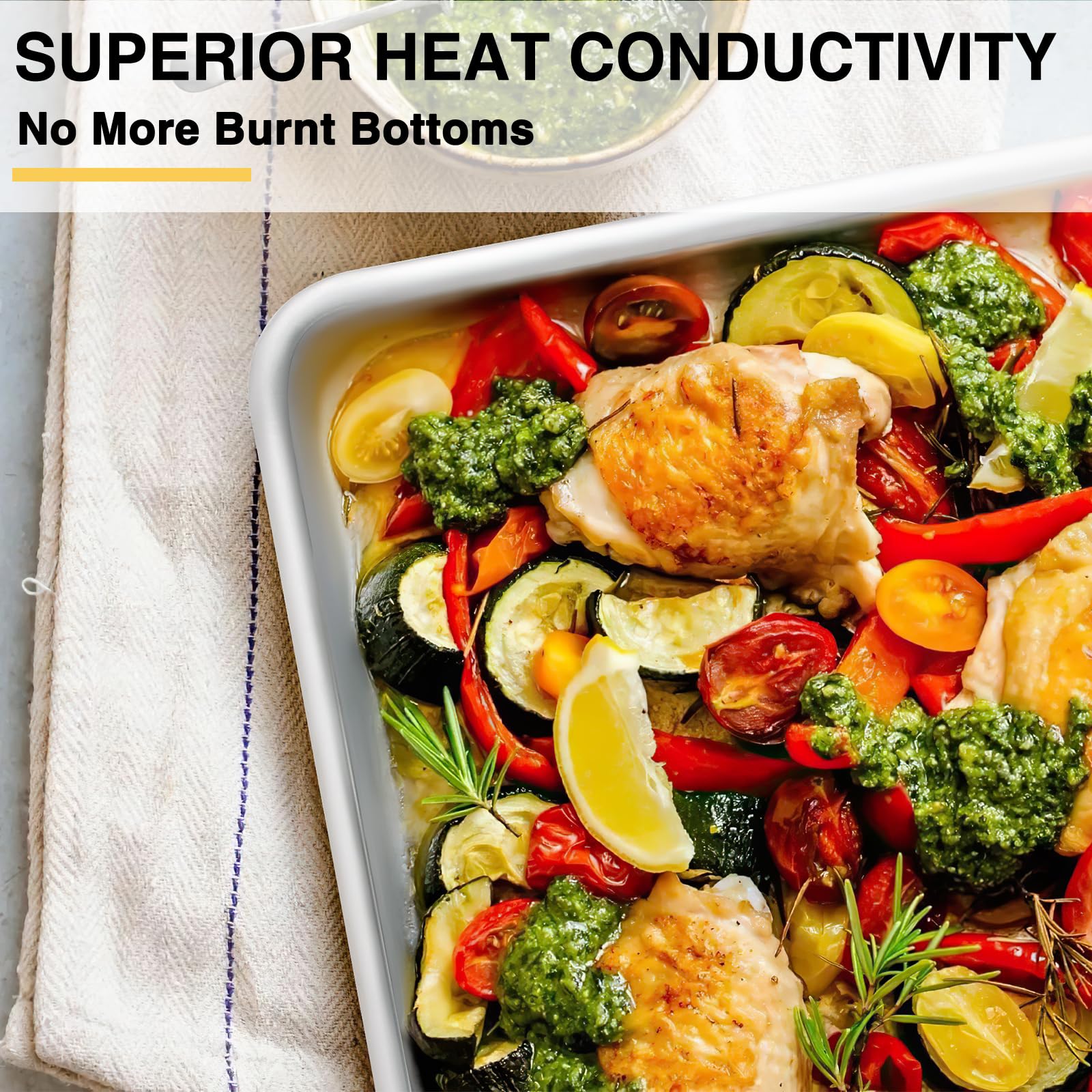 - NO MORE BURNT BOTTOMS: They perform better than ordinary stainless steel baking pans in terms of heat resistance and cook everything evenly, withstand temperatures of up to 500ºF / 260ºC without warping. Foods bake evenly due to aluminum’s superior heat conductivity. The non-stick design ensures baked goods will release quickly from the pan. While still getting the quicker heat-up time it provides over steel. When used with silicone mats, there are no worries about sticking anymore