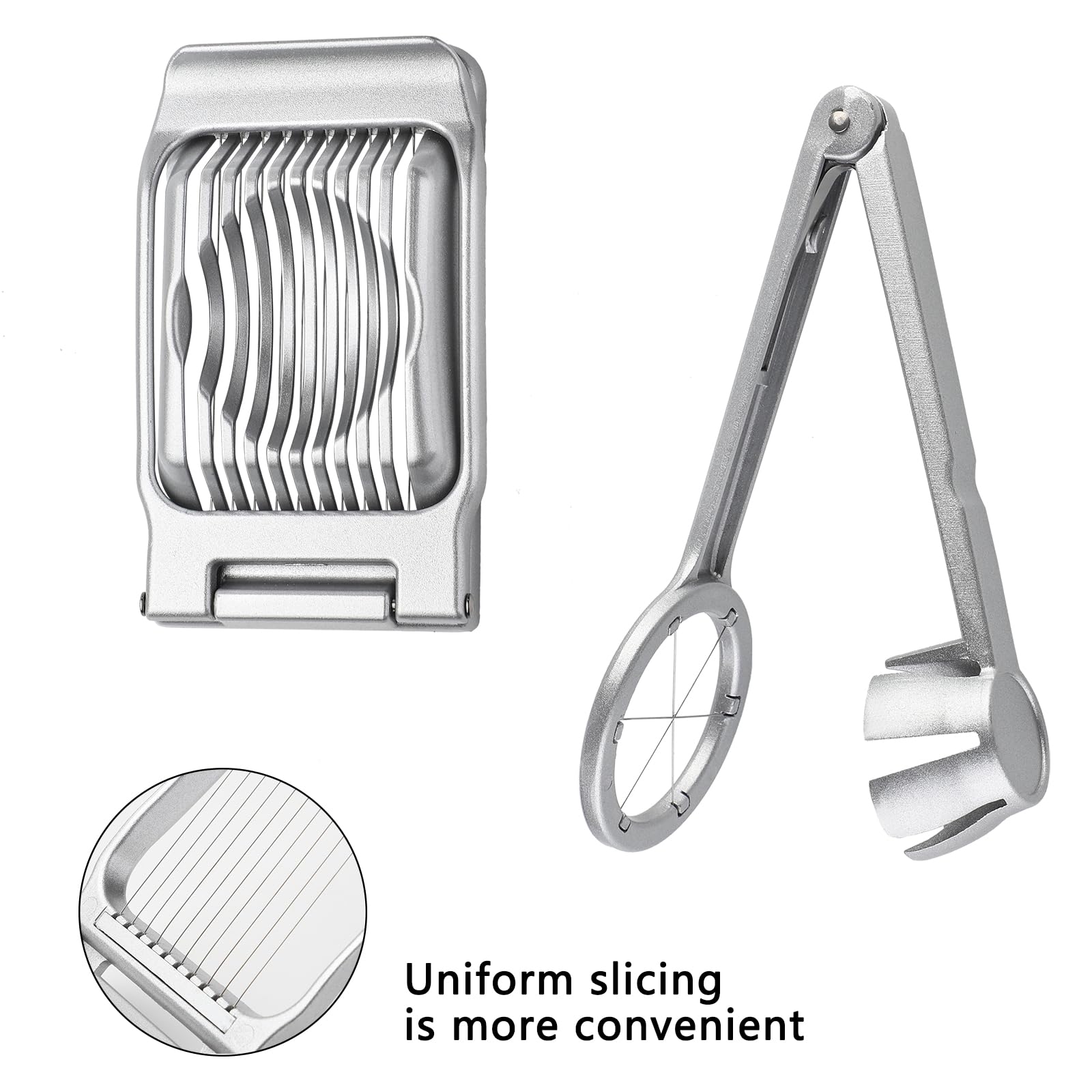 - 【Multifunctional Egg Slicer】: This Egg Slicer for Hard Boiled Eggs has a perfect egg groove, the eggs will not slip off during the egg cutting process; save you the time and effort of cutting eggs, not only can slice eggs, but also slice other soft Sexual foods such as strawberries, bananas, kiwi, mushrooms, butter, cheese, tomatoes, etc