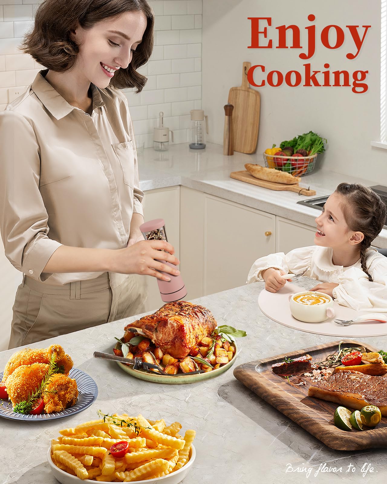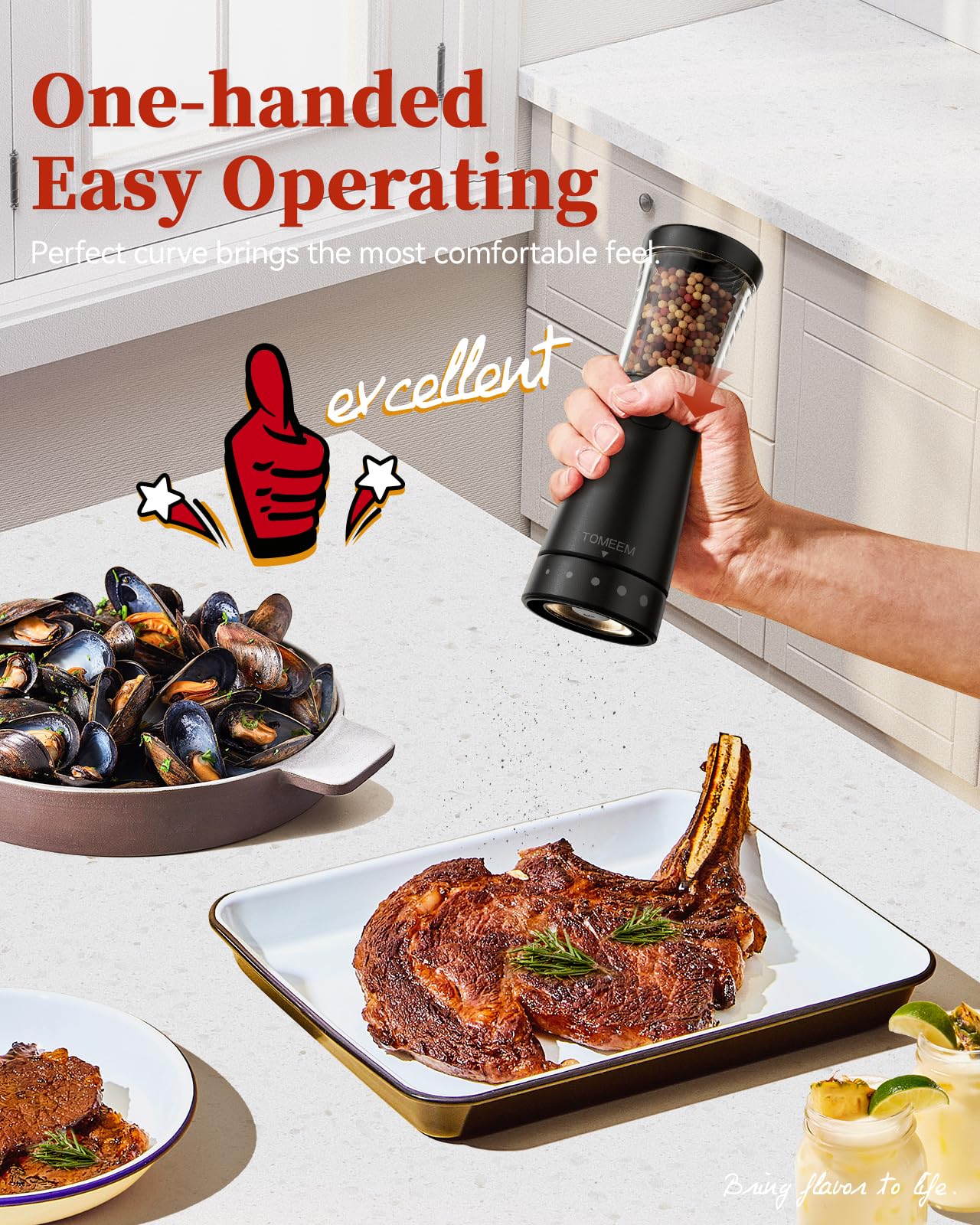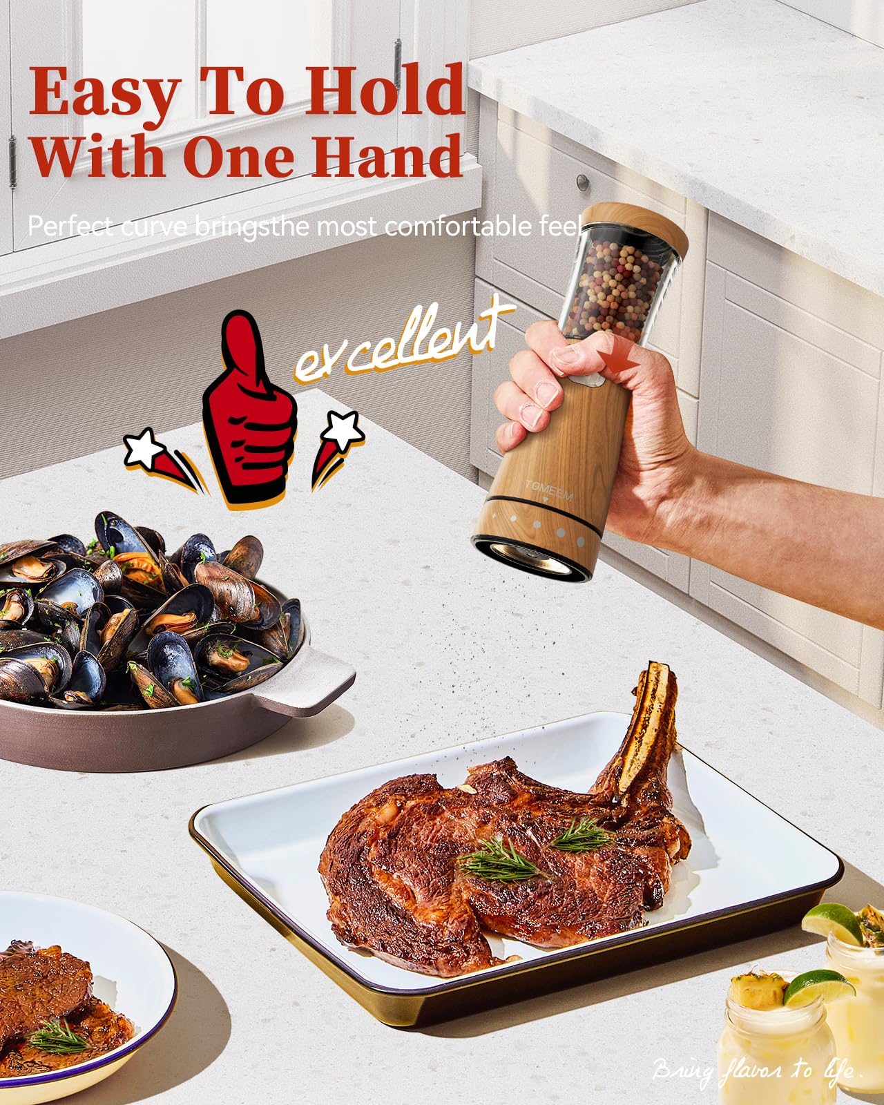 - Ergonomic Hourglass Design: This salt and pepper grinder is beautifully crafted with a human-centric, contoured waistline, offering both a sophisticated look and a comfortable grip for all your seasoning tasks. The simple one-touch operation design ensures that even individuals with arthritis can use it with ease