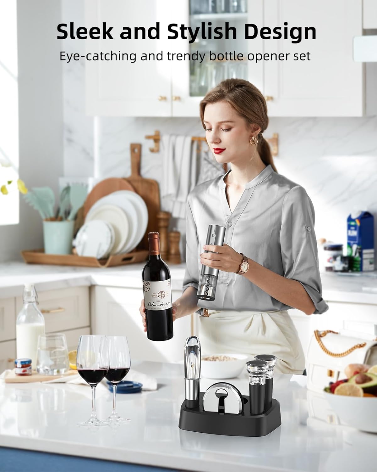 - Exquisite All-in-One Set: Elevate your wine experience with our electric wine opener gift set. This comprehensive all-in-one set includes a foil cutter, wine stoppers, and pourer, providing a convenient and complete solution for effortless wine opening, enhanced aeration, and perfect flavor preservation. Be it a dinner party or a quiet night in, our electric wine opener set adds a touch of enjoyment to your wine time