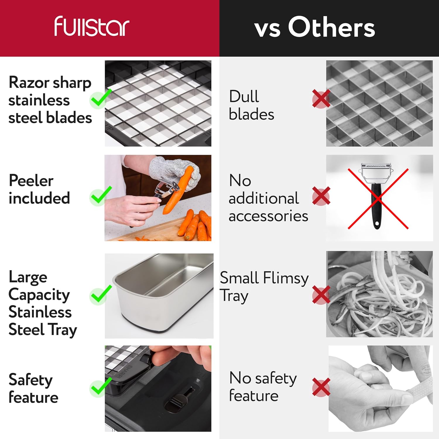 - Easy Meal Prep with Rust-Resistant Blades - Our vegetable chopper is perfect for anyone who wants to eat healthier but doesn't have a lot of time to spare. Dice potatoes, tomatoes, cucumbers, carrots, and more with the heavy-duty, rust-resistant blades. The 420 stainless steel blades retain razor sharpness for crisp, smooth dicing.