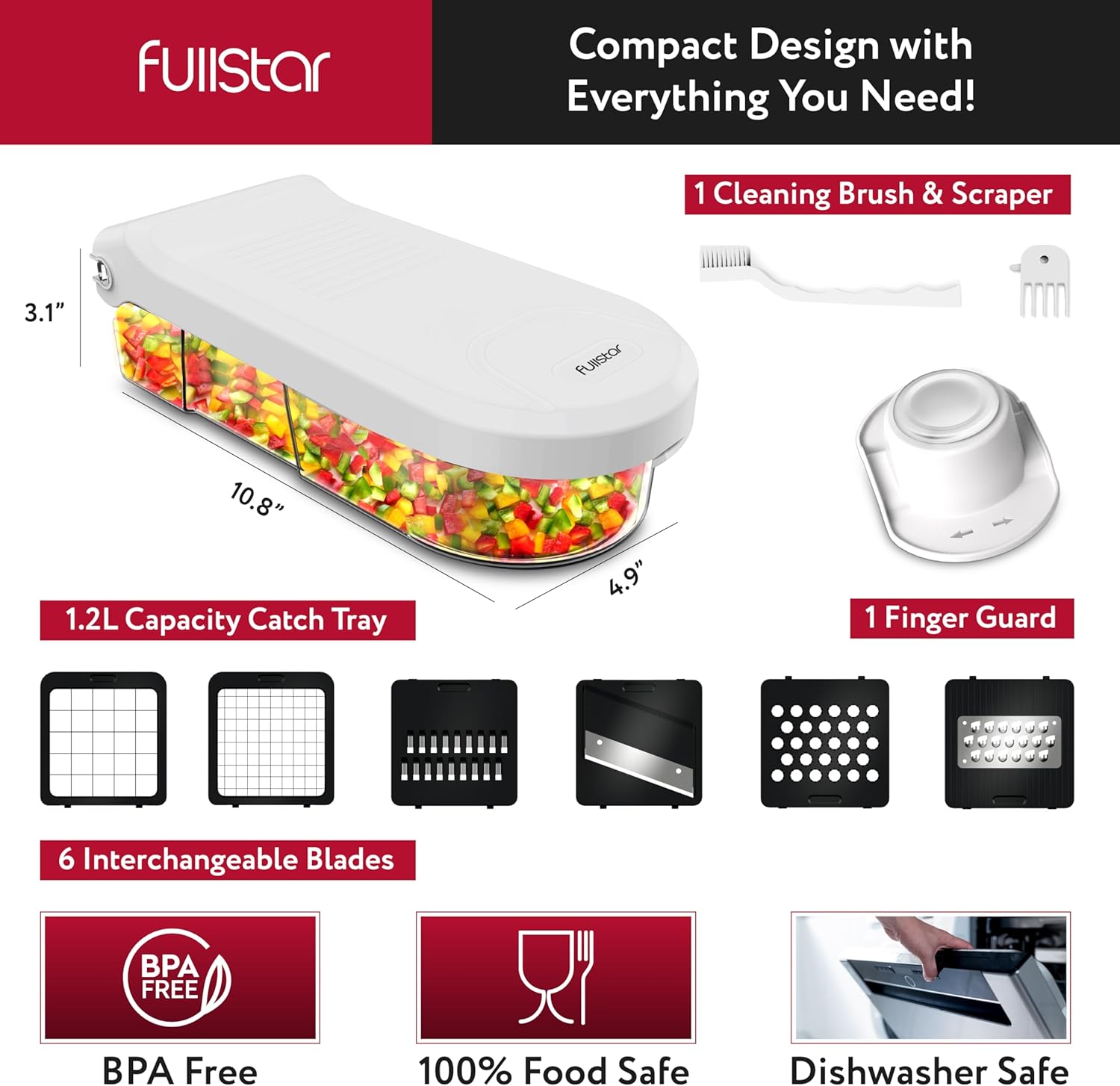 • Great Value & Quality - The Fullstar vegetable chopper is an affordable mandoline slicer and cheese grater that doesn't compromise on quality. It includes 6 stainless steel blades, 1 cleaning brush, 1 finger guard, and a 1.2L container for safe and efficient meal prepping.