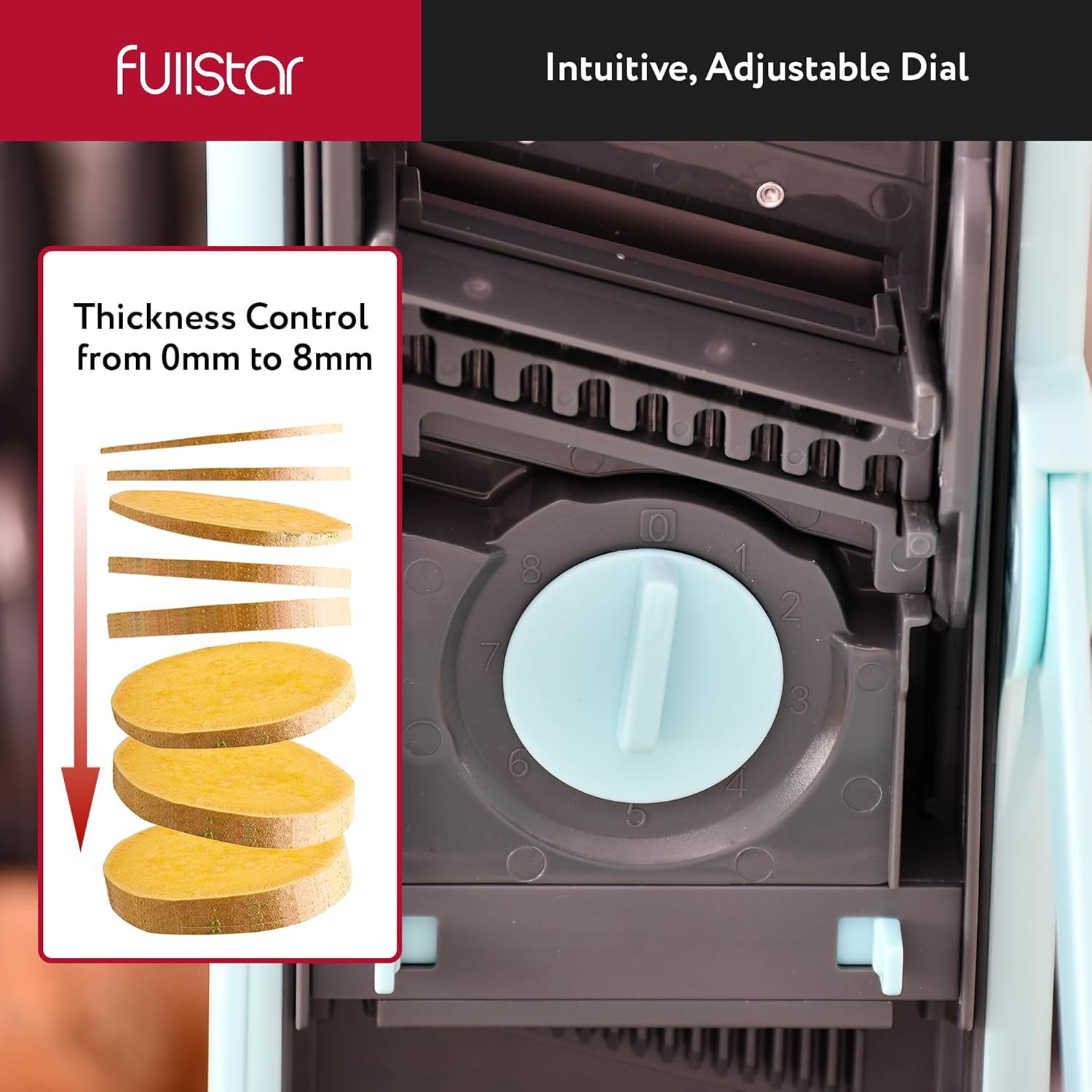 - Enhanced Safety and Comfort - The Fullstar potato slicer for chips and slicer vegetable cutter is designed with a wider handle for a superior grip, ensuring safety and ease of use. The intuitive dials for adjusting cut and thickness make slicing effortless.
