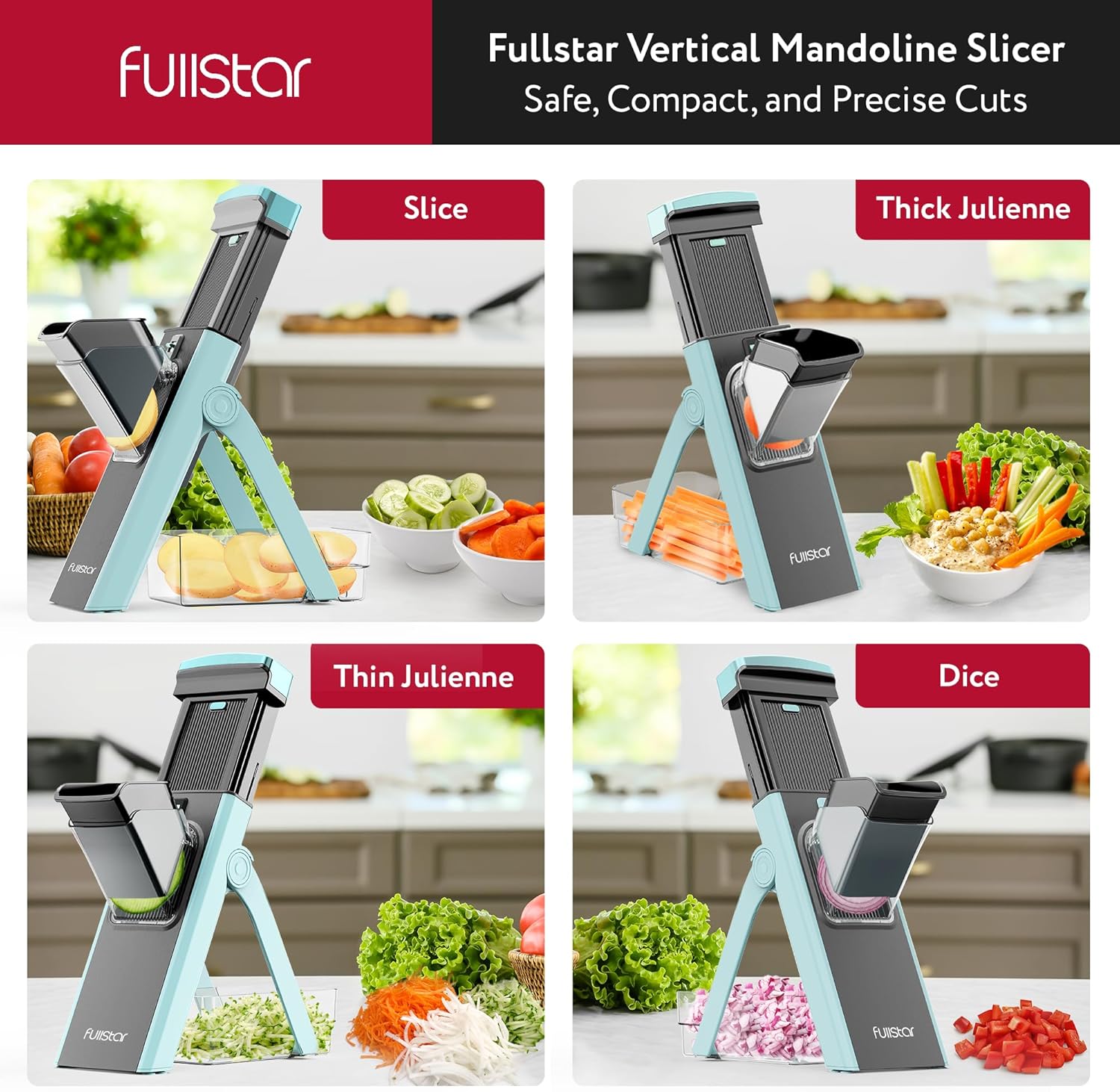 - Versatile Precision Slicing - Achieve a variety of slices with Fullstar 4-in-1 vertical potato slicer multifunctional vegetable cutter, from perfect julienne to dicing, without swapping blades. Adjust thickness easily from 0mm to 8mm for customized cuts every time.