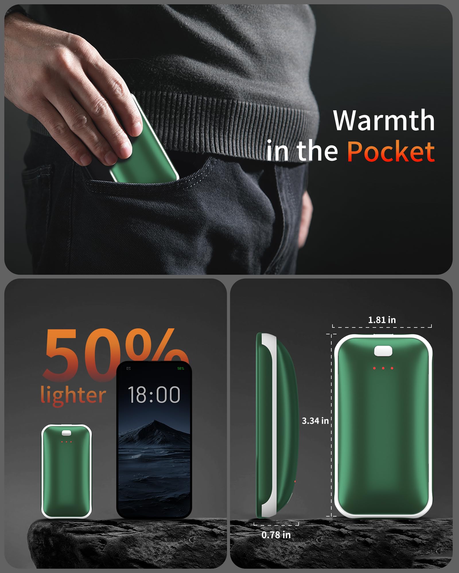 - 【SAFE & RELIABLE】 Made with advanced lithium batteries, aluminum, and ABS materials, our hand warmers meet rigorous UL, CE, and FCC safety standards. With multiple protection features and precise temperature control, you can use them confidently.
