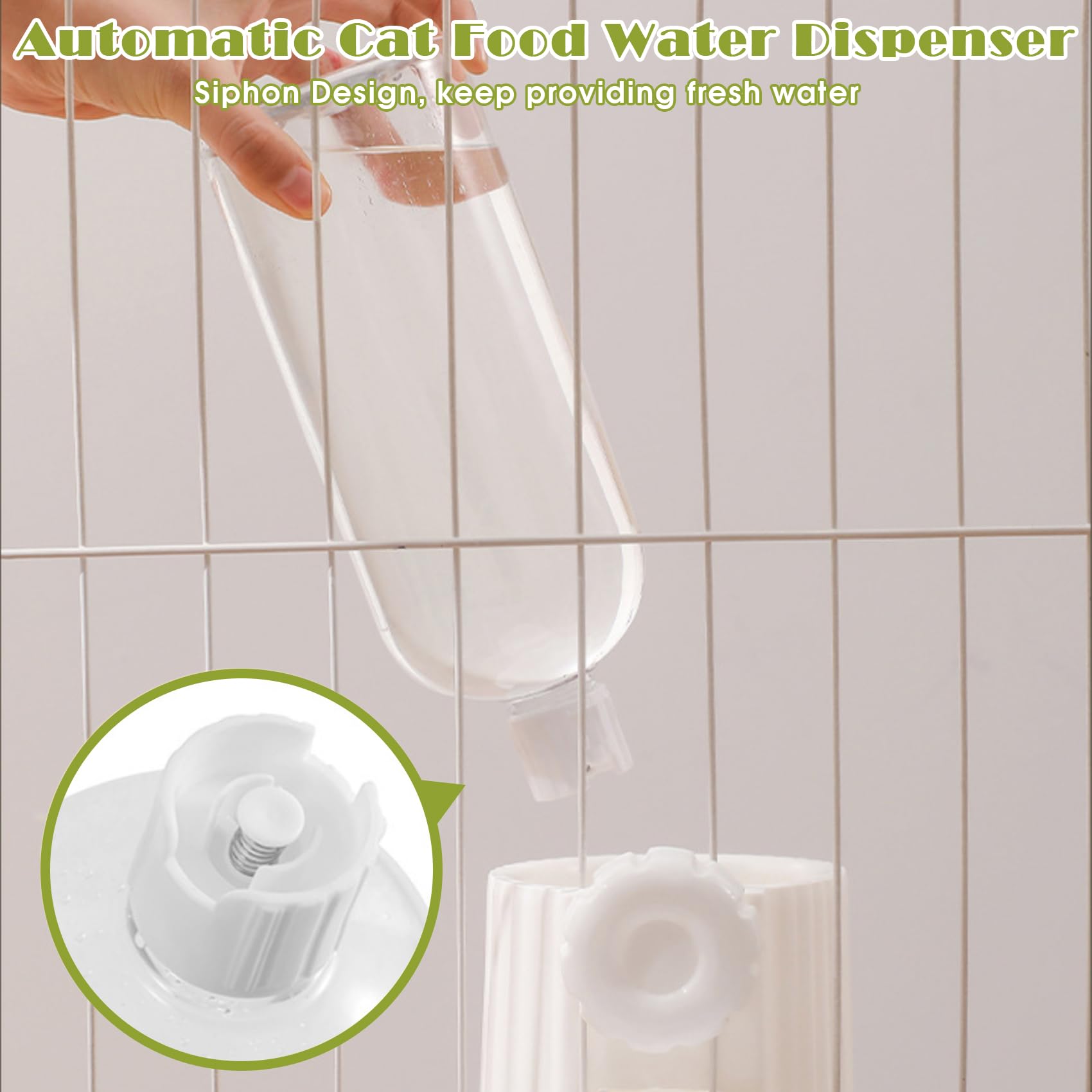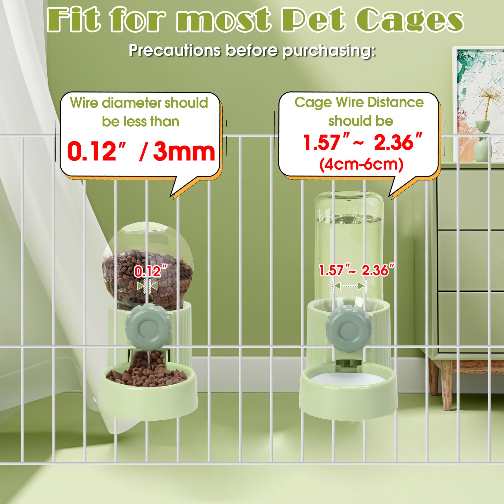- The automatic cage cat food and water dispenser fit most cages, require 1. Cage Wire Distance should be 1.57”-2.36” (4cm-6cm); 2. Wire diameter should be less than 3mm/0.12”. Please measure your cage before ordering.