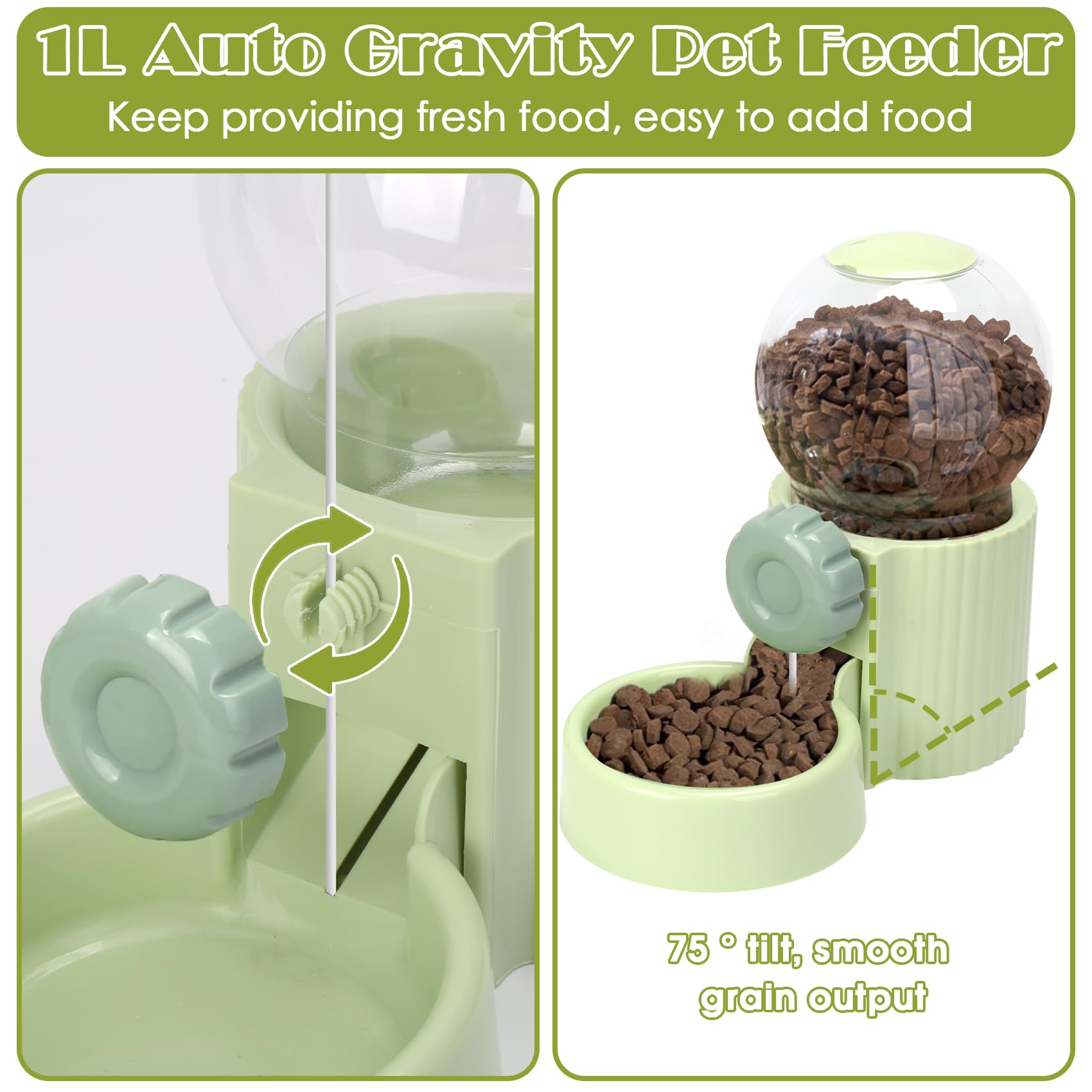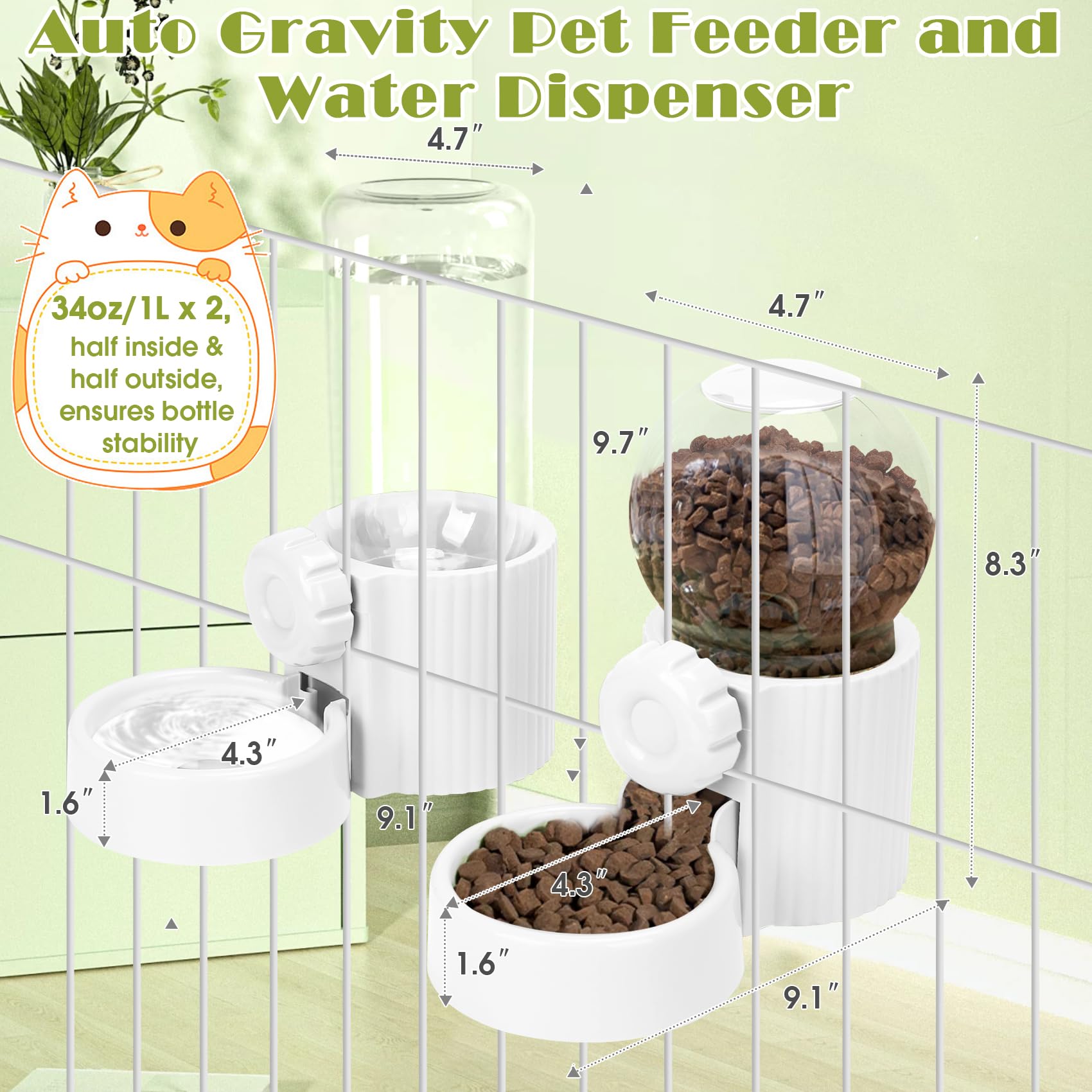 - The pet food water dispenser includes 1 x 34oz Pet Feeder and 1 x 34oz Water Dispenser, ensures your pet animals eat and drink freely. Made of food grade material, sturdy and safe to use.