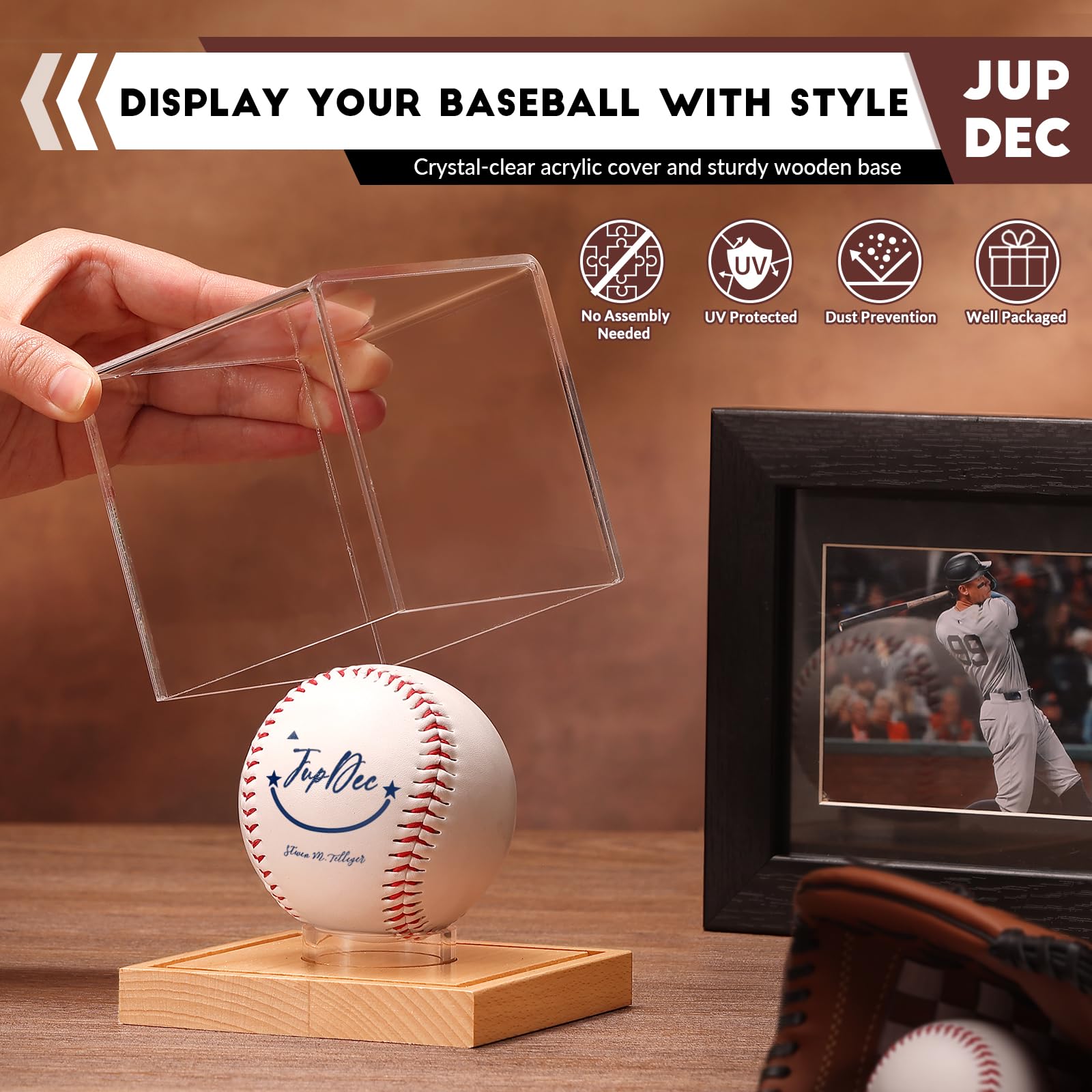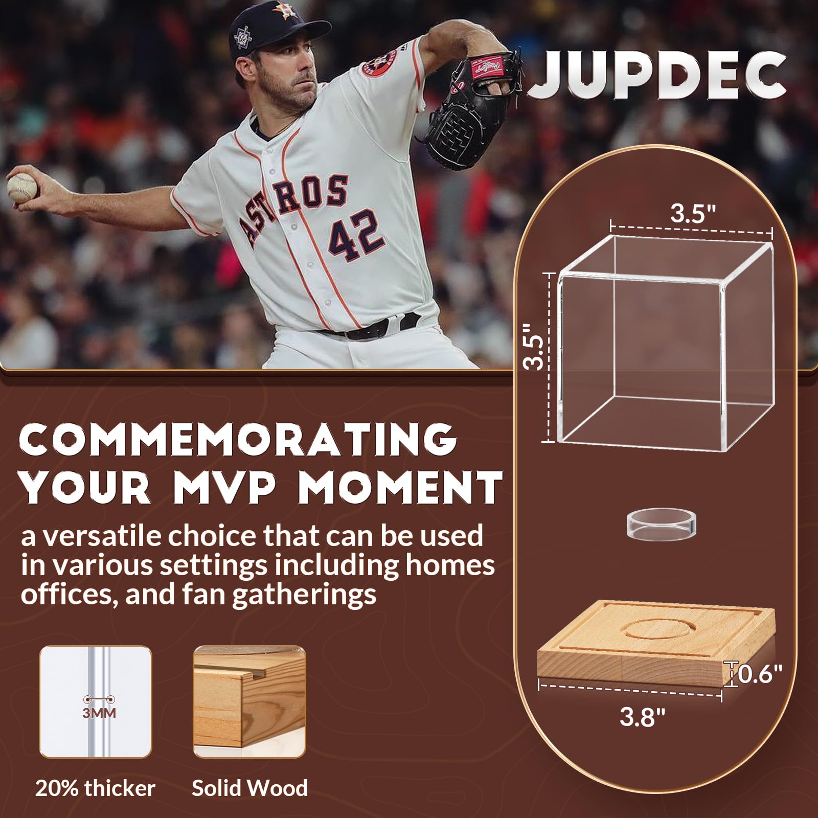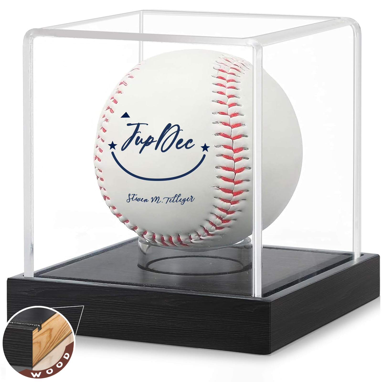 JupDec Baseball Display Case, Clear Cube Baseball Holder with Wooden Base, Autograph Baseball Stand Box for Single Ball, Acacia Wood, Black, 1 Pack