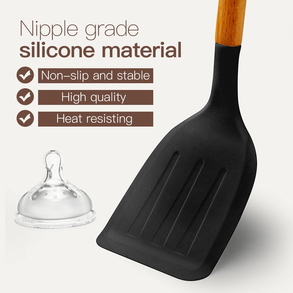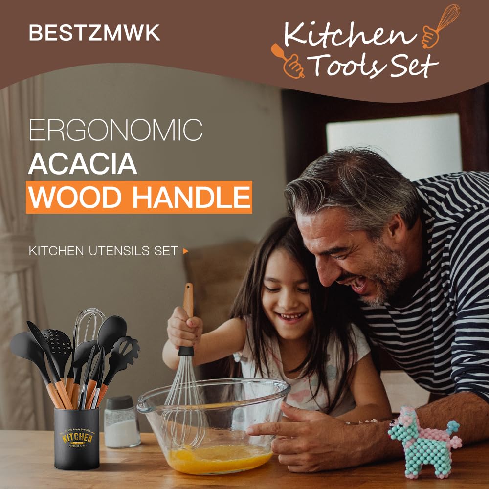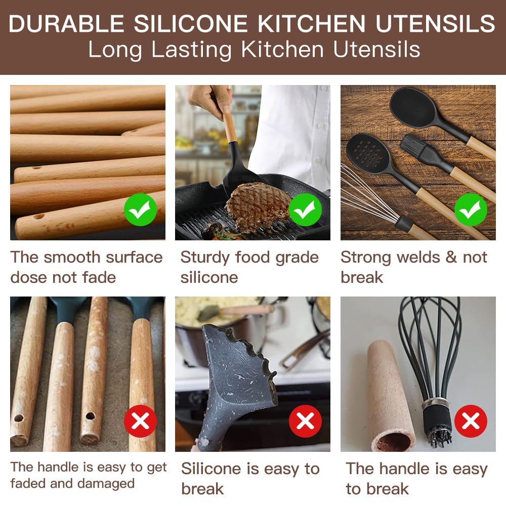 Kitchen Cooking Utensils Set, 14 Non-Stick Silicone Cooking Kitchen Utensils Spatula Set with Holder, Wooden Handle Silicone Kitchen Gadgets Utensil Set for Nonstick Cookware(Black)