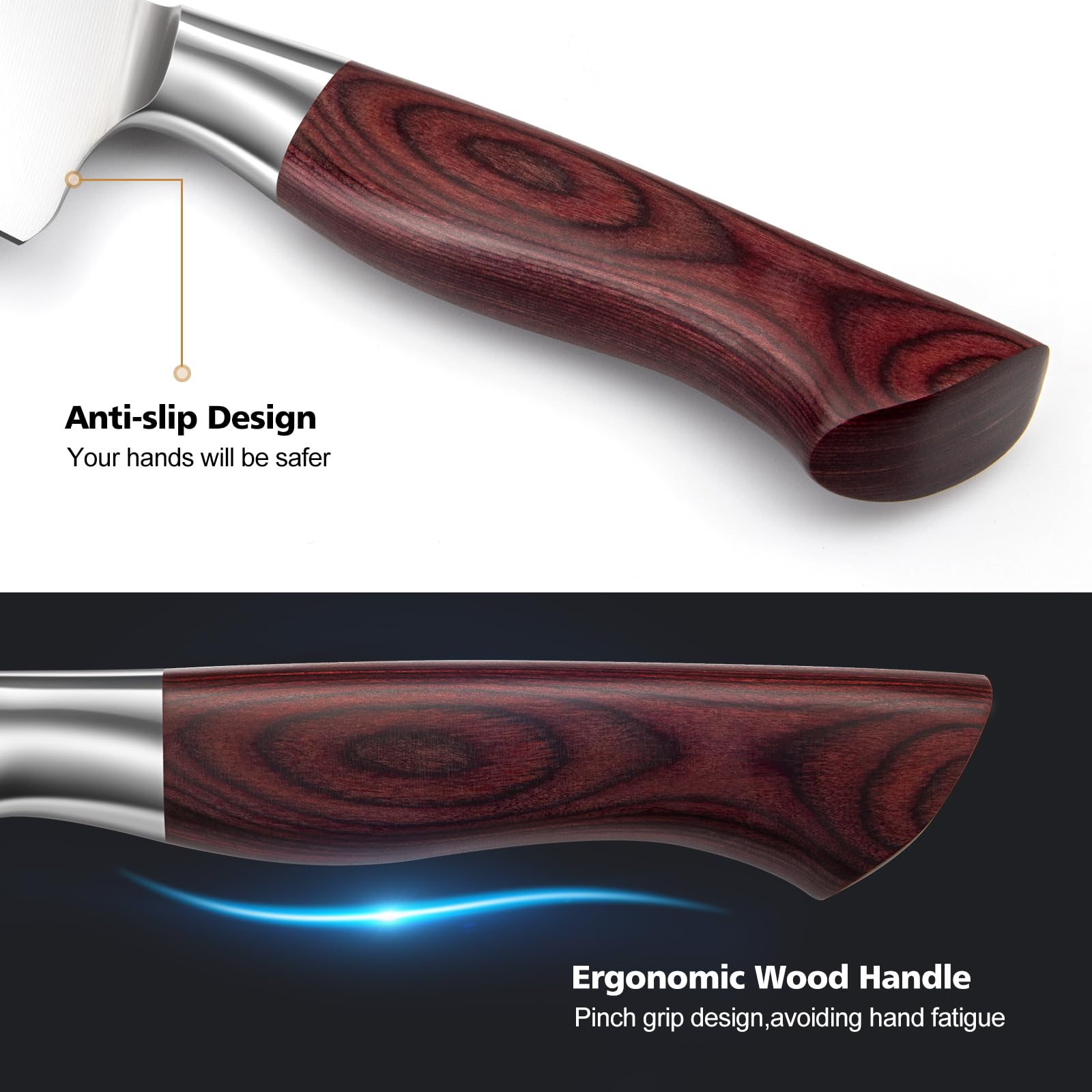 - 【Comfortable Ergonomic Wood】 The wood handle of cooking knife set which is dense, hard and solid. Ergonomic design offering comfy grip to improves balance and reduces fatigue during prolonged use. Knife block set is the best choice for professional chefs.