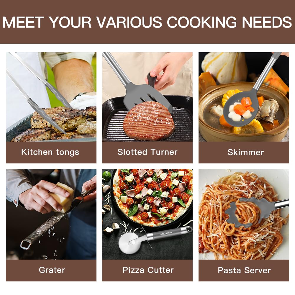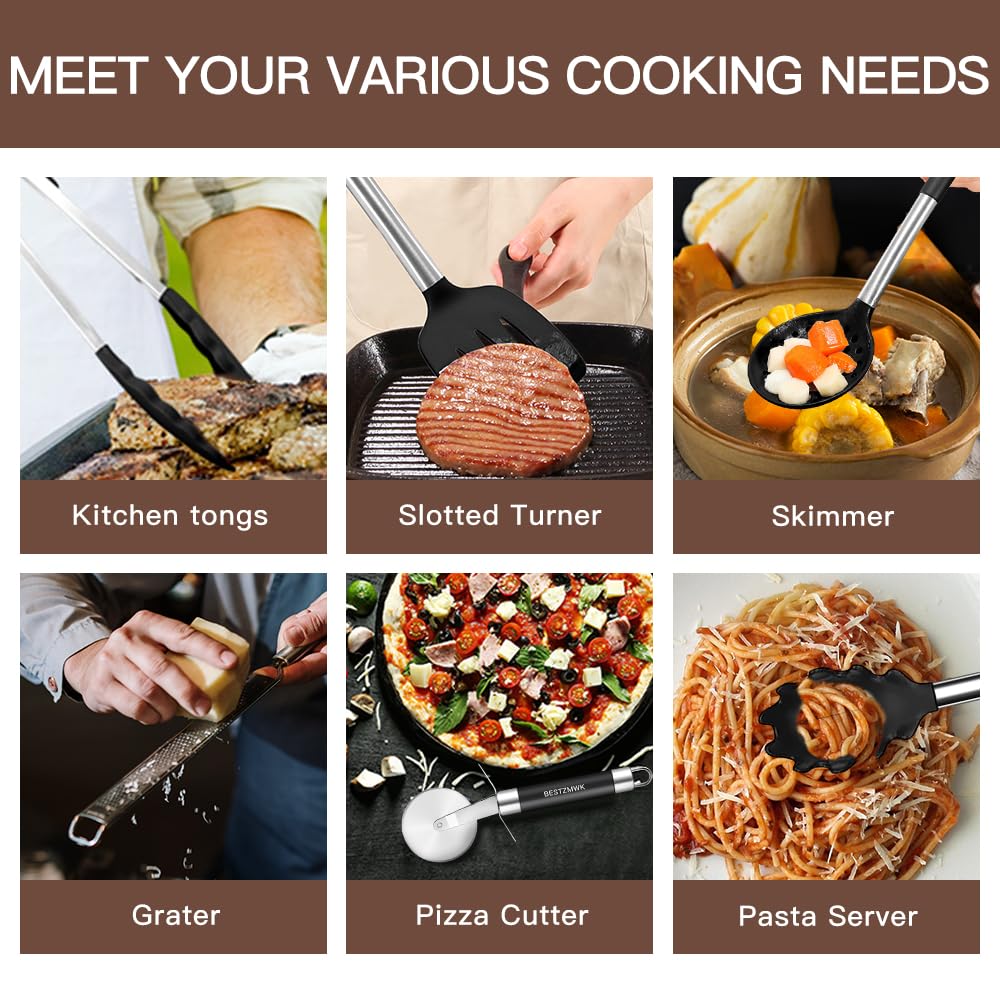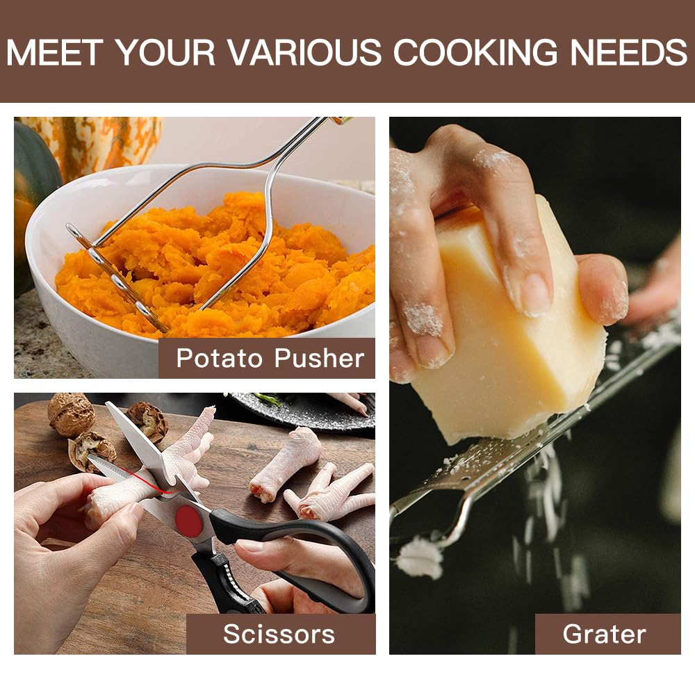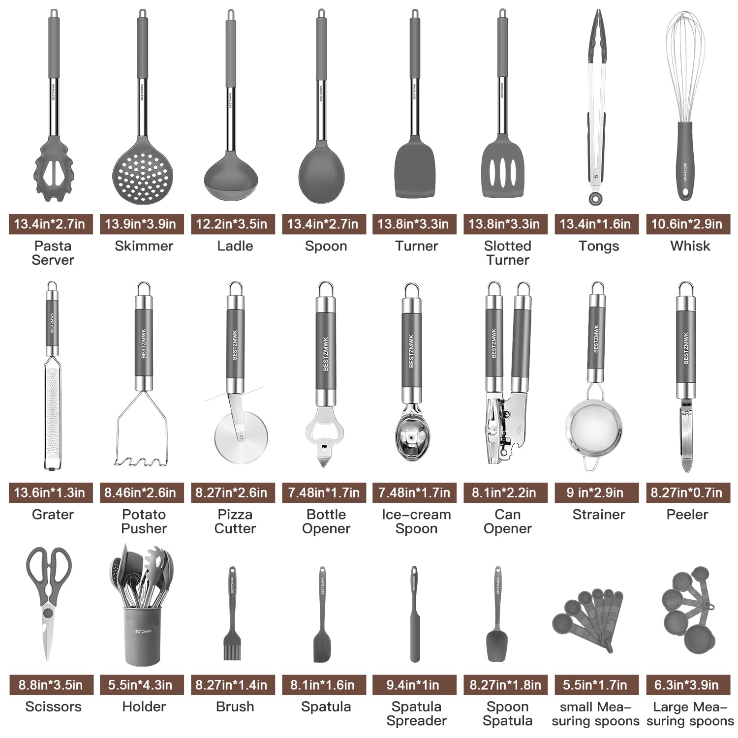 - 33 COOKING UTENSILS - Utensil Set includes everything you need to cook that perfect dish,includes Turner,Slotted turner,Skimmer,Spoon,Ladle,Pasta server,Tongs,Whisk,Spatula spreader,Spoon spatula,Large and samll Measuring spoons,Holder,Brush,Spatula,Grater,Strainer,Scissors,Potato pusher,Can opener,Bottle opener,Pizza cutter,Ice-cream spoon