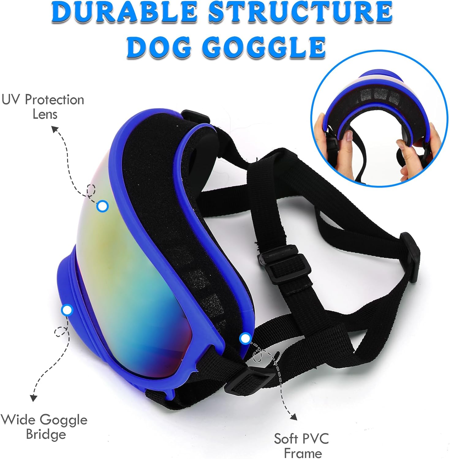 - Adjustable Strap & Strong Buckle - The head and jaw of the dog goggles are adjusted with adjustable bands. The pets are comfortable to wear, strong buckle makes it not easy to fall off. The eyeglasses frame is surrounded by soft materials, making the eyeglasses are soft and comfortable to wear.