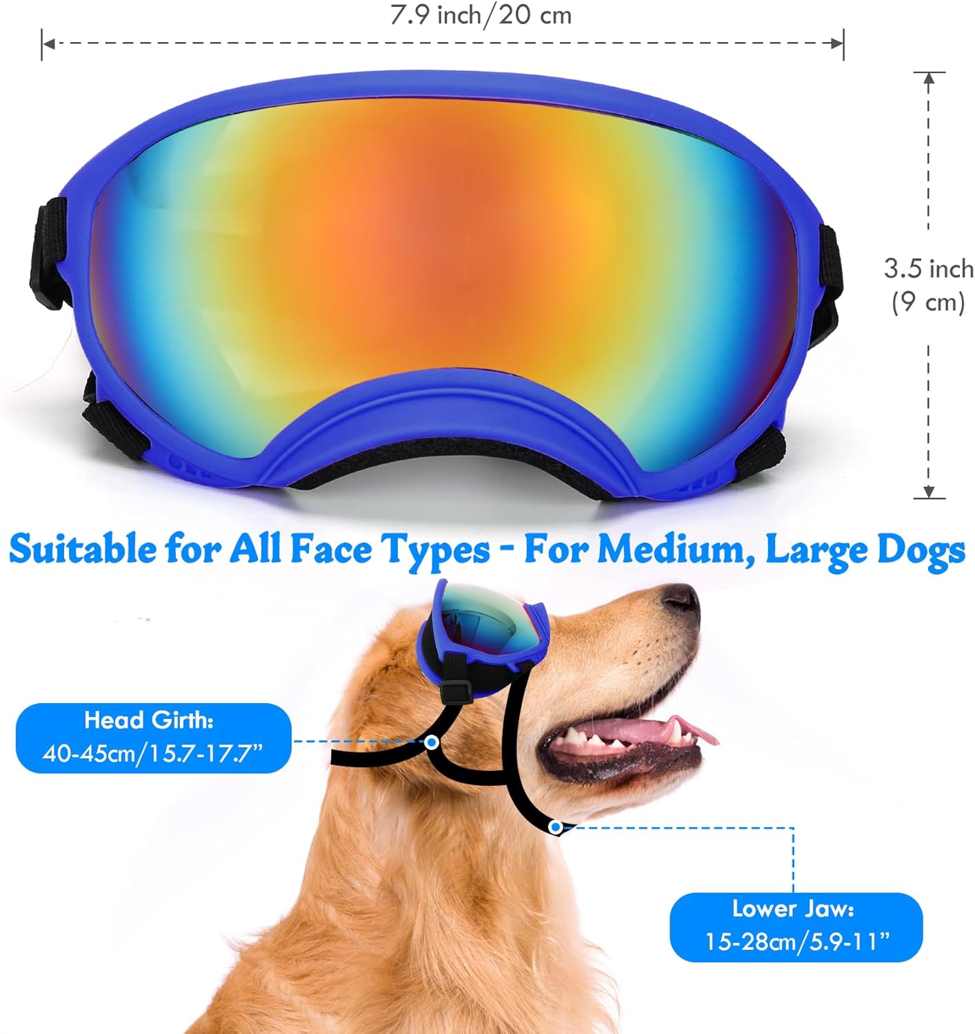 - For Medium & Large Dogs - The large glasses fit for medium & large dogs,total width: 18cm/7.08”, lens height: 8cm/3.14”; Head Girth adjustable from 40cm/15.7”-45cm/17.7”, Lower Jaw adjustable from 15cm/5.9”-28cm/11”. Note - Please Measure Your Pet Before Buying.