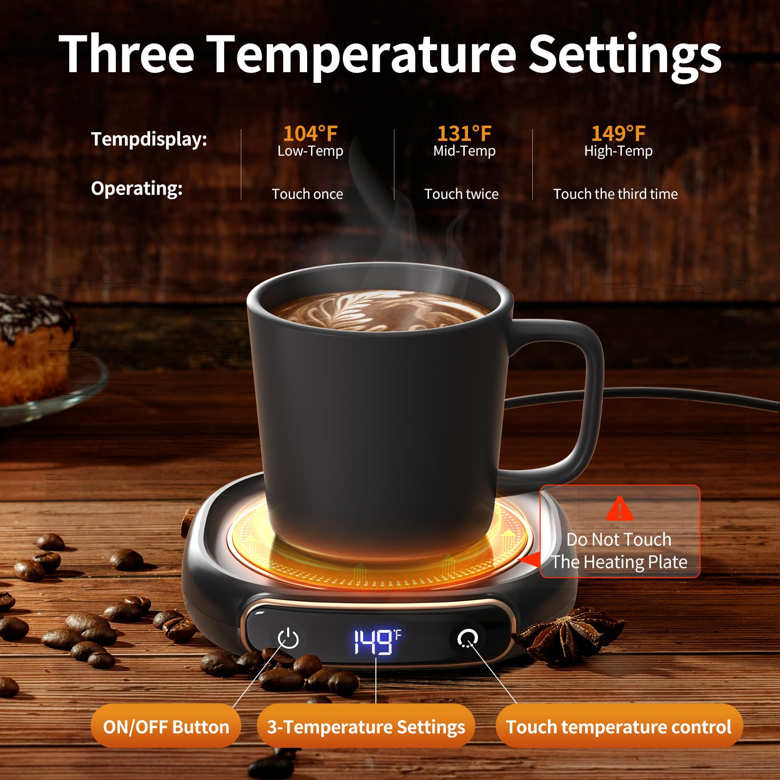 • 🍃【Adjustable Three-Temperature Setting】: LERAT coffee mug warmer will keep your coffee at a perfect drinking temperature. You can control the temperature by tapping the button, keeping your coffee or milk up to 104℉-131℉-149℉ (40℃-55℃-65℃). Changing temperature is just a tap on of your finger.
