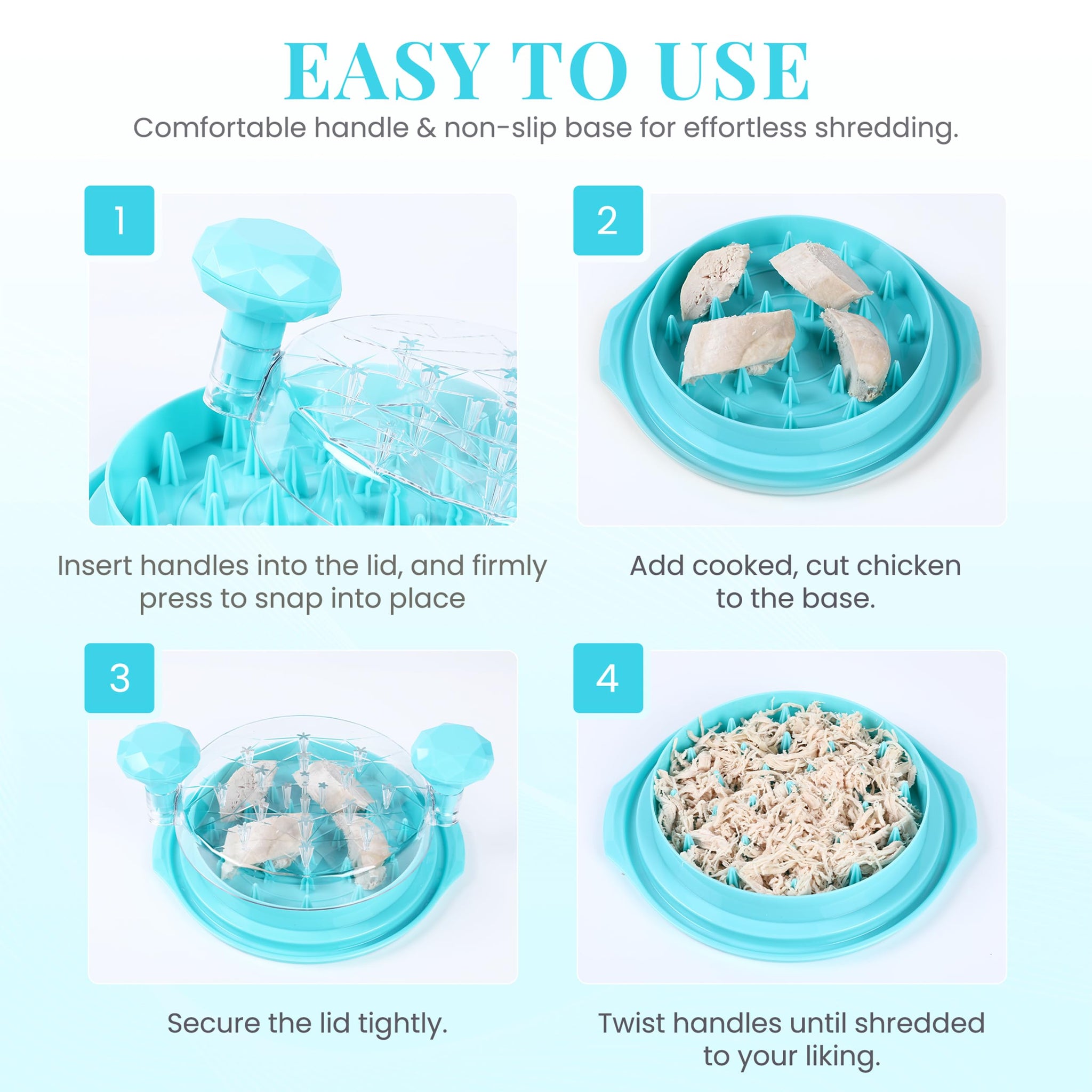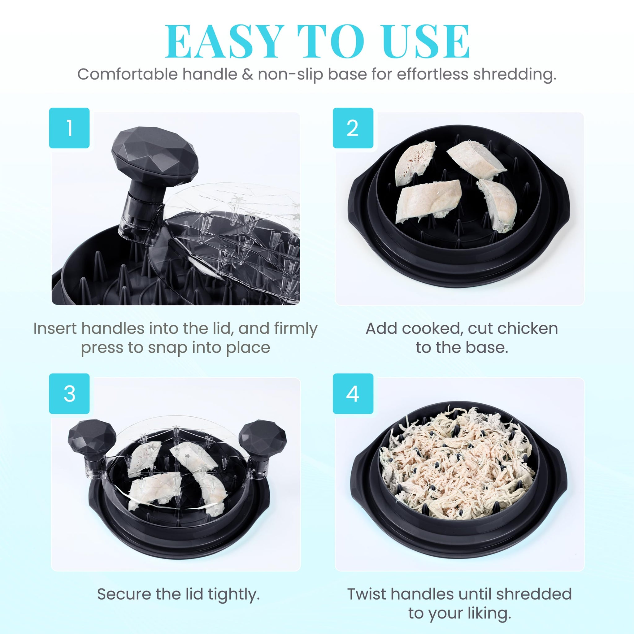 - 🐔🍗【Enhanced 10'' Chicken Shredder】 This upgraded pro chicken shredder is designed with improved inner spikes that are sharper and sturdier for faster, effortless shredding. The anti-slip rubber base keeps the tool steady and secure during use, while the clear lid lets you watch the shredding process so you can achieve the perfect texture every time.