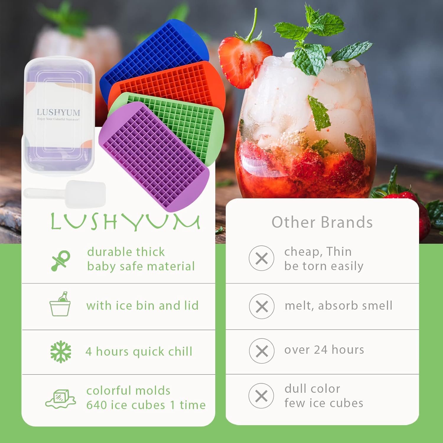 - 🤩 QUICKLY FROZEN MINI ICE CUBE TRAYS - Only takes 4 hours, get 640 mini cubes at a time! Small size for faster freeze. Forget the large ice cubes that need to be frozen for a day, make fast food ice cubes at home with LUSHYUM ICE CUBE TRAYS, tiktok is totally obsessed!