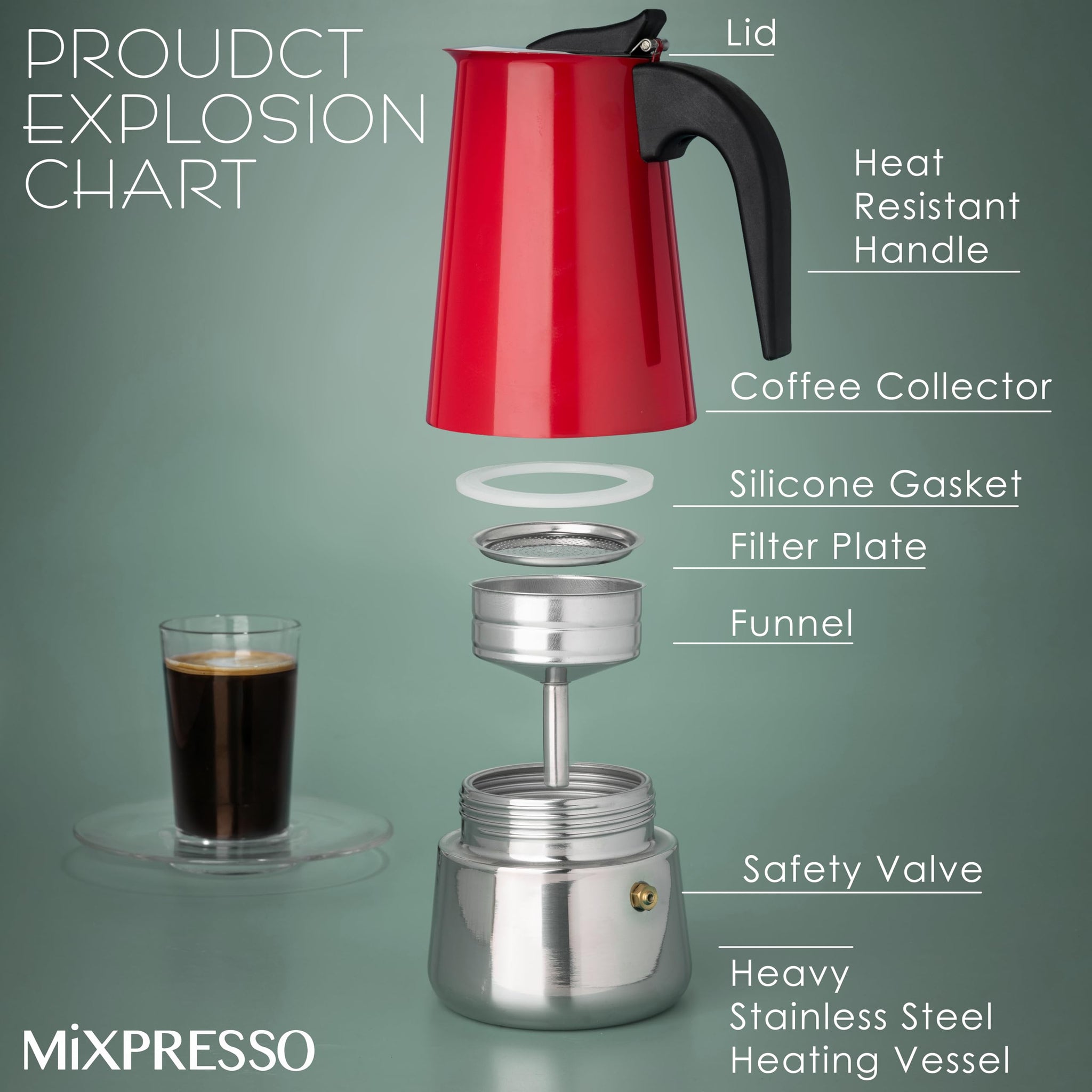 • Customer Support & Gift Idea: Mixpresso mocha pots & stovetop espresso makers are backed by our 1-year warranty for your peace of mind. With its sleek design and daily coffee convenience, this stove moka pot makes a perfect gift for coffee lovers — ideal for holidays, birthdays, housewarmings, or any special occasion.