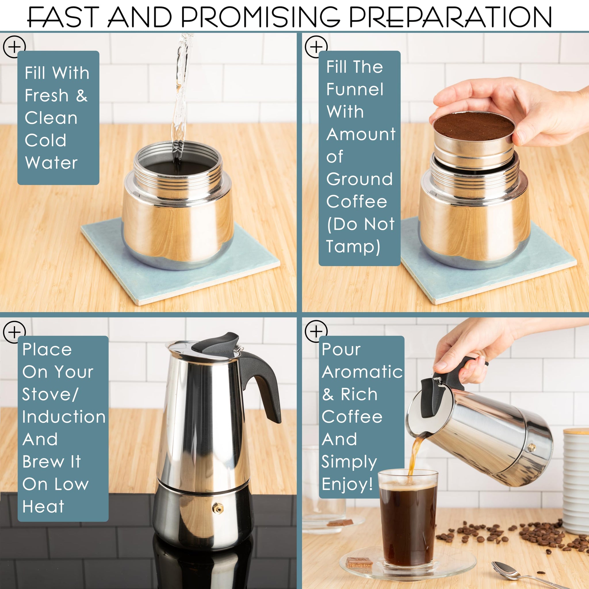 • Easy to Use Espresso Pot: Simply fill the lower chamber with water, add ground coffee to the filter basket, screw on the top, and place the stainless steel espresso pot on your stovetop. In just a few minutes, your rich and aromatic espresso is ready to enjoy — the perfect stovetop coffee maker for daily use. Safety Tip: Always allow the coffee to finish percolating fully before opening the pot. Wait 1–2 minutes after removing from heat for safe handling and to avoid pressure-related spills.