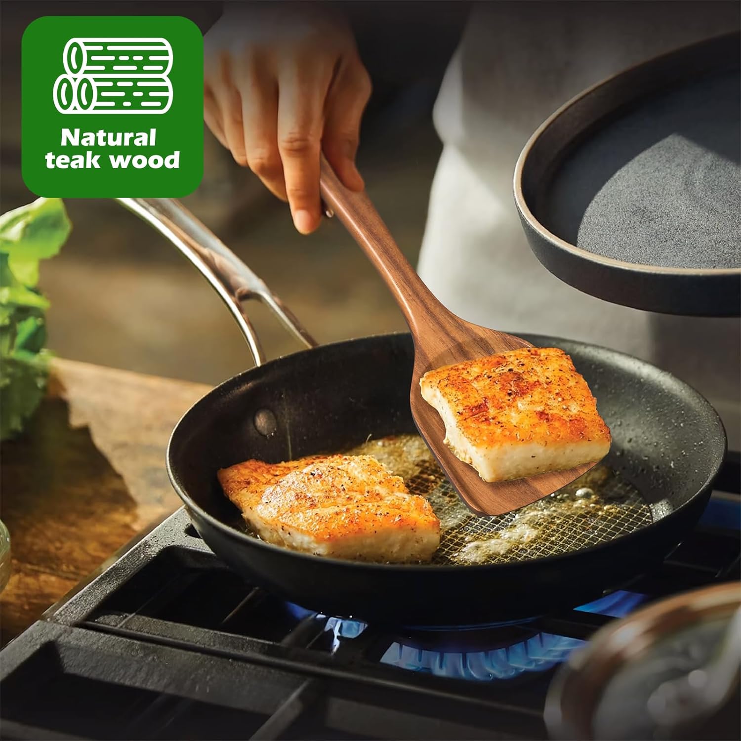 - Healthier & Durable Natural Teak Wooden Utensils: This wood cooking utensils set is Crafted from 100% solid natural teak wood with no glue, toxins, or synthetic coatings, which provides a safer alternative to plastic – ideal for non-stick cookware and high-heat cooking. Teak's dense grain naturally resists cracking, warping, and odors, ensuring long-lasting durability for daily use. These versatile utensils work perfectly with all cookware types, from ceramic to cast iron, combining lasting functionality with natural kitchen elegance