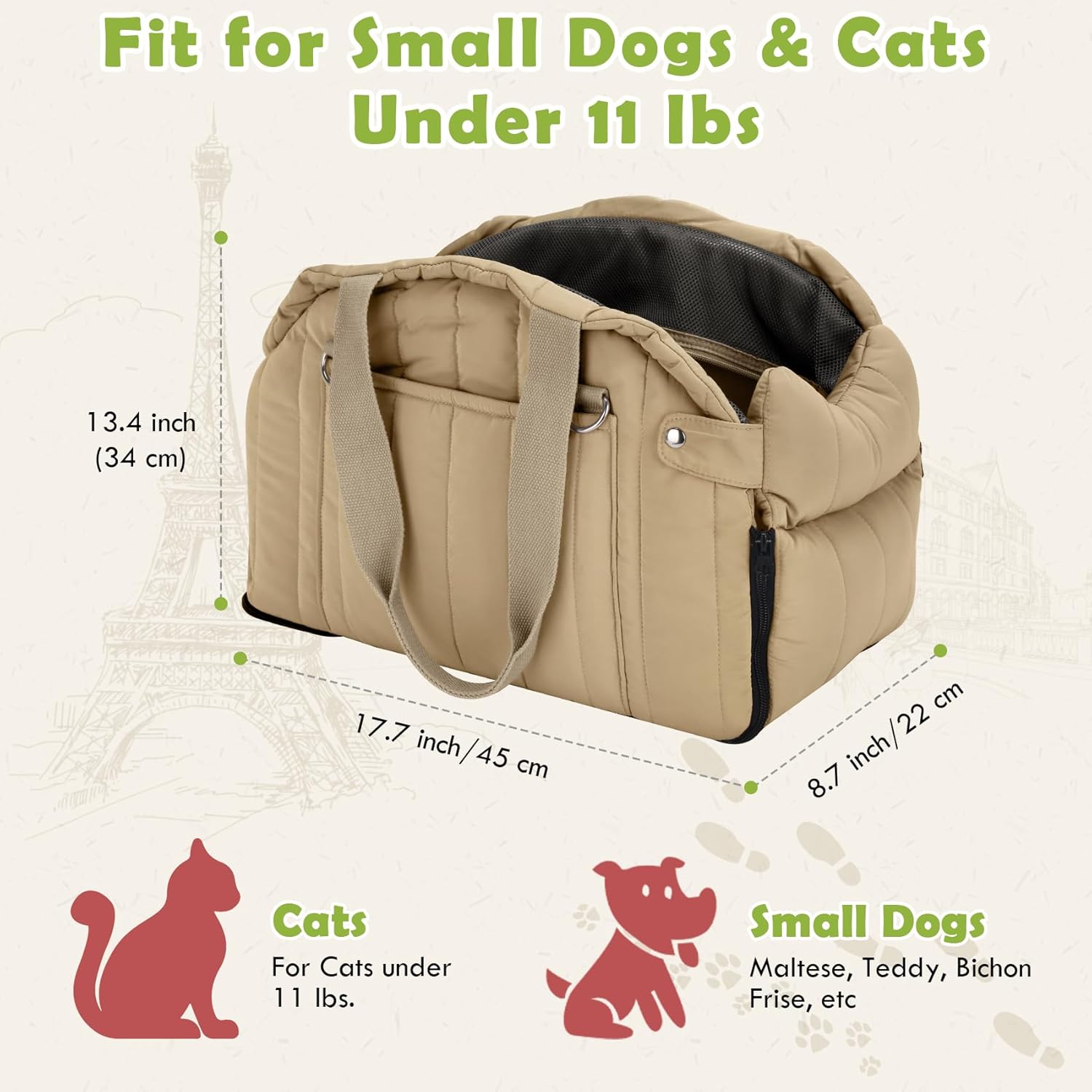 - Pet Car Seat for Puppy or Cat - The console car seat is in size 17.7”L x 8.7”W x 13.4”H, recommended for small dogs and cats under 11 lbs. It's easy to install on the car or just carried by hand or shoulder. It's perfect for taking your pet during a long trip. Built-in soft comfortable pad for all season use, one side is Polyester material, fit for keeping Cool, the other side is lamb-hair material, fit for keeping warm.
